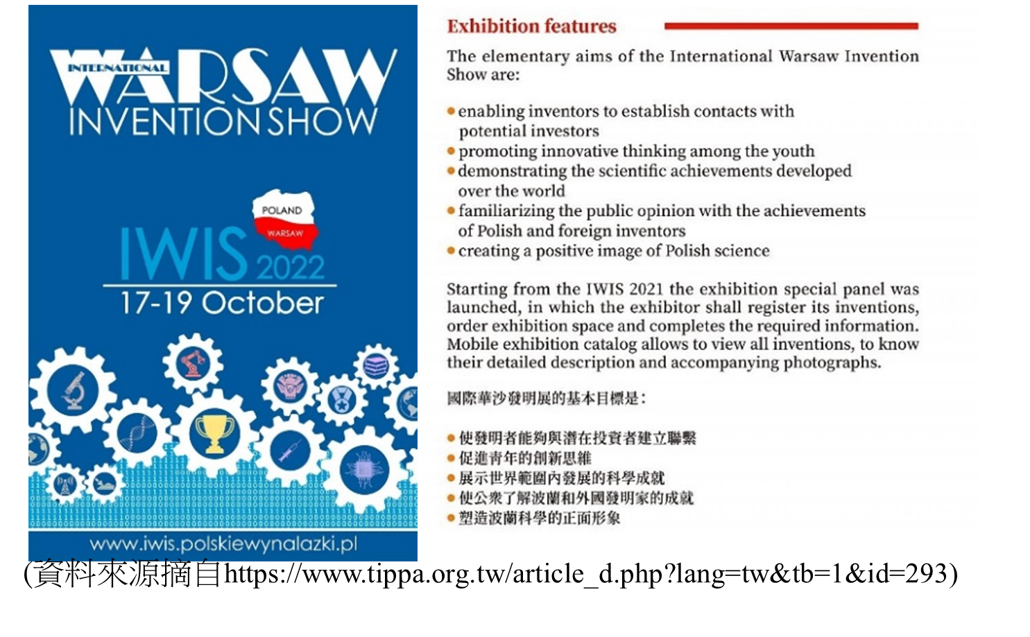 2022第16屆IWIS國際華沙發明展IWIS在波蘭首都華沙舉行,是波蘭最大的創新展覽,也是歐洲最大的創新展覽之一。活動的主辦者是波蘭發明家和理化協會,第一屆展覽於 2006年登場,此後每年由該協會、波蘭總統和波蘭專利局等人的主持下舉辦,自2021年開始,來自亞洲、非洲、美洲和歐洲等國家的代表參加IWIS展示超過400多項發明,提出新技術和創新解決方案。往年國際華沙發明展都舉辦關於知識產權和專利授予的講座和研討會,於展場上歡迎任何年齡的發明家、有興趣投資創新產品和技術的金融機構代表等參觀者,共同了解研究機構、科技大學和創新企業的成果。在持續受COVID-19疫情影響下,今年於10月17-19日在華沙理工大學 (Main Auditorium of Warsaw University Technology) 採線上競賽,獲獎204件名單中,臺灣共獲得34金8銀的佳績。