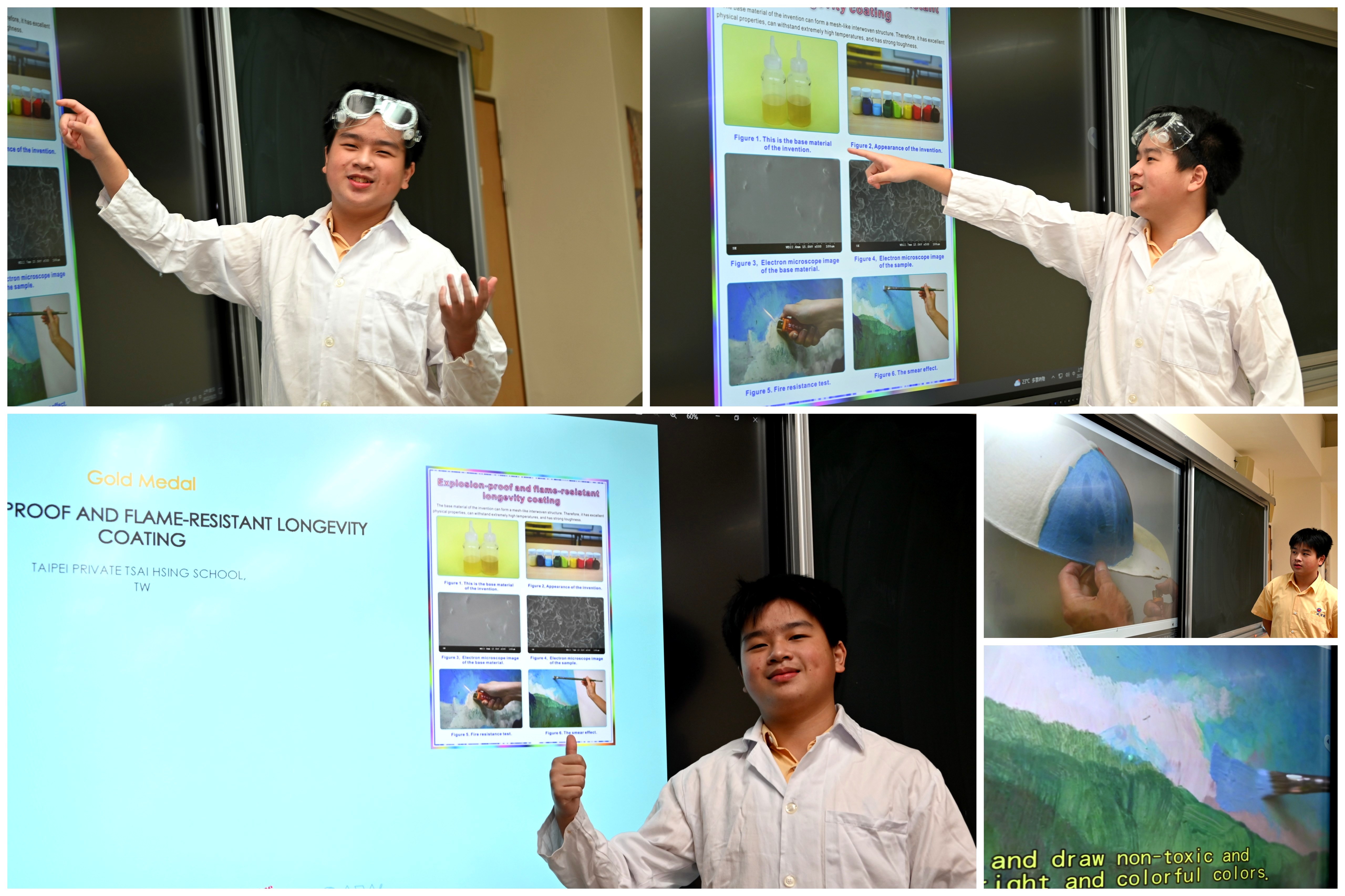 本校高一智班張倢叡在張丕白教授的指導及家人支持下,研發了一年的時間,以作品「Explosion-Proof and Flame-Resistant Longevity Coating」榮獲金牌。最初的發想來自於看見巴黎聖母院遭祝融引起古蹟的毀損,以及他本身對美術畫作的喜歡下,不禁想到:如果能有防火防爆的美術材料或油漆來作畫或在物品外層鍍層保護,就能讓雋永的畫作與古蹟留存……當倢叡有此發想後,立即投入研究,在混合出基底無色透明顏料後,他沒有就此停下,緊接著研究如何加入色彩的變化,變成真正能painting的顏料;而色素的取得又燃起他的另一個想法,如果能從大自然取得色彩,這樣的組合更能讓完成的作品或建物適存於大自然的環境下呢……一連串的點子串在一起,倢叡花了一年的研究,終於做出這個『防爆耐燃長壽塗料』創新的發明主要是促使生活環境更美好,期許倢叡持續將他的發想轉為更多造福人類生活的實際應用An idea invented to make life better。(獲獎研究的影片介紹:連結)