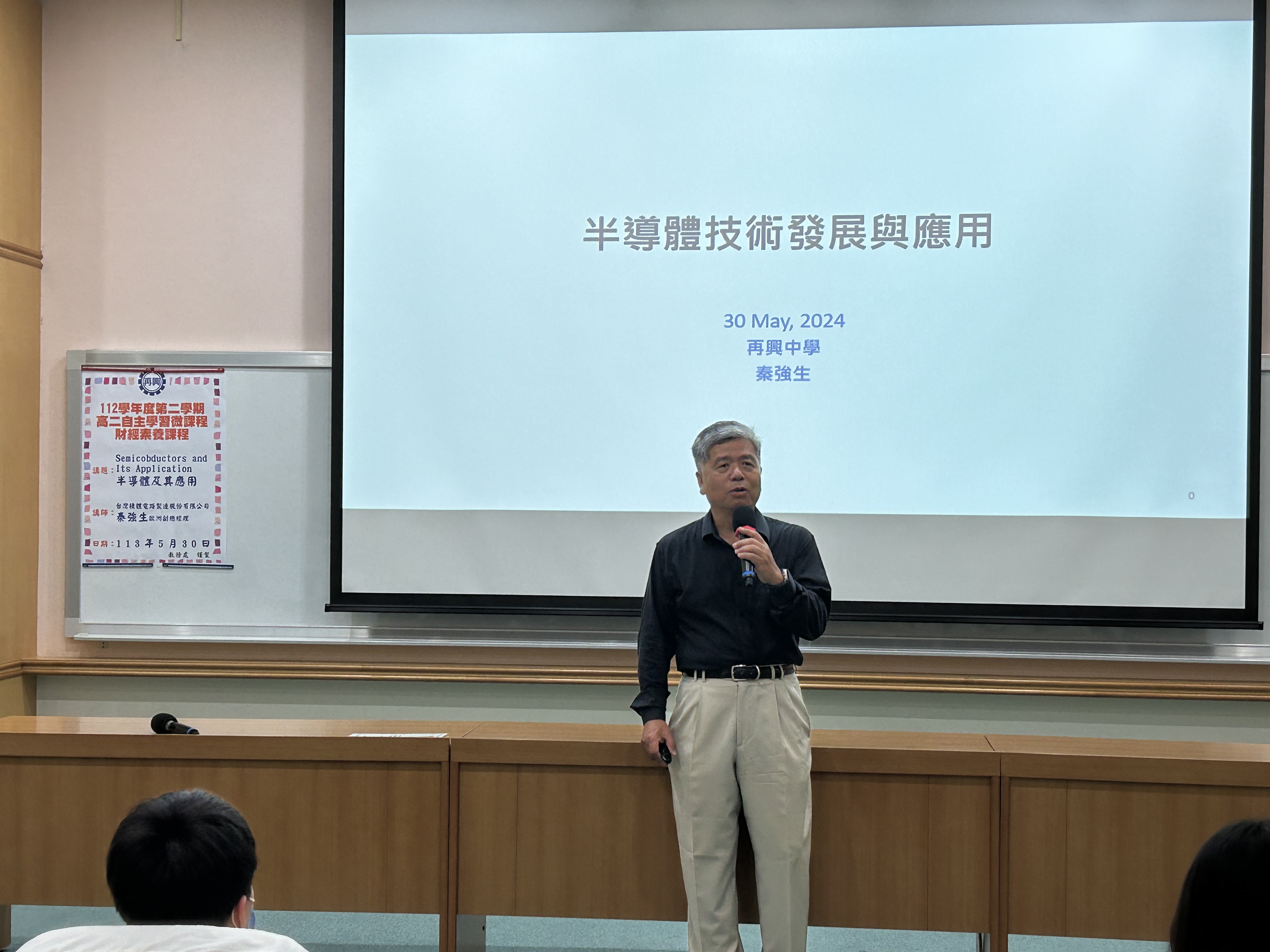 中學部於5月31日邀請到台積電歐洲 - 技術支援和市場推廣副總裁秦強生學長,返校進行財經素養講座,介紹半導體目前的應用及發展。