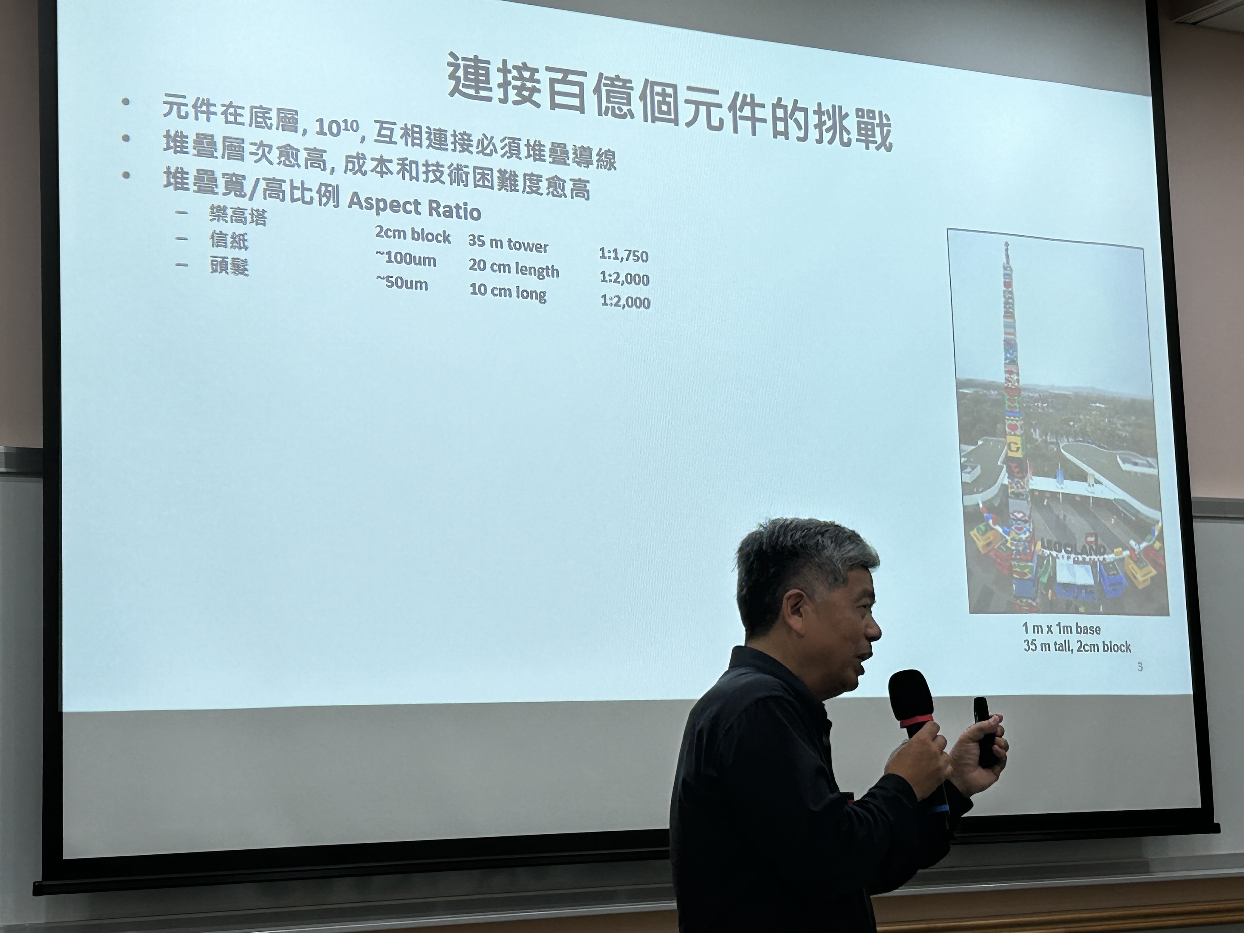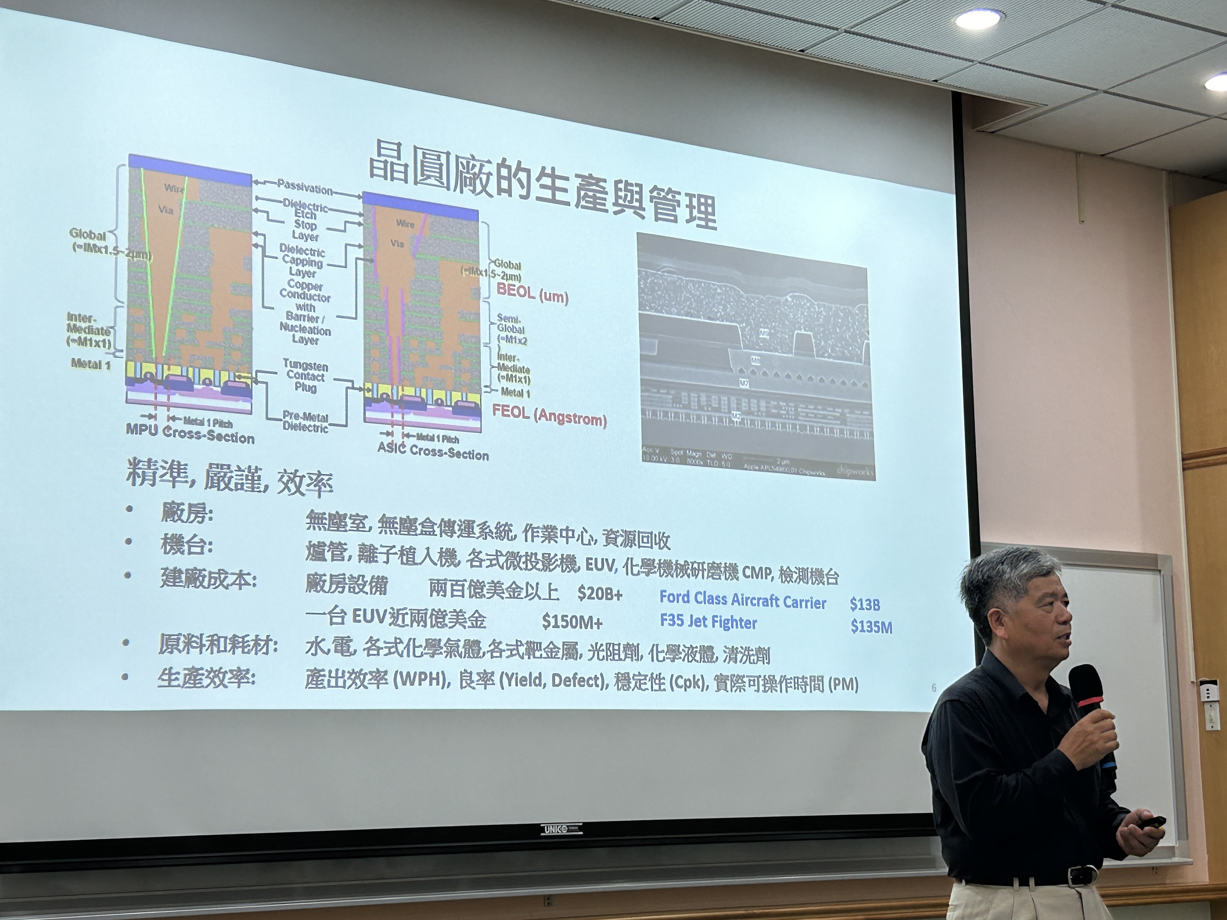 第一張簡報,學長便使用「日期寫法的差異」來告訴我們: “Open minded.”接下來,學長進行了簡單的半導體介紹,並由目前業界追求的目標:更小,進入晶片及積體電路的發展、製造和限制等子題。後續講述晶圓廠的生產及管理、半導體產業演進、半導體應用的演變及對其他產業的影響,其中學長提到,對數字敏感,可以幫助人生的規劃,所以過程中運用了不同建設價錢的比較及人腦細胞數和晶片電晶體數量的比較;而未來,AI學習則會是非常重要的環節,更是產業發展的重要科技。