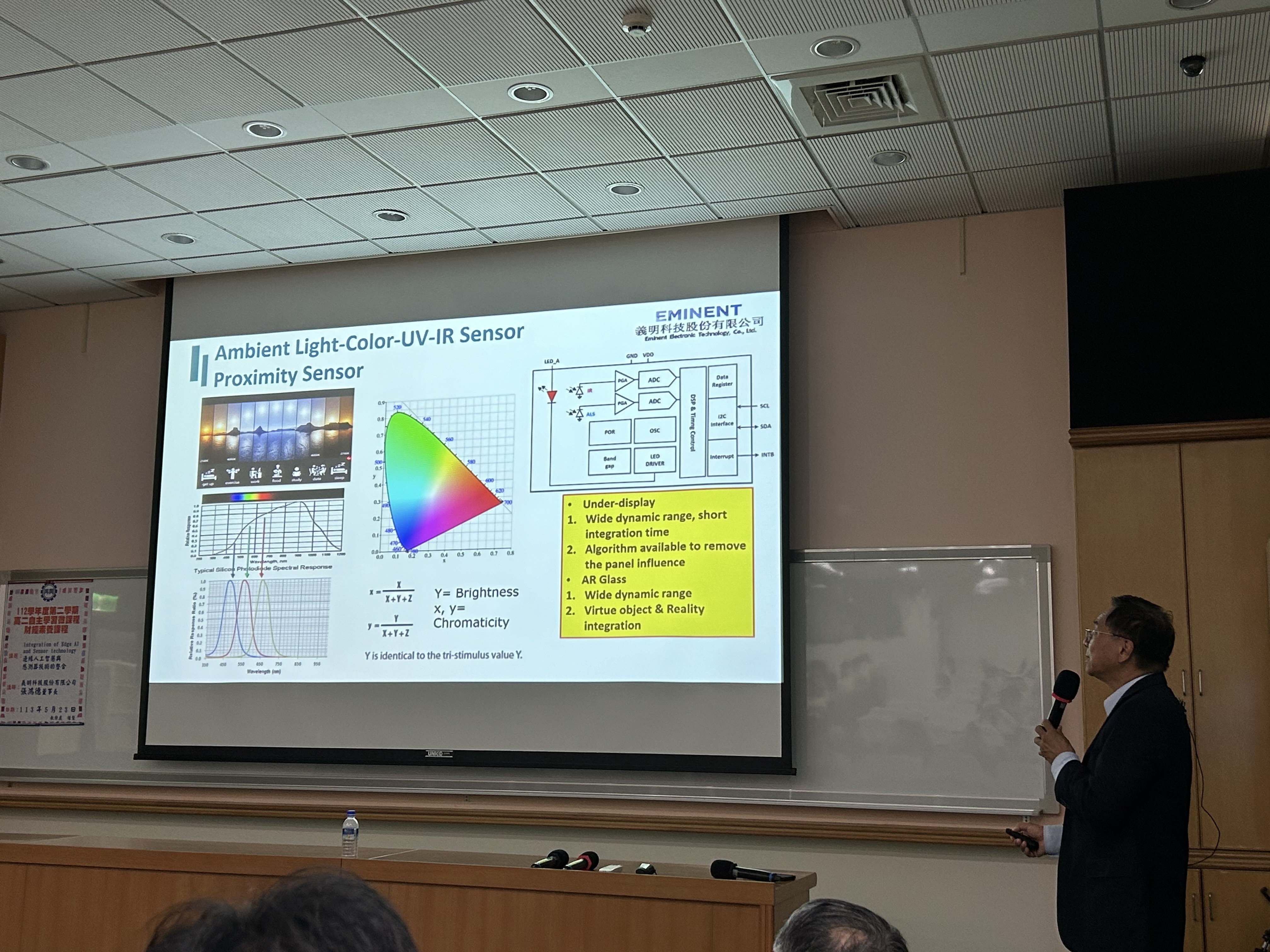 第一部分學長先介紹了義明科技的合作公司,包括台積電與聯電,而客戶包含三星、微軟和高通等世界各大公司。並介紹其公司生產的感測器應用於居家、載具、PC與穿戴式裝置等,包含飛行時間距離TOF與人員出現感測器。也說明其感測器傳送到主晶片的過程與偵測電磁波的波段差別:除了常見的可見光400-700奈米以外,1300-1400奈米的波段可以應用在皮膚感測器,大眾所使用的Air Pods 3就有應用到此技術。