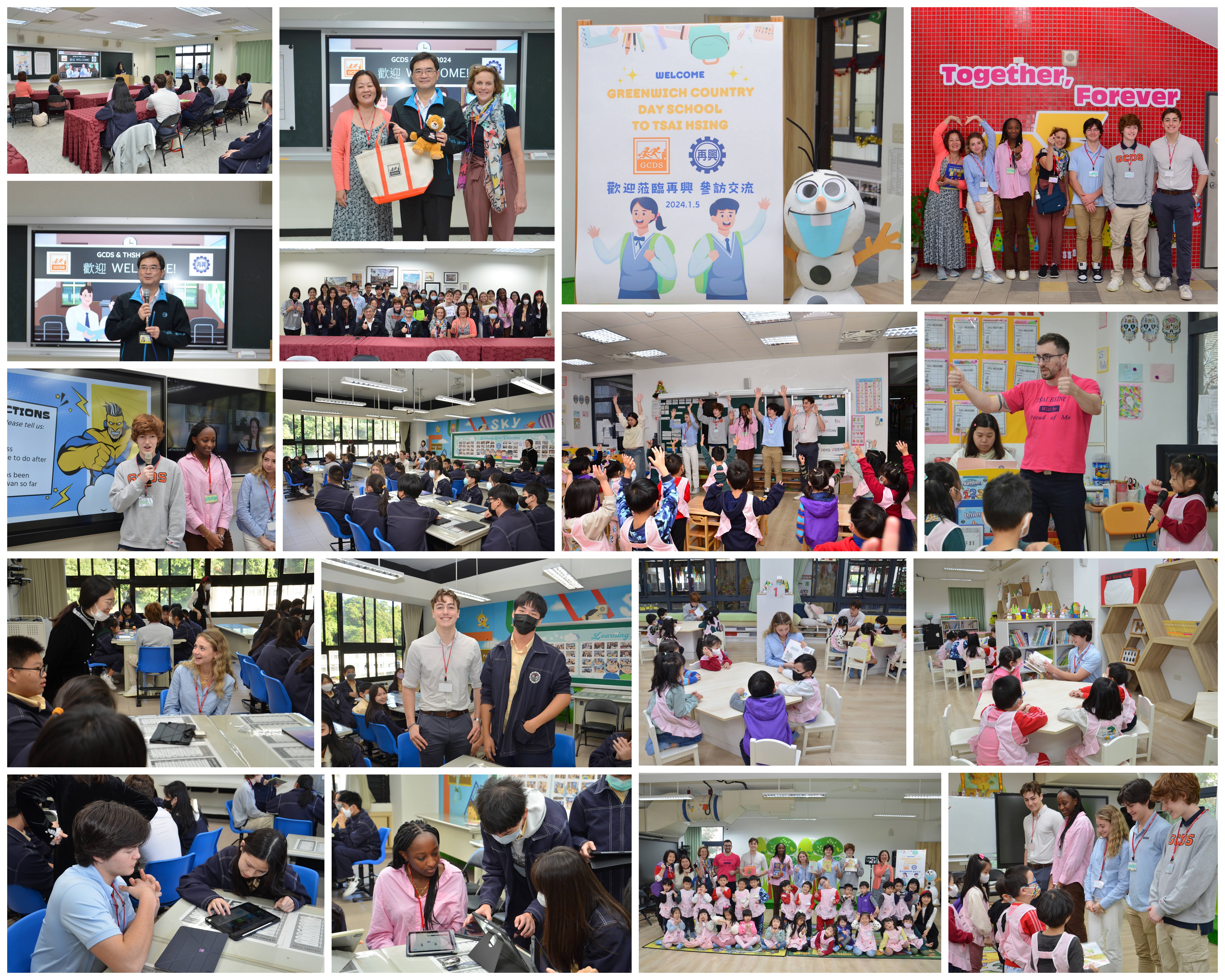 本校於113年1月5日接待來自美國康乃狄克州的Greenwich Country Day School(GCDS)師生,由Ms. Jane Graham 與Ms. Vicky Huang帶領中文班的五位高中生,進行全日的課程體驗活動。活動當天,由李秉容主任率領Buddies Without Borders(BWB)社團成員持歡迎牌迎接,大家初次見面的興奮之情都展露無遺。隨後,由柯文柔校長、張東勇副校長為這場溫馨隆重的歡迎會揭開序幕,柯校長表示相當樂見這場校際文化交流活動,希望學生們可以從彼此身上學習,打開視野與格局。在雙方致贈學校紀念品後,大家在歡笑聲中留下珍貴的合影,正式展開一整天的交流活動。