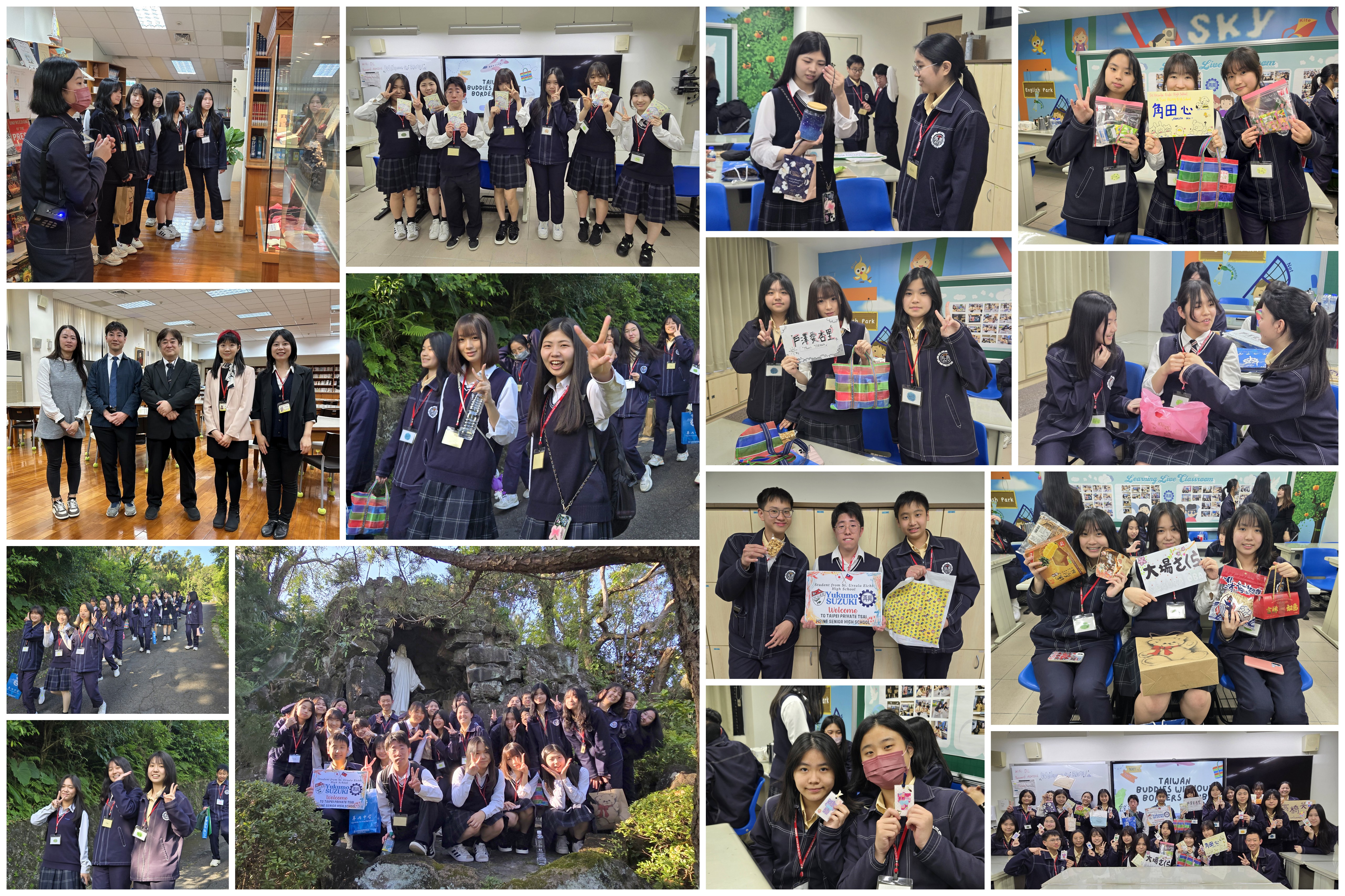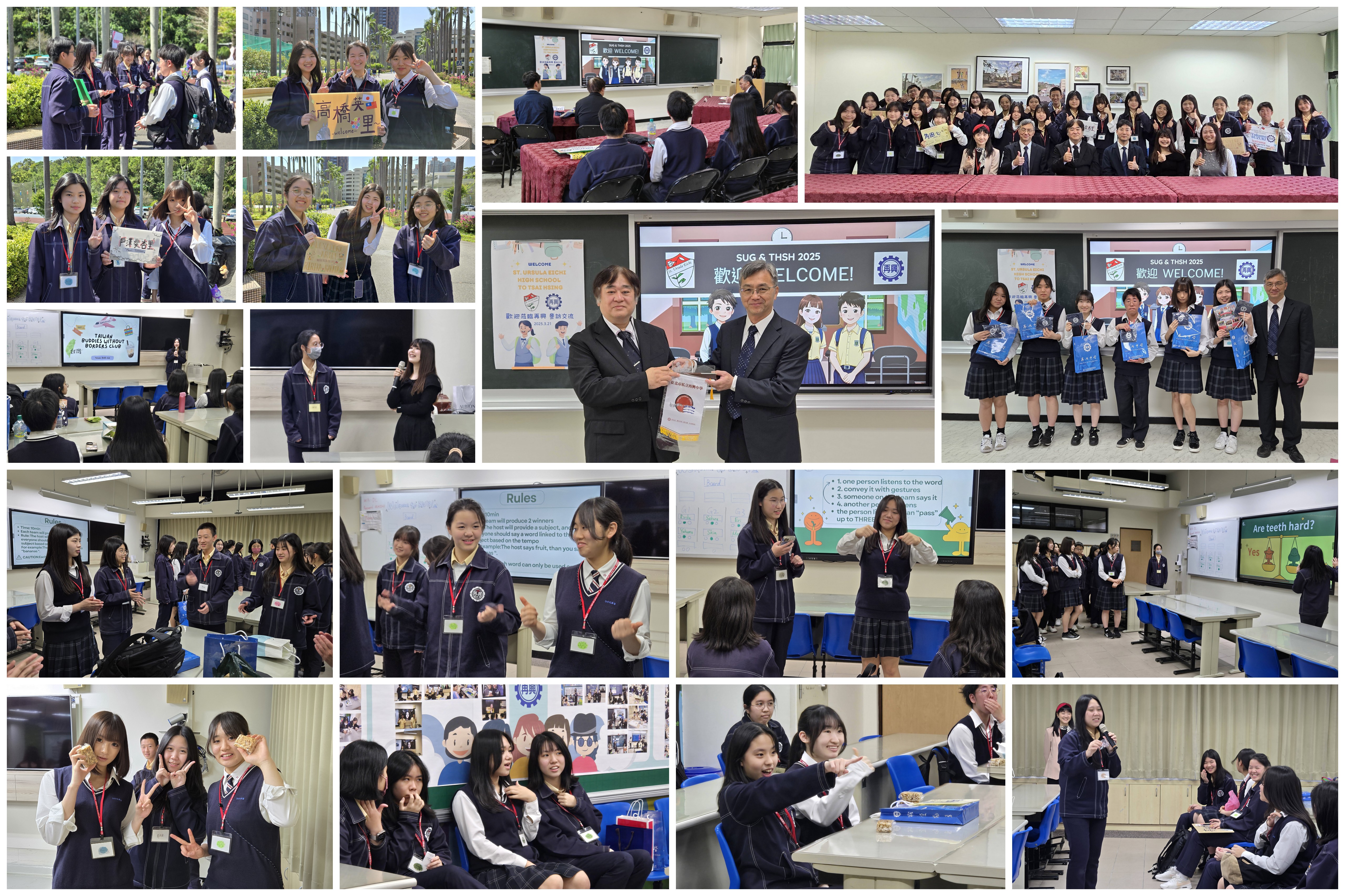 文化交流~114-0321日本英智中學蒞校參訪 本校於114年3月21日接待來自日本仙台市聖吳甦樂英智中學的師生,由後藤健一副校長與高野翔太老師帶領六位高中生,進行半日的體驗活動。活動當天,由李秉容主任、鄒靜芬老師率領Buddies Without Borders(BWB)社團成員持歡迎牌,至校門口熱情迎接遠道而來的貴賓,雙方初次見面,興奮與喜悅溢於言表。 隨後於知新三樓會議室舉行溫馨隆重的歡迎會,首先播訪兩校簡介影片,並由張東勇副校長與後藤健一副校長致詞,兩位長官均表示相當樂見這場校際文化交流活動,希望學生們彼此切磋學習,打開國際視野與格局。致詞後,雙方互贈學校精美紀念品,張東勇副校長更貼心地為英智學生準備了再興小書包,象徵彼此的交流情誼,最後,大家一起留下珍貴的合影,正式為這場難忘的交流活動揭開序幕。 最後,由BWB負責學生詳細導覽校園,帶領大家依序參觀圖書館、地下室多功能球場與後山清心園,展現出專業導遊風範。沿途大家談笑風生,氣氛輕鬆愉悅。當隊伍走回椰林大道時,離別的情緒悄然升起,彼此依依不捨地合影留念,交換聯絡方式,期盼未來能再度相聚。這場難忘的國際交流活動,在滿滿的歡樂與溫暖的情誼中圓滿落幕。