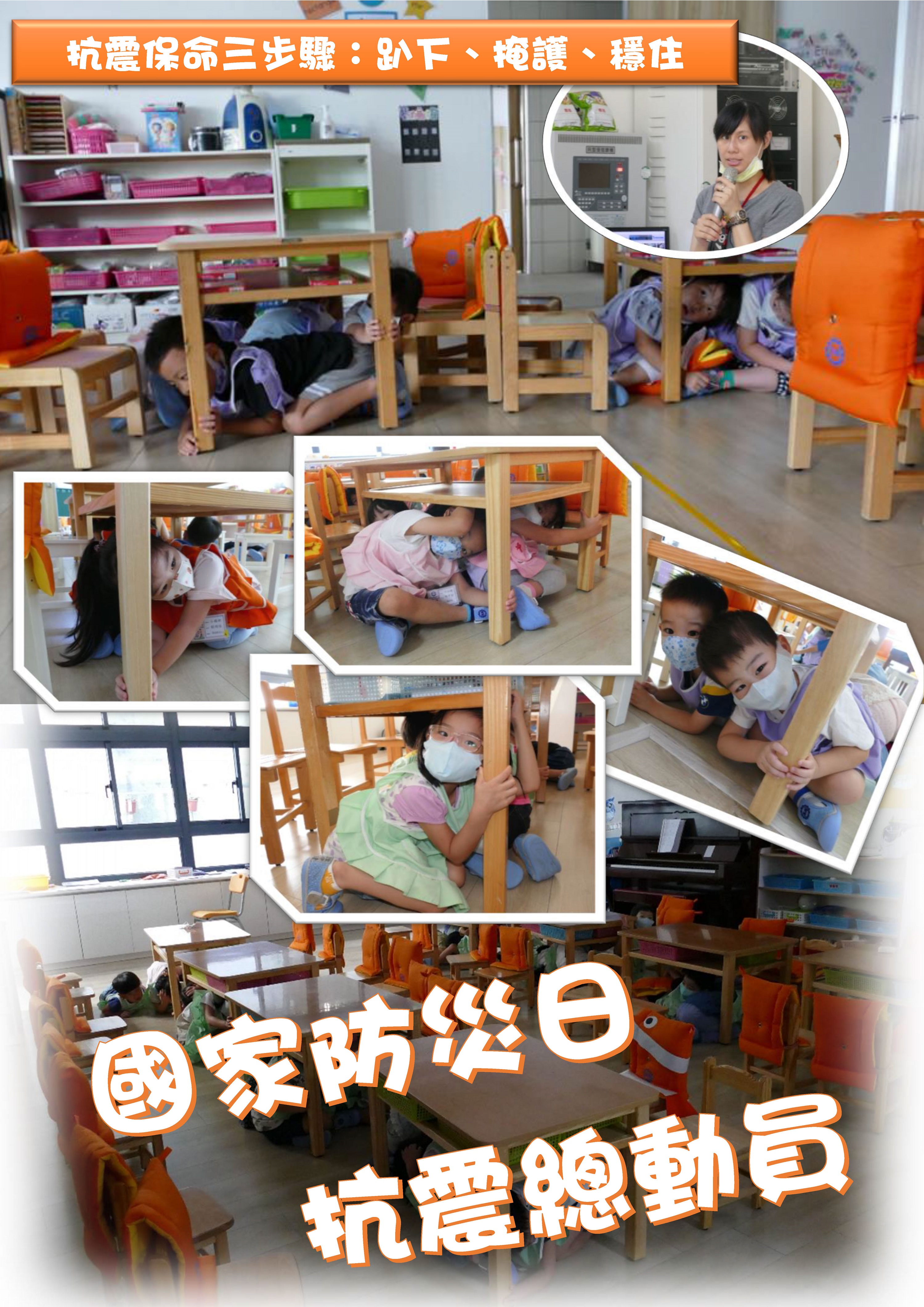 921是國家防災日,為了提升幼兒在地震來臨時的應變能力,幼兒園在9月21日上午舉辦「地震避難演練」,請全園師生一起演練抗震保命3步驟「趴下、掩護、穩住」,模擬發生地震時如何鎮定疏散,保護自己的安全。
