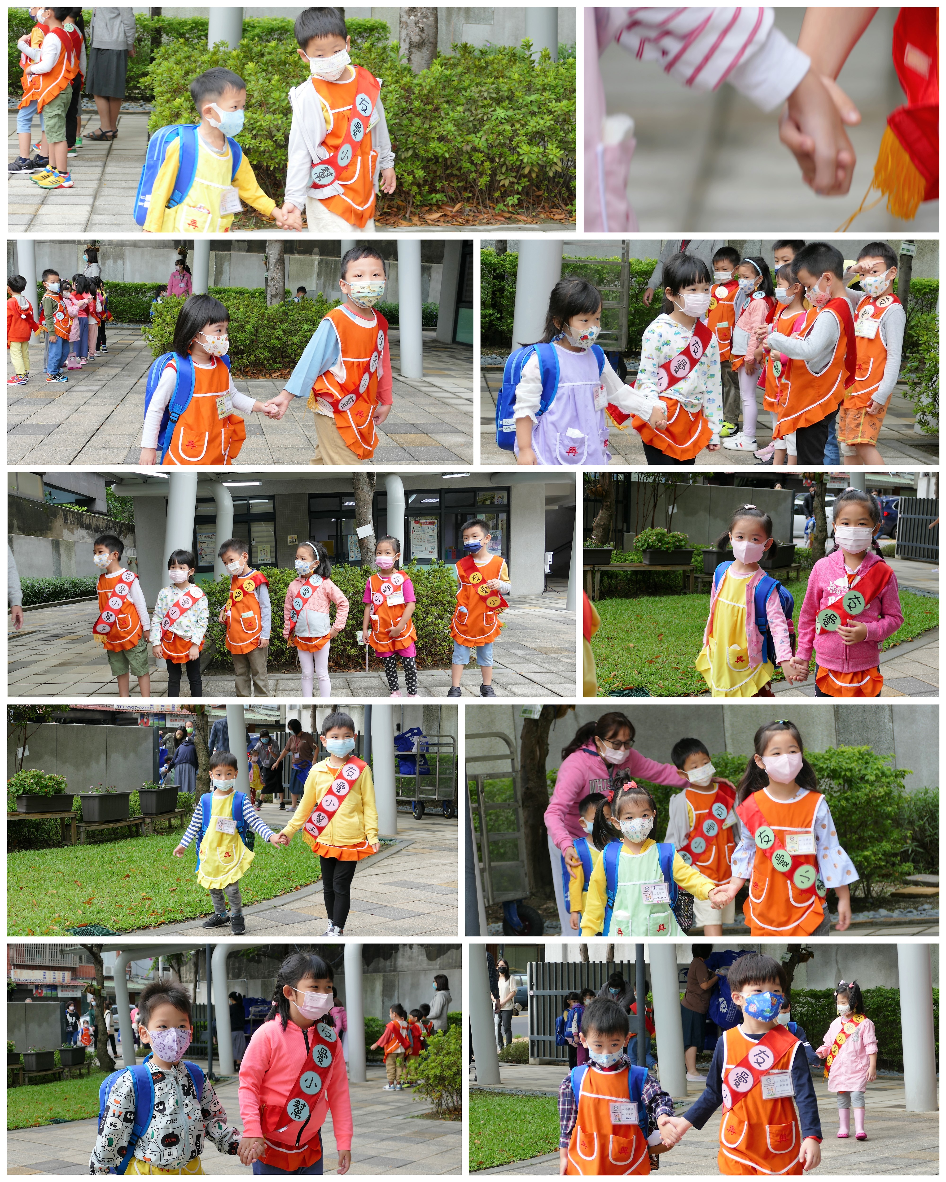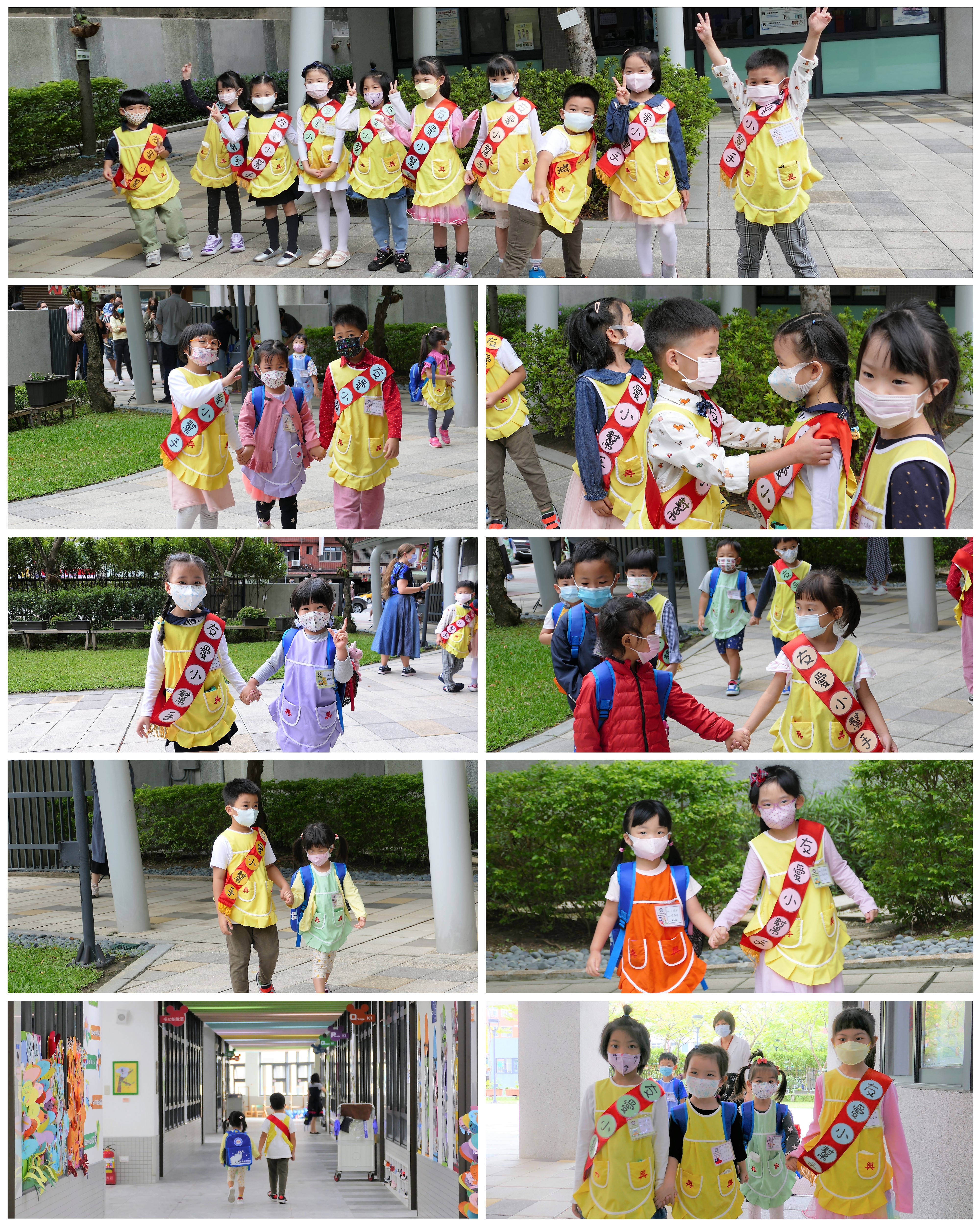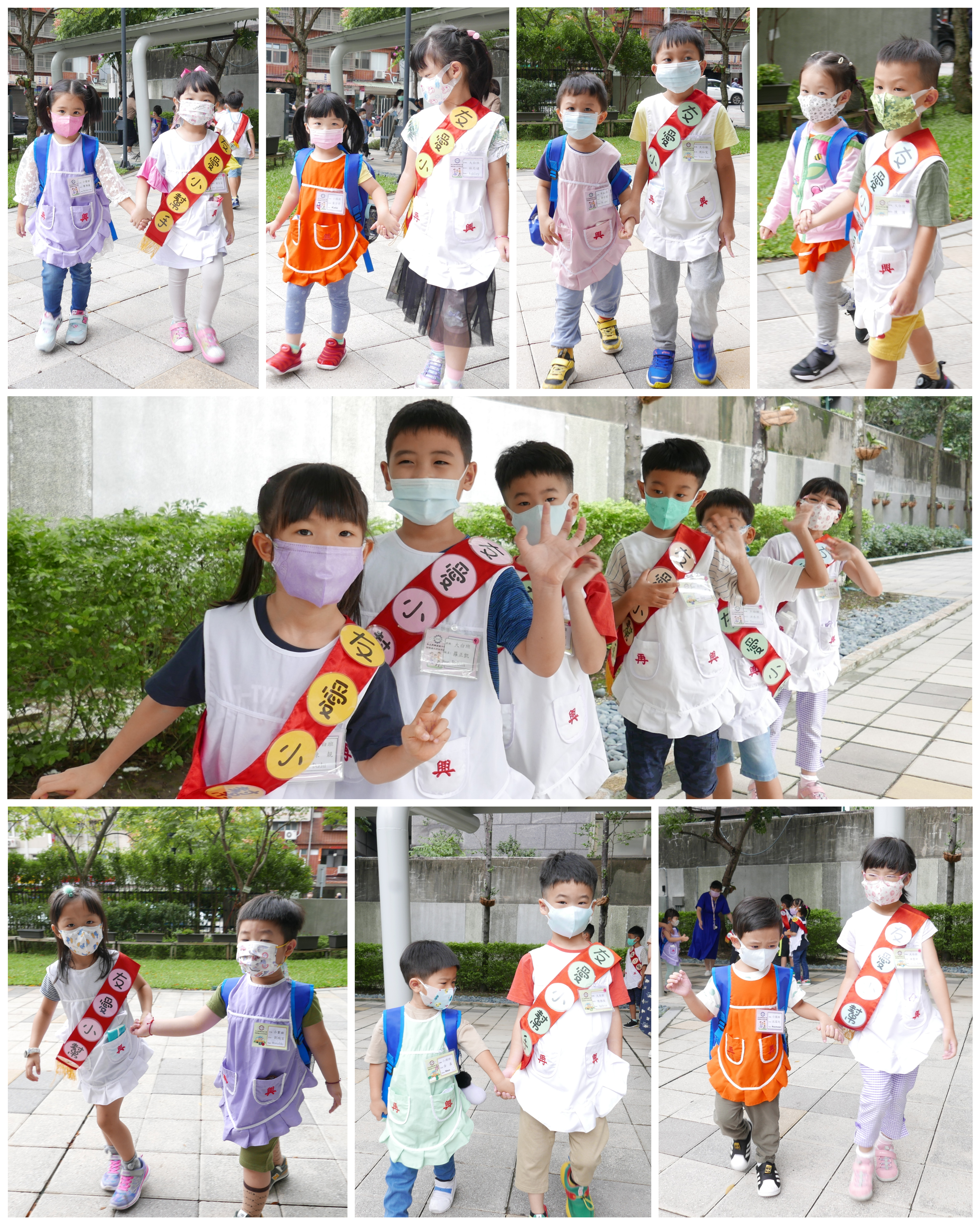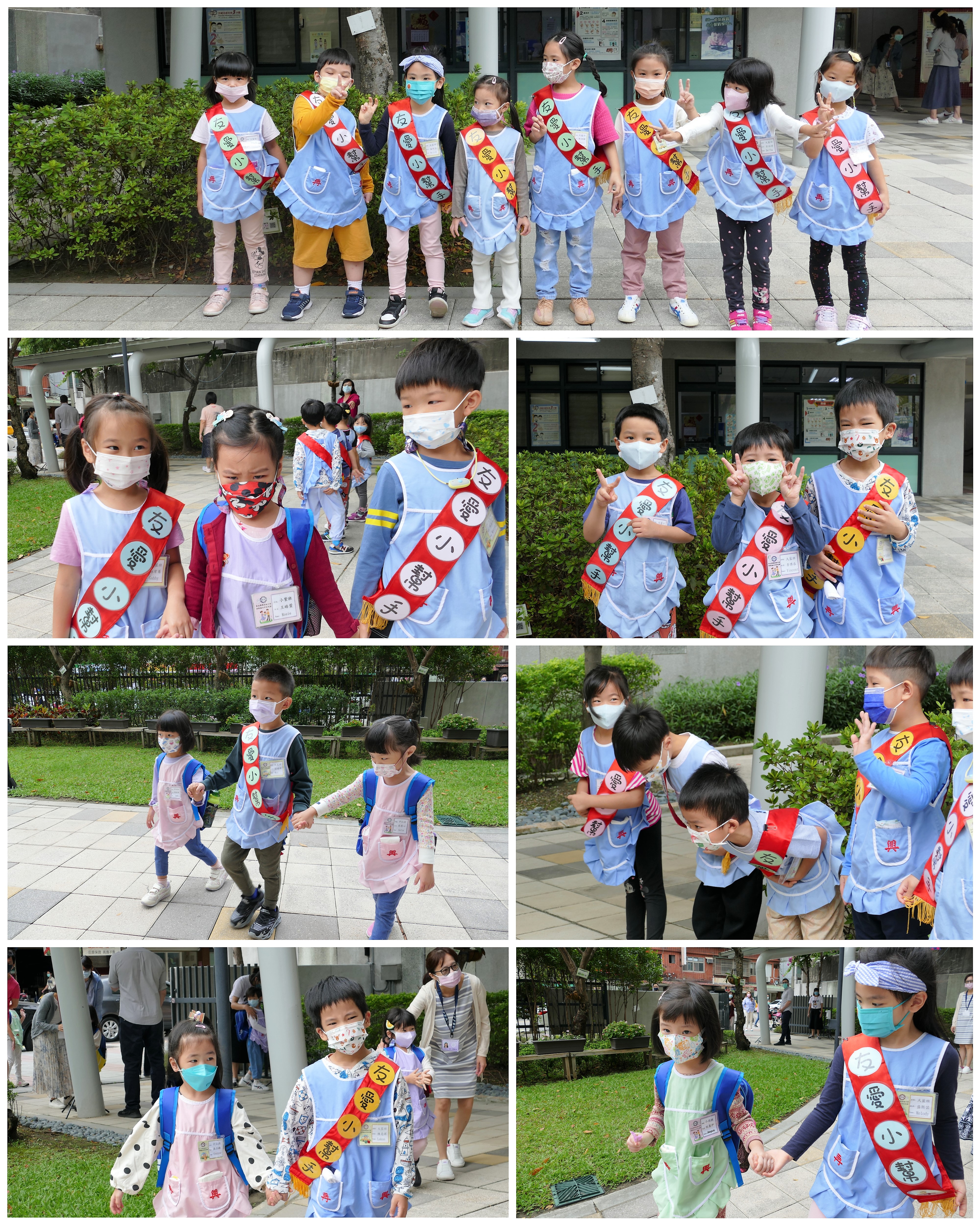 大班的哥哥、姊姊們早晨於校門迎接中、小班的弟弟與妹妹,溫暖地牽著弟、妹走進教室,全園一起大手牽小手,實踐再興校訓:誠、愛、勤、勇。