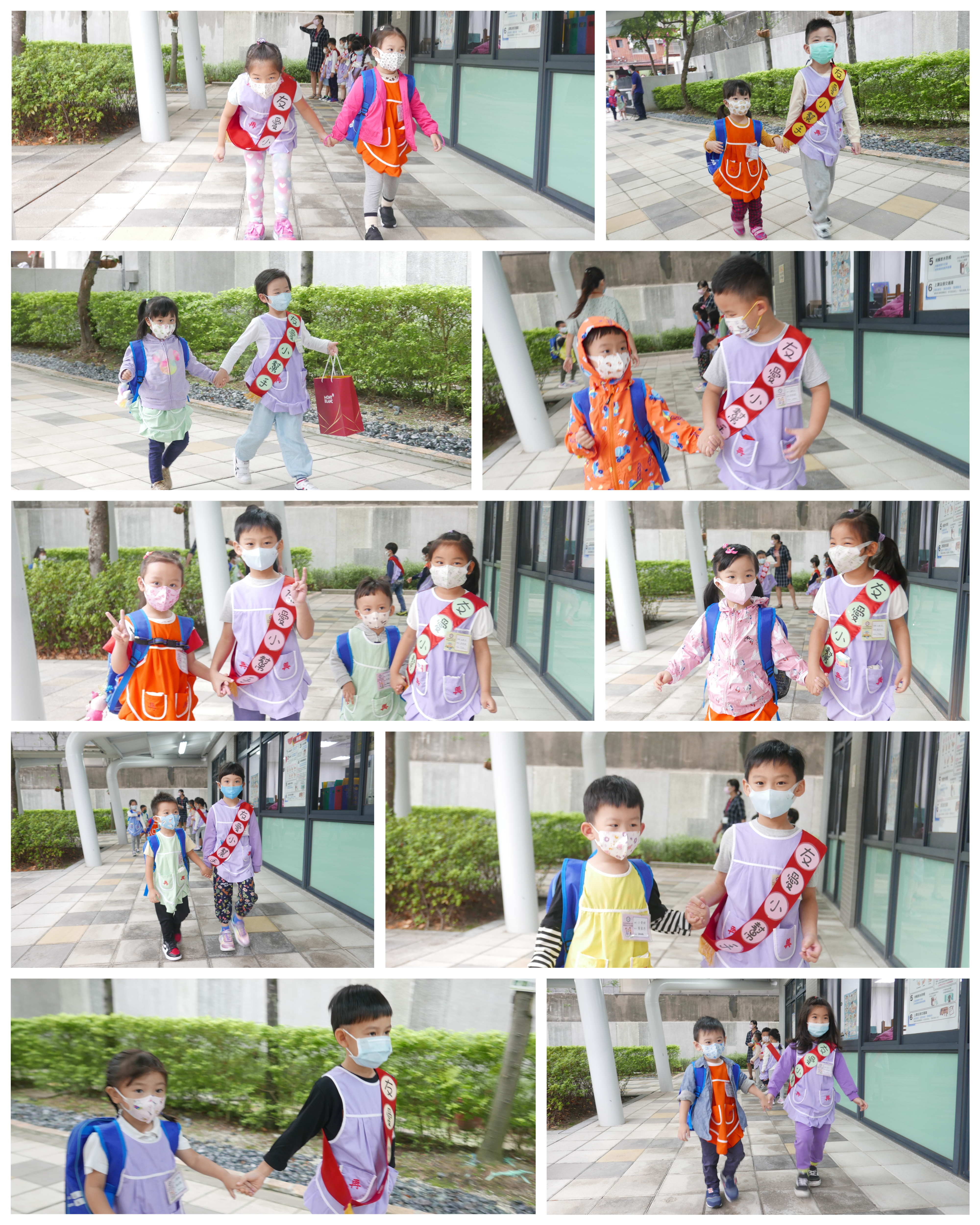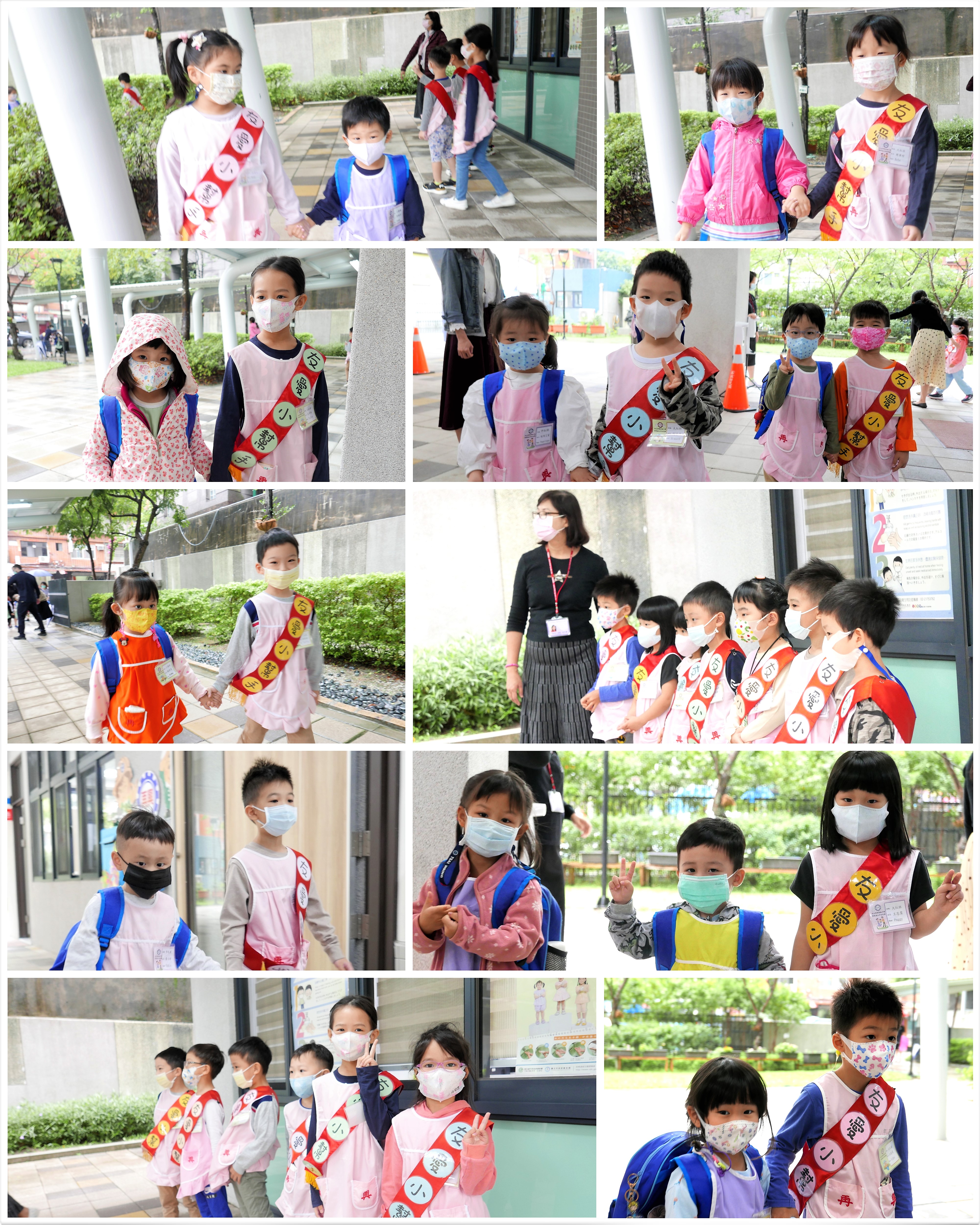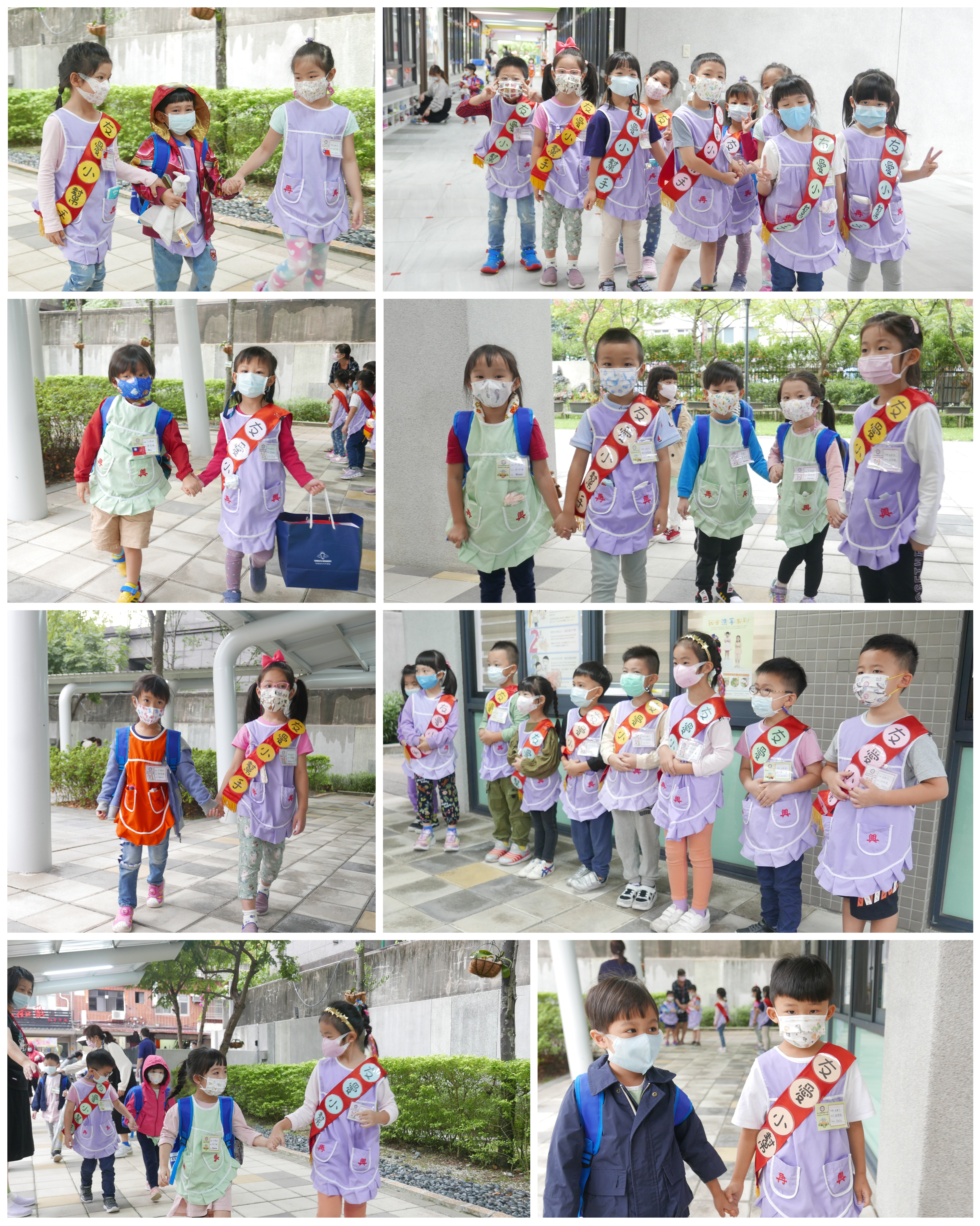 大班的哥哥、姊姊們早晨於校門迎接中、小班的弟弟與妹妹,溫暖地牽著弟、妹走進教室,全園一起大手牽小手,實踐再興校訓:誠、愛、勤、勇。