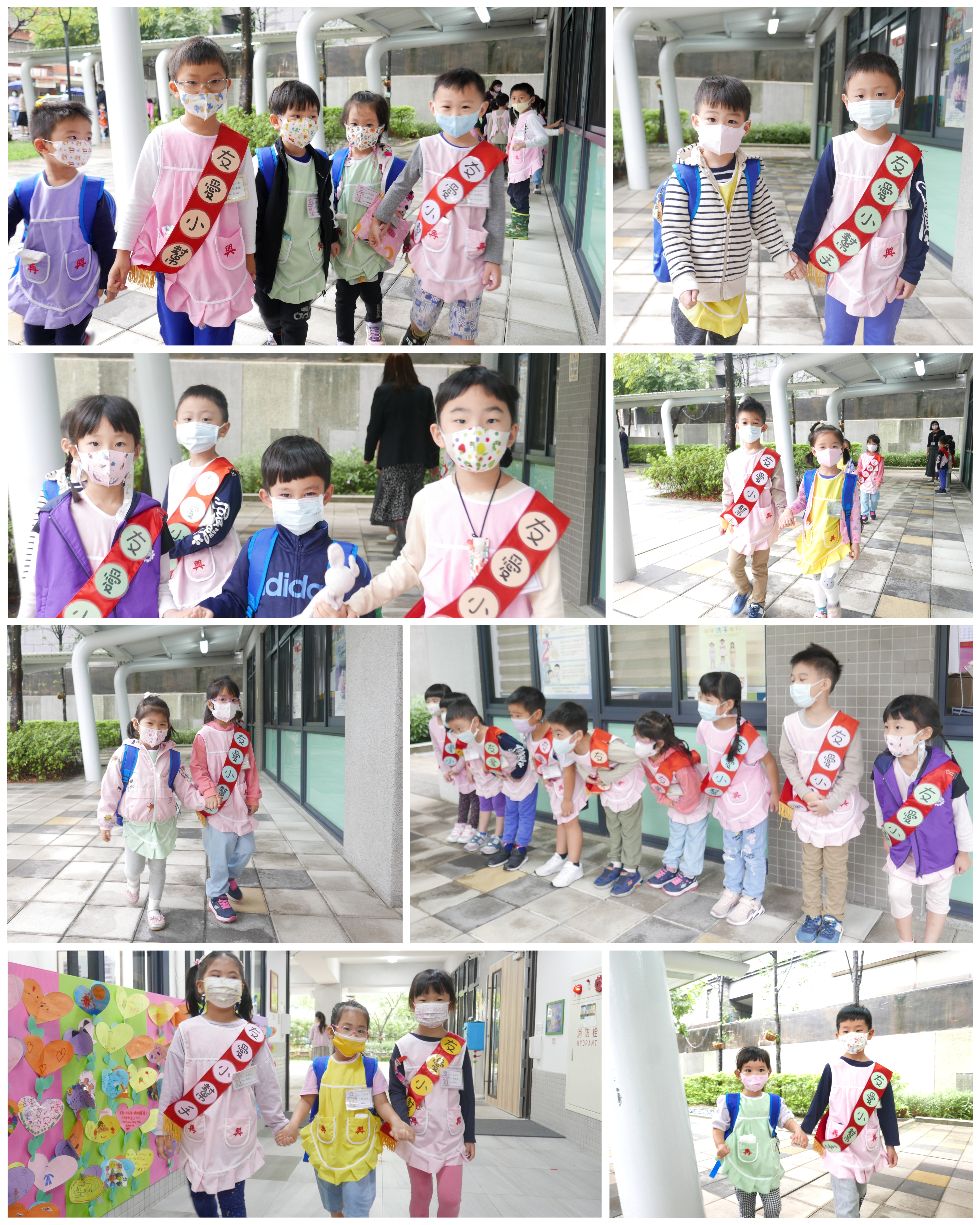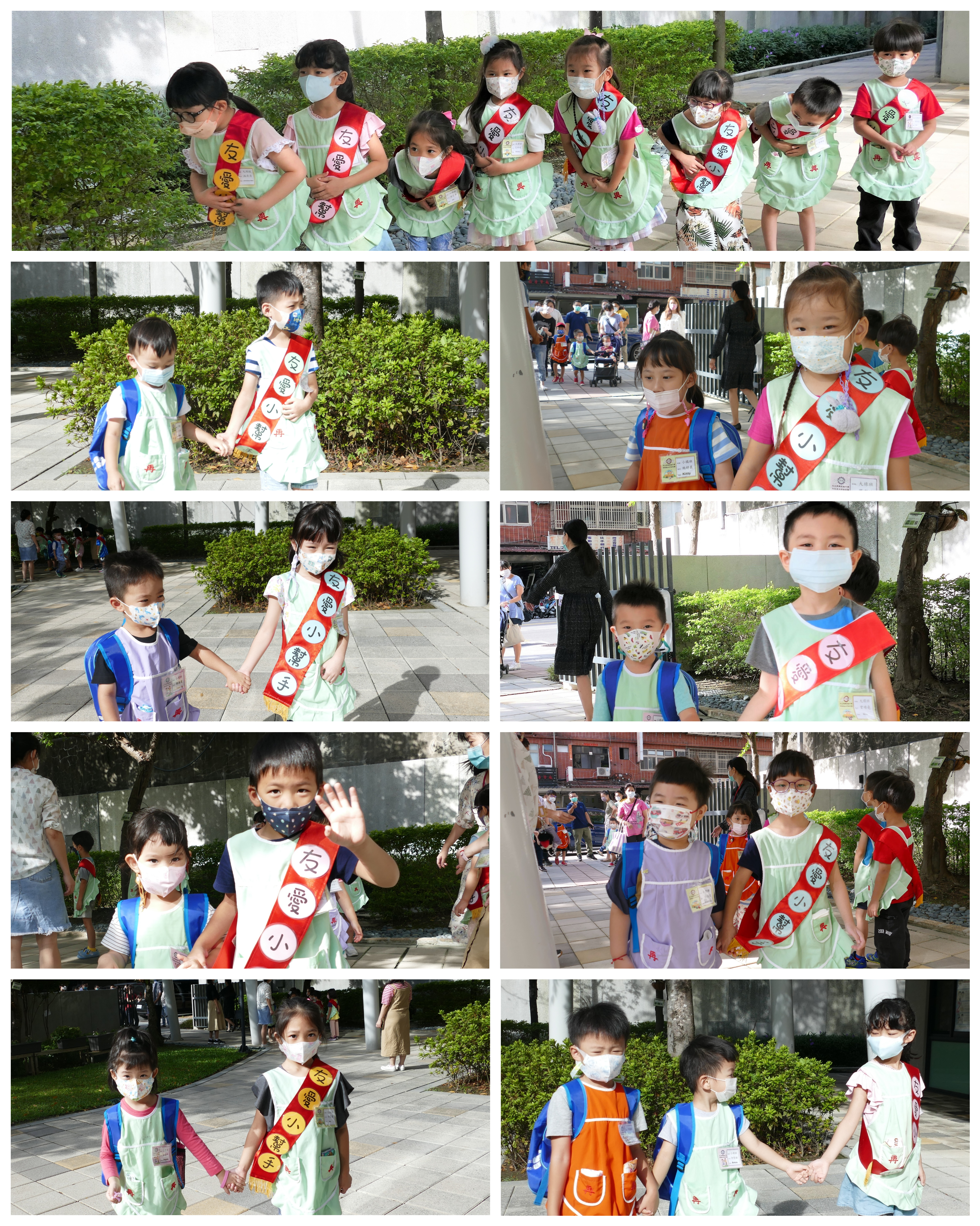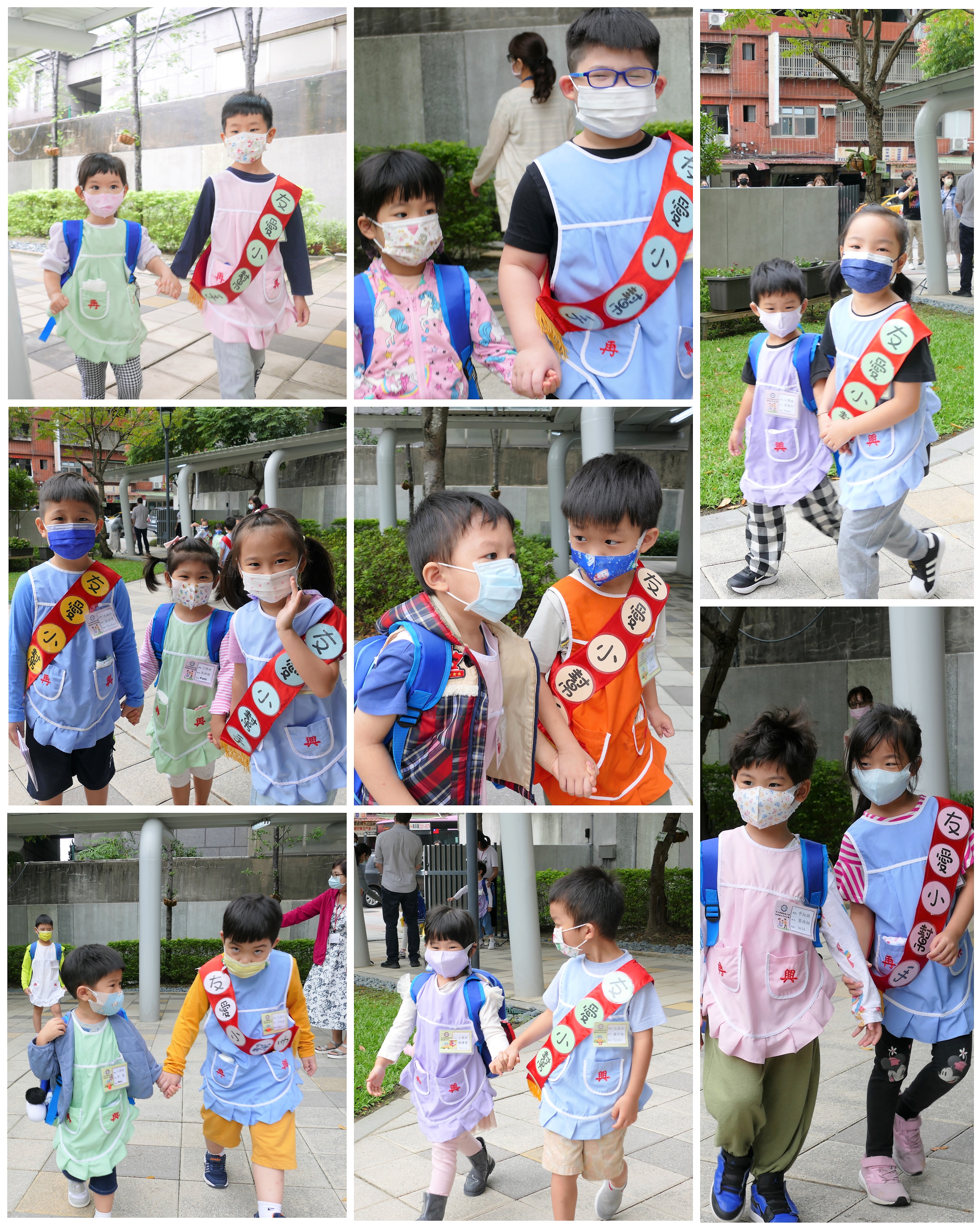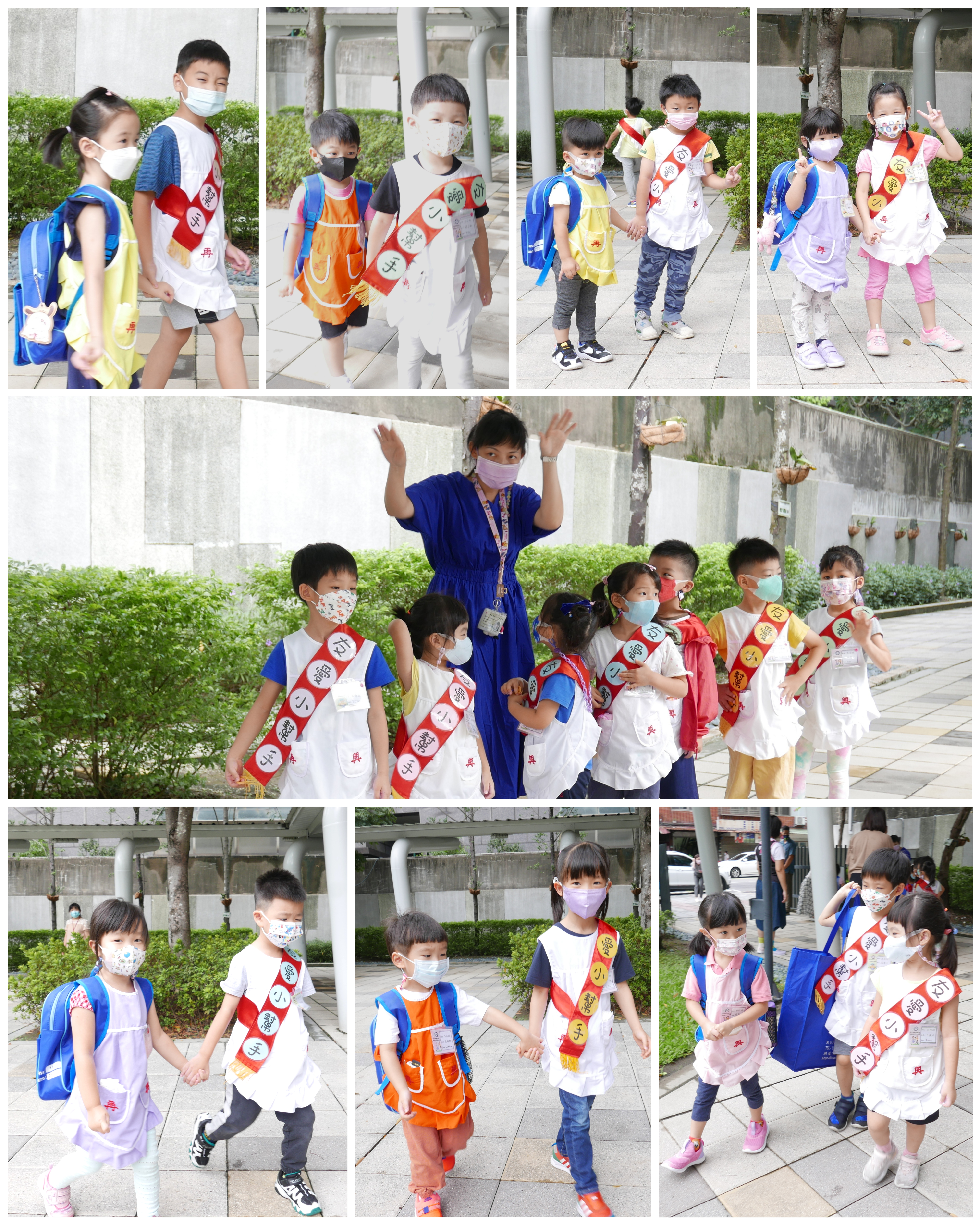 大班的哥哥、姊姊們早晨於校門迎接中、小班的弟弟與妹妹,溫暖地牽著弟、妹走進教室,全園一起大手牽小手,實踐再興校訓:誠、愛、勤、勇。