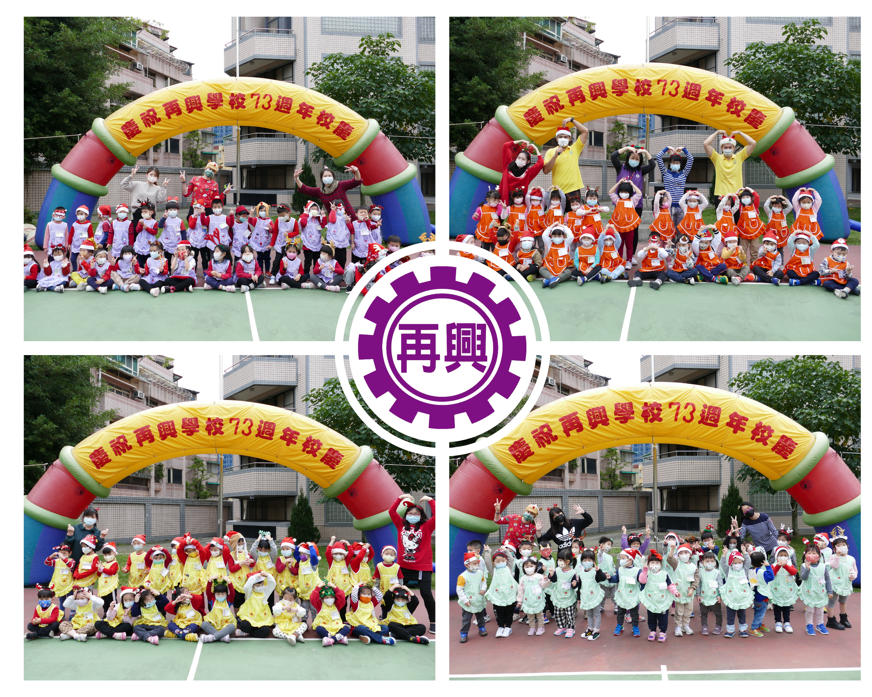 12月20、21、24日幼兒園舉辦校慶運動會,寶貝們唱唱跳跳揭開序幕,老師們設計了各種有趣的體能競賽活動,有滾大球、射空氣棒、滾輪胎、呼拉圈等,啦啦隊的加油聲此起彼落形成一首歡樂的交響樂,運動會在全體師生合唱〝快樂 快樂 再興校慶〞的嘹亮歌聲中,祝福再興學校永遠光明。