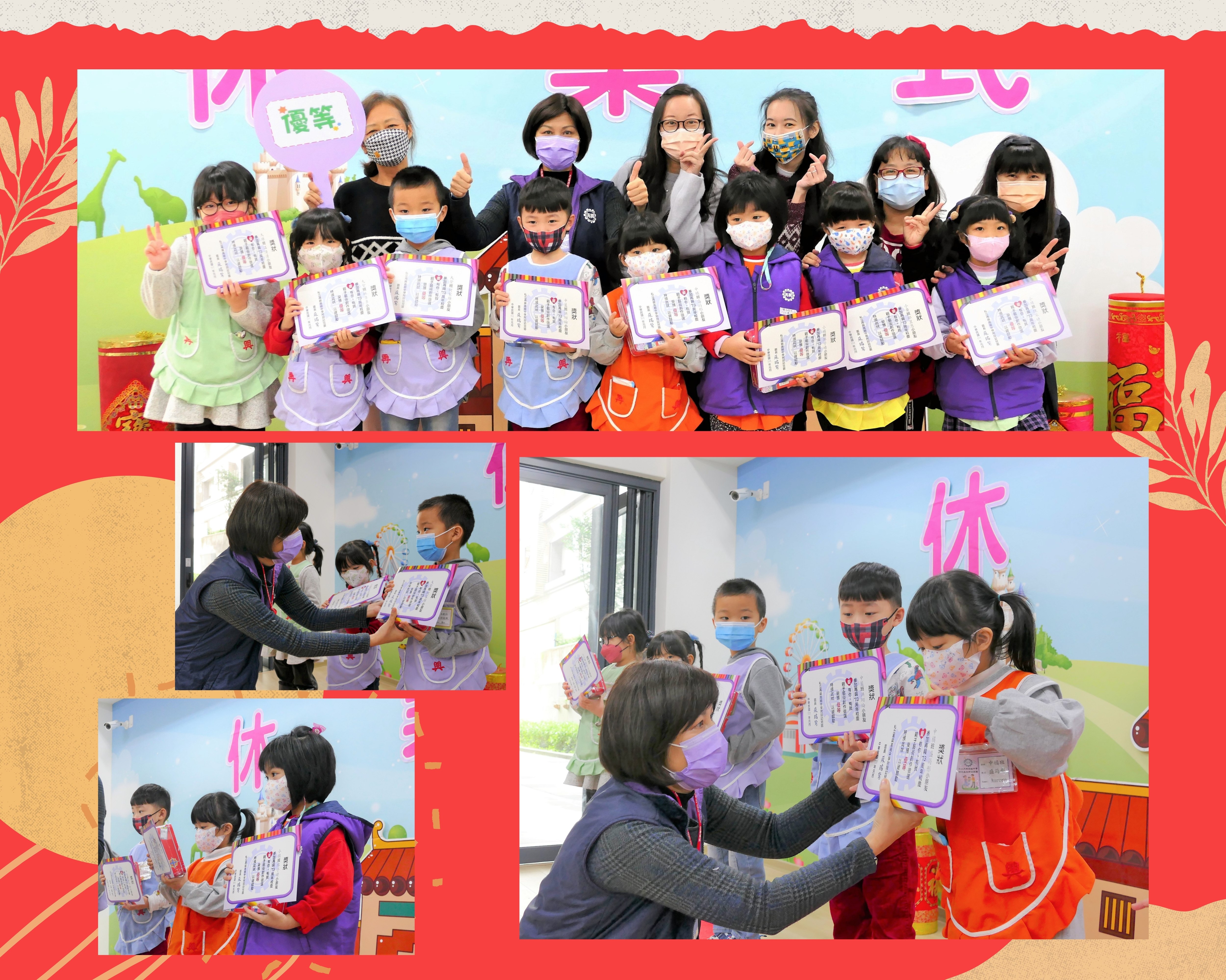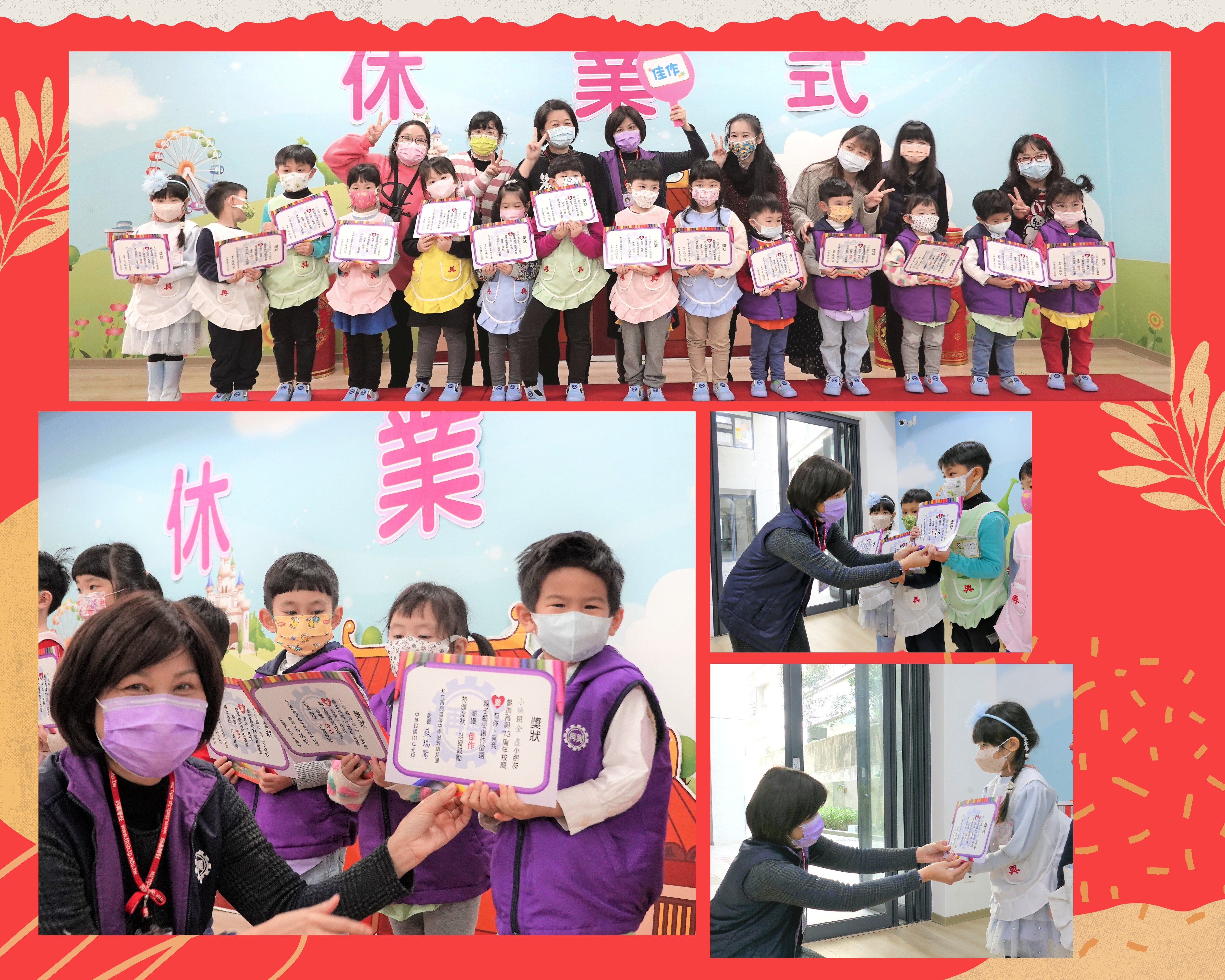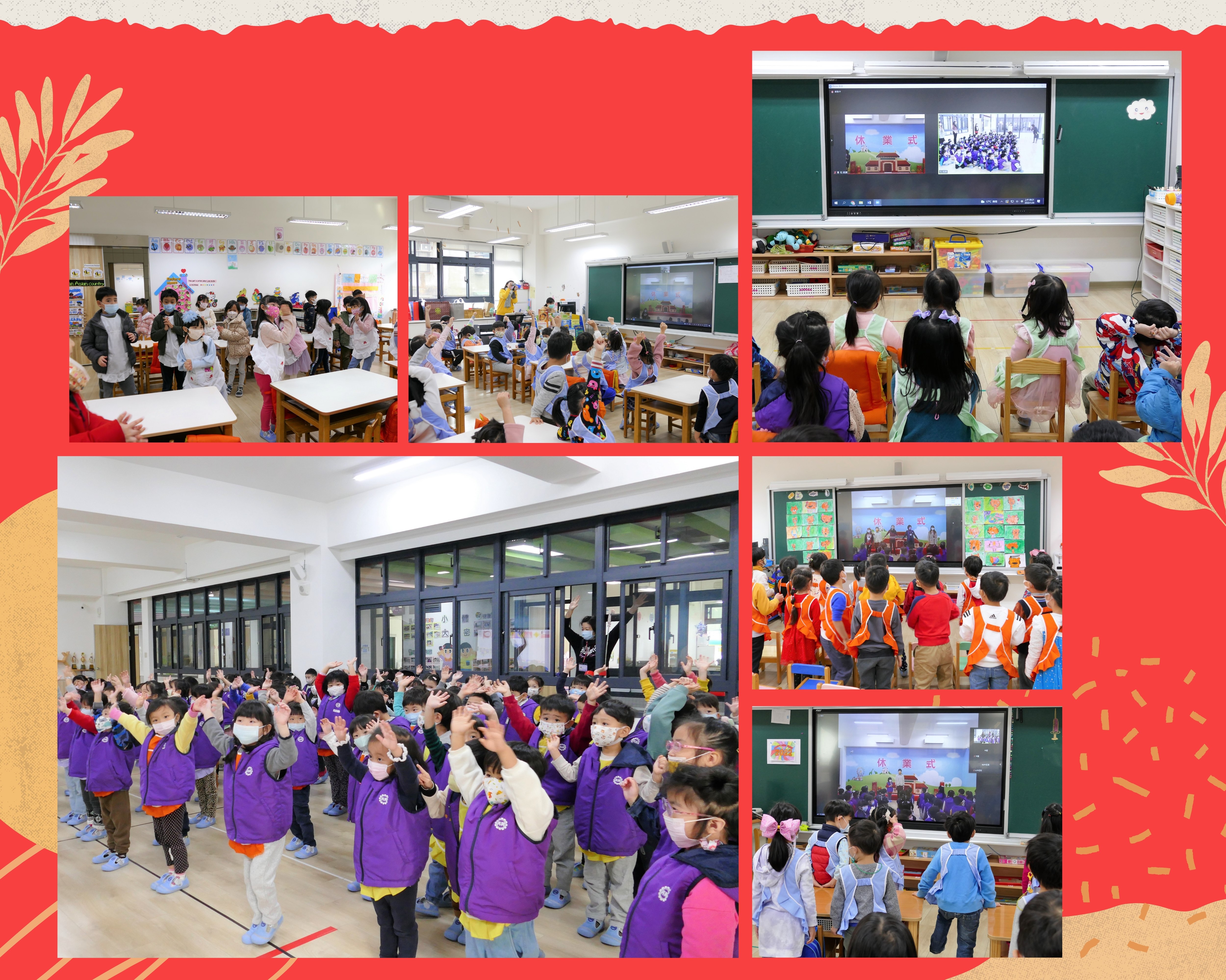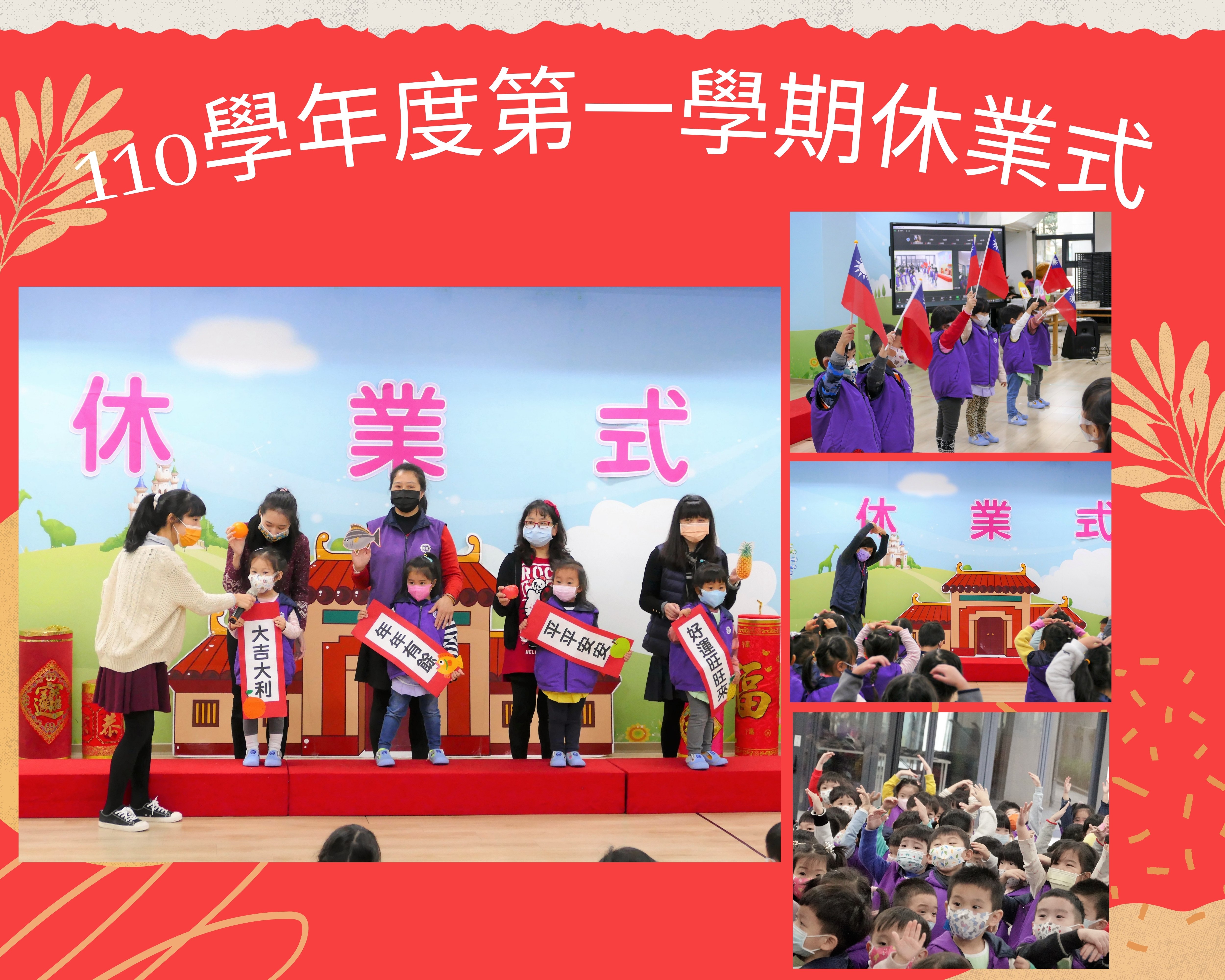 1月20日(四)舉行110學年度第一學期休業式,防疫期間第一次採現場直播的方式,讓中、大班組在教室內就可以與多功能教室裡的小班組一起參加休業式,小班組的老師先錄製年獸短片,讓所有班級都能同時觀賞,當天並頒發歡樂校慶親子彩繪獎項,休業式在小班寶貝們可愛的新年歌謠與放假歌聲中畫下完美句點,園長媽咪祝大家新年快樂,並提醒大家一定要遵守防疫工作,勤洗手、戴口罩、吃飽飽、睡飽飽,健康寶寶開學見!