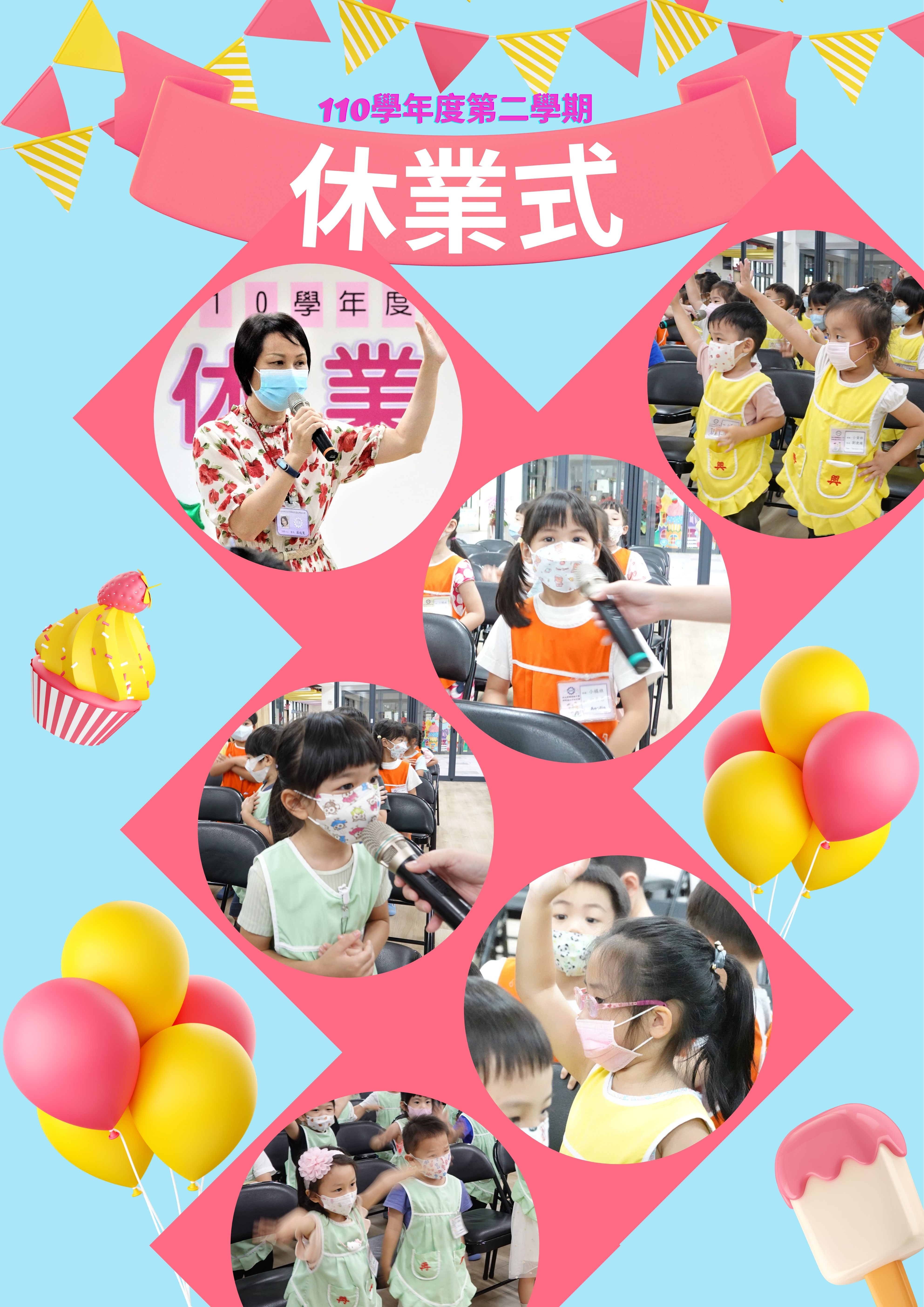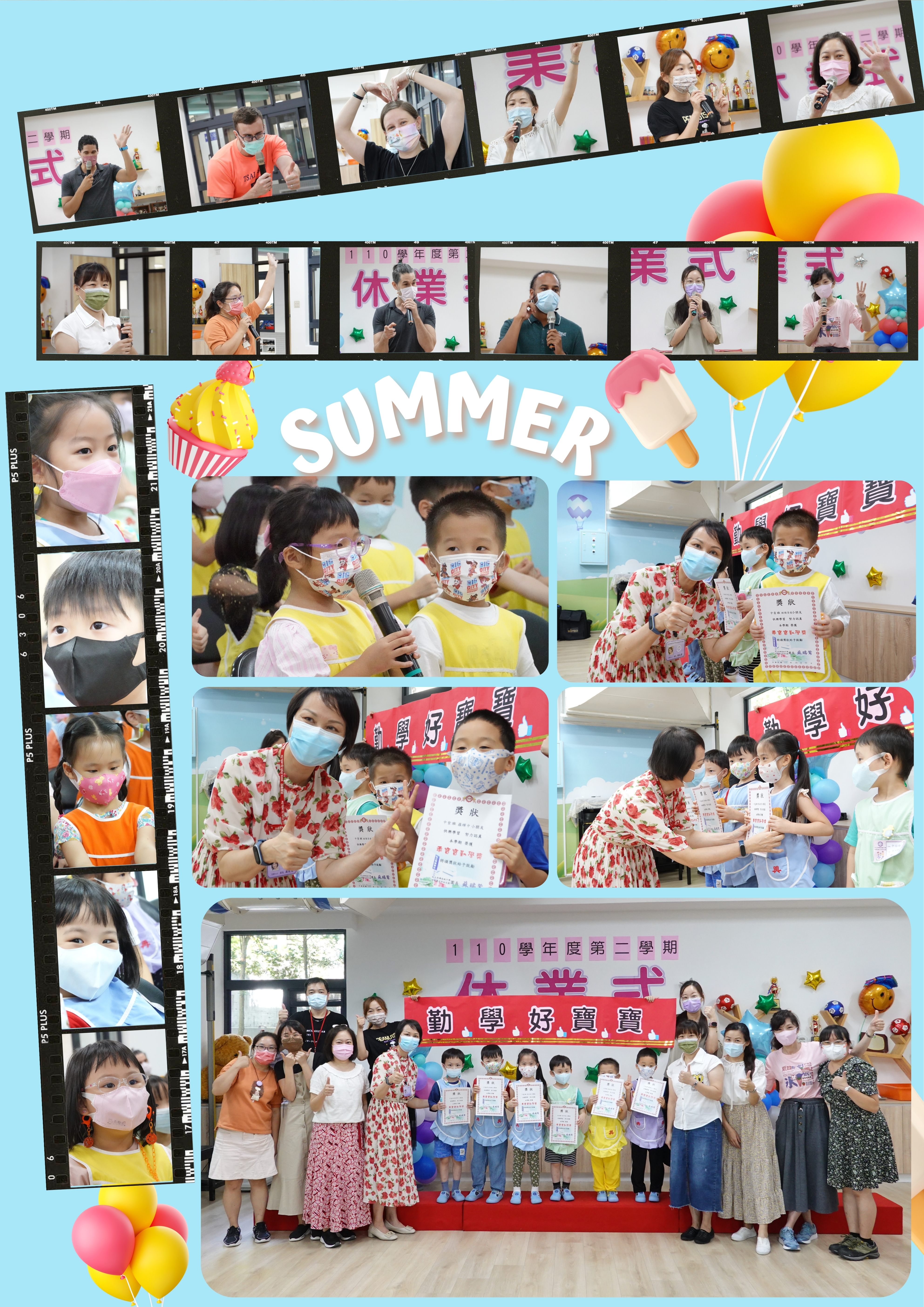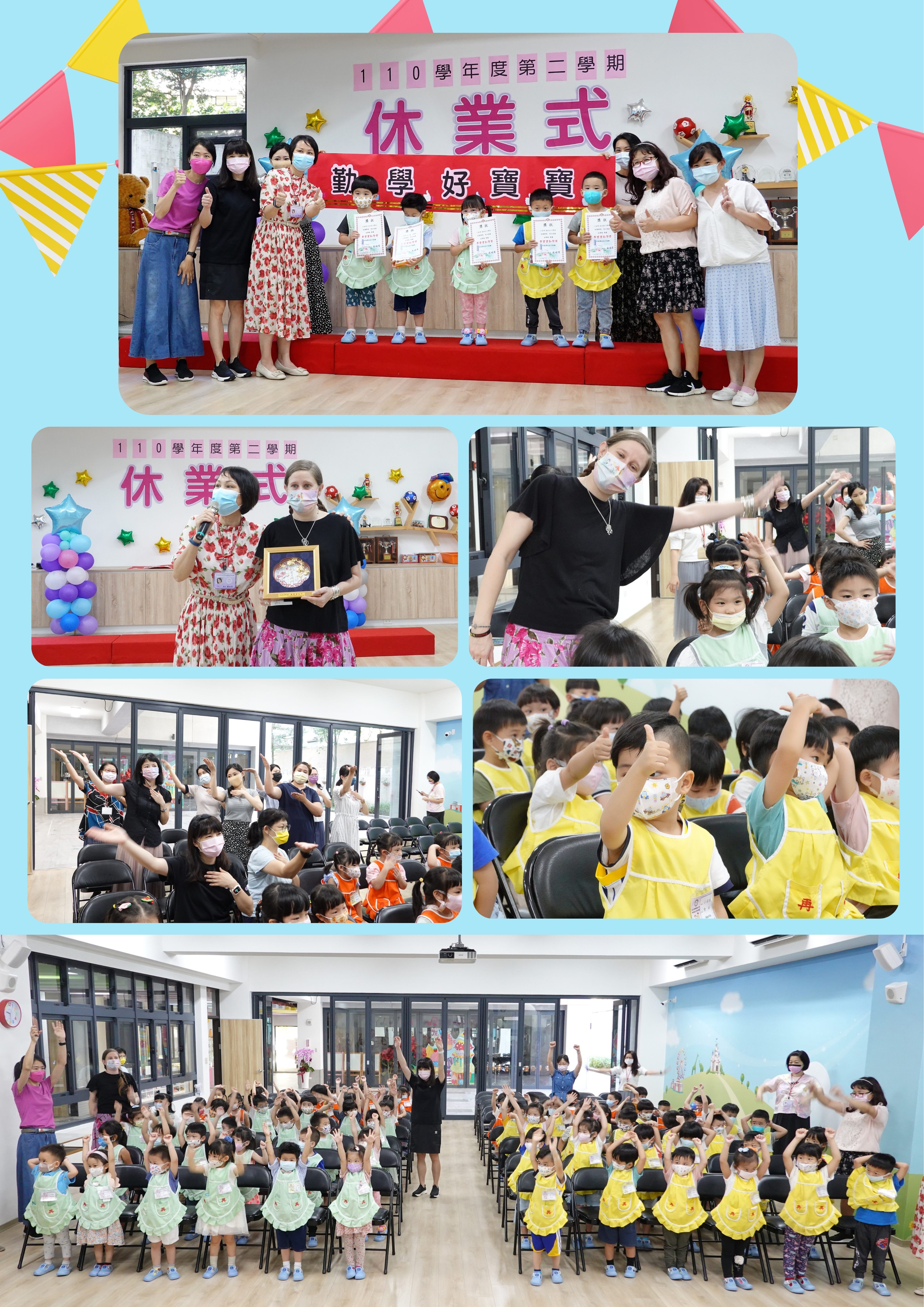 6月30日舉行110學年度第二學期休業式,頒發中小班勤學獎。園長媽媽叮嚀小朋友放暑假了,在家要做聽話的乖小孩,遵守防疫工作,勤洗手、戴口罩,出外旅遊要注意安全,也祝福老師、小朋友們假期愉快。