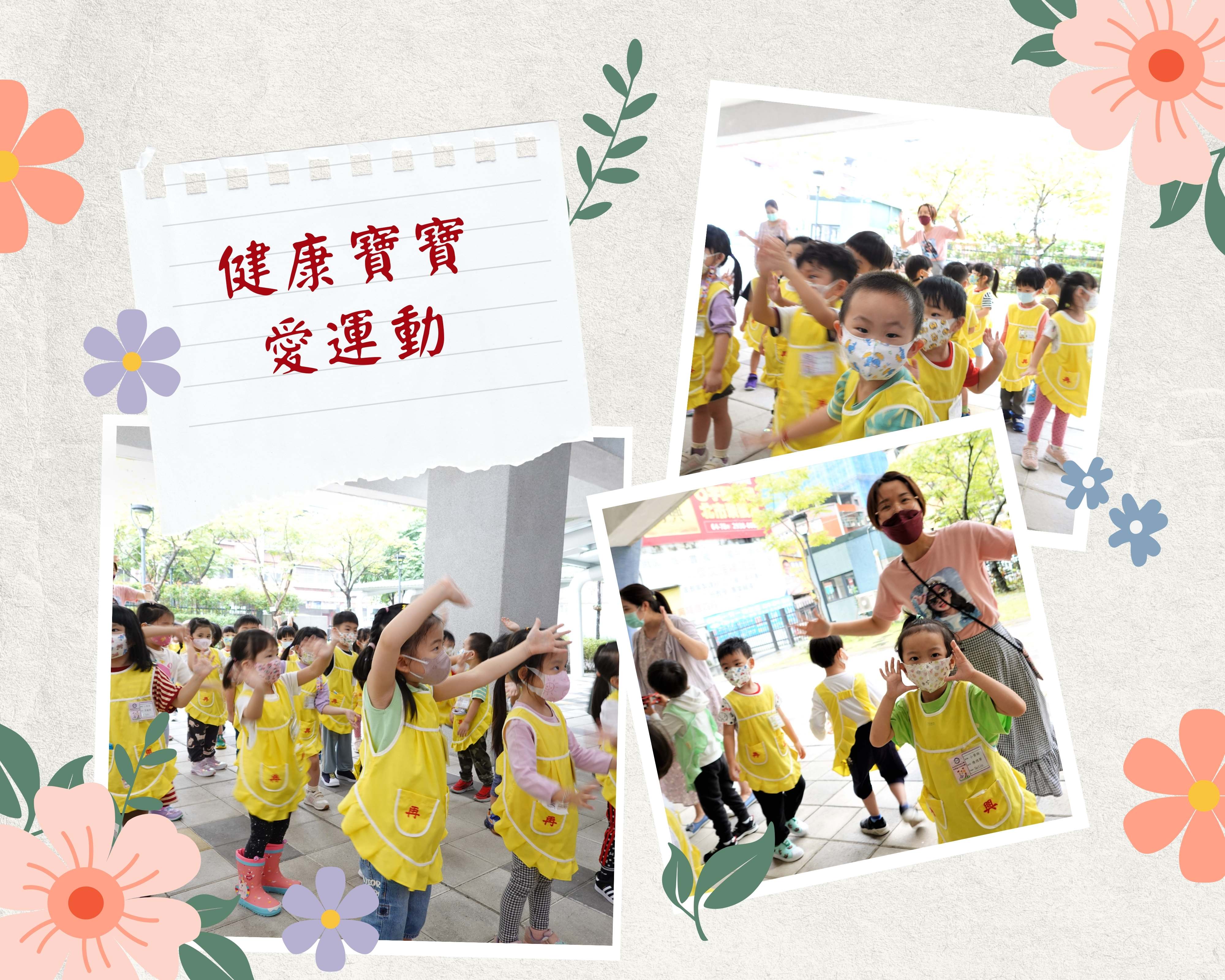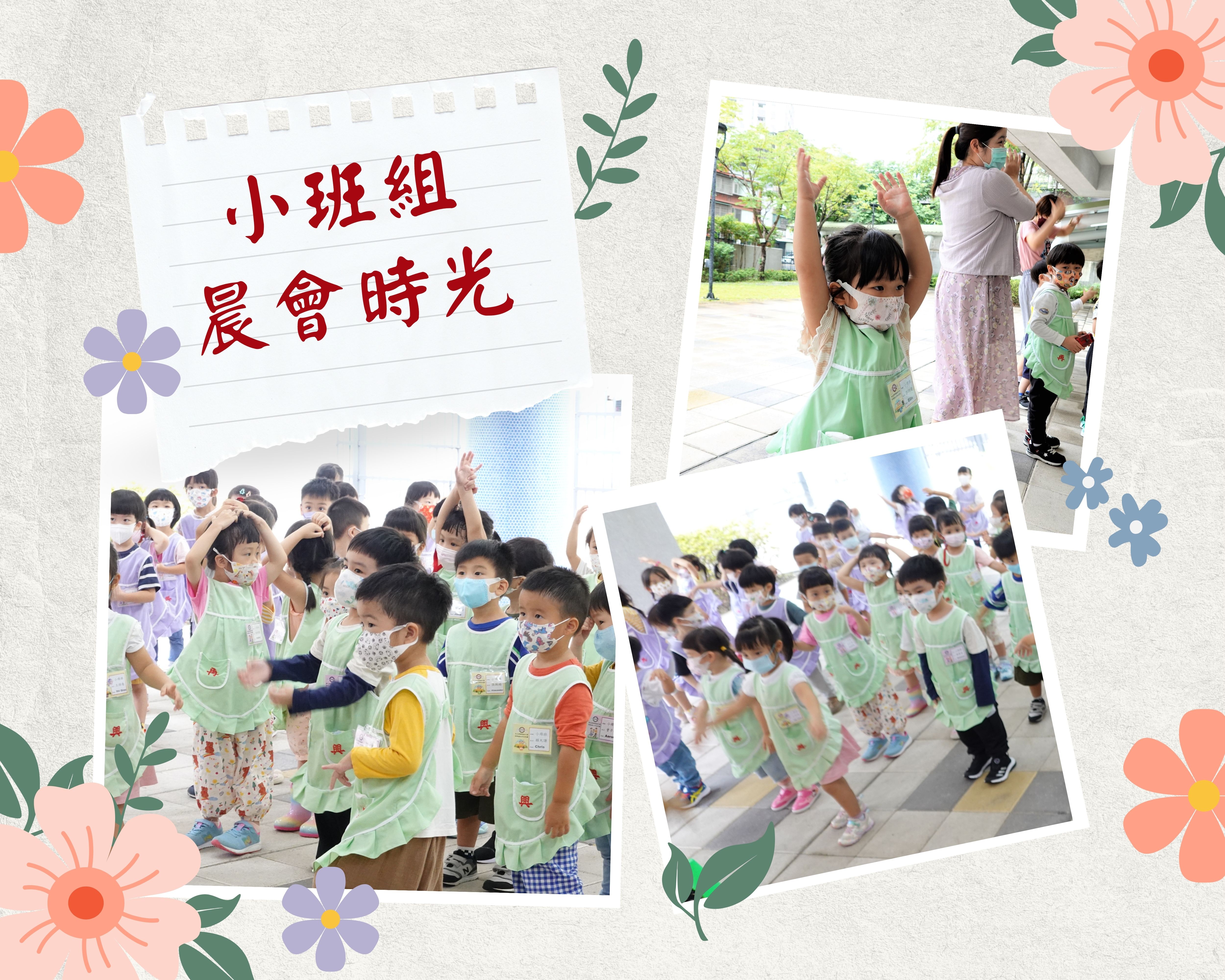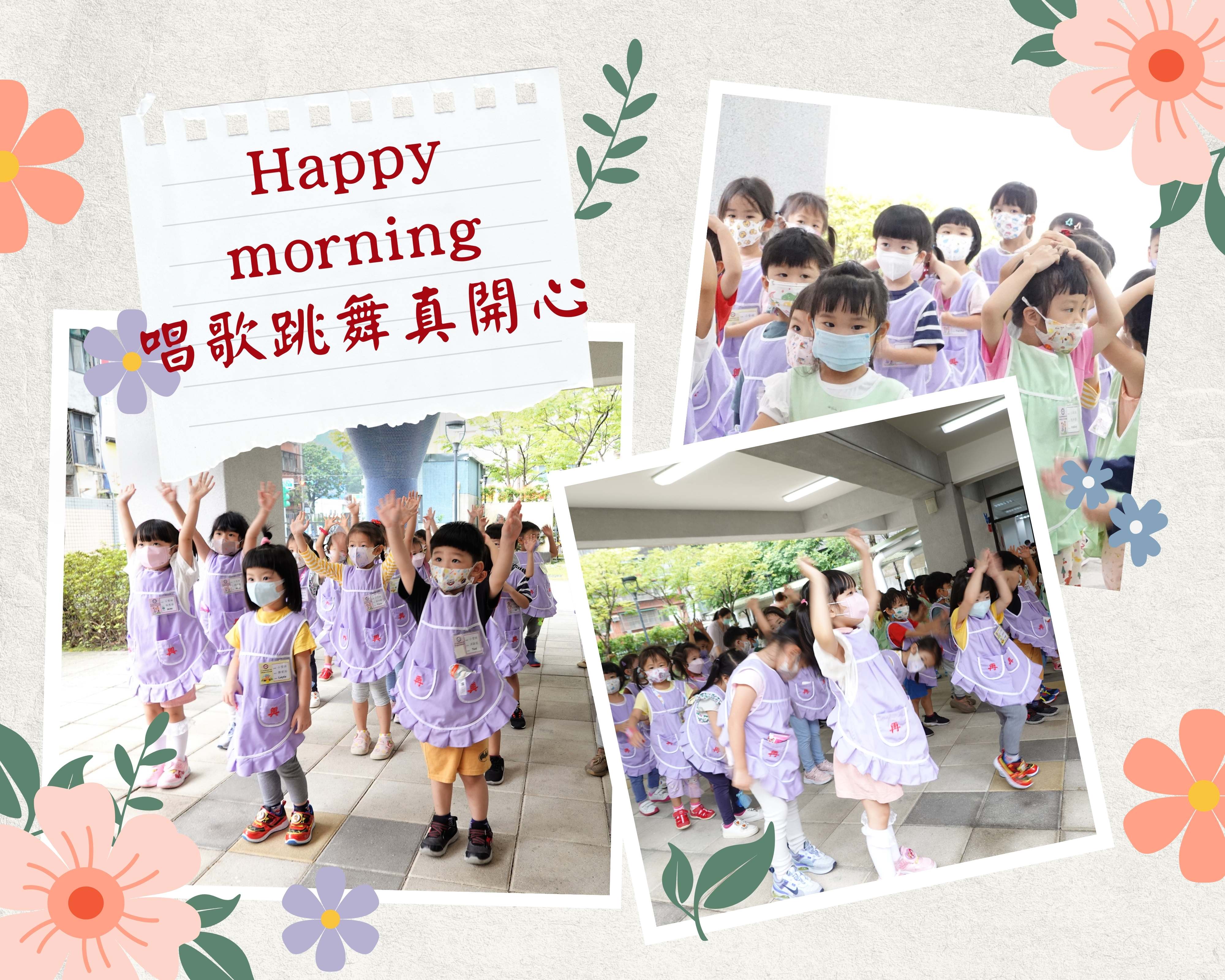 小班組的寶貝第一次參加升旗晨會,跟著老師在幼兒園廣場前唱唱跳跳,開心極了!