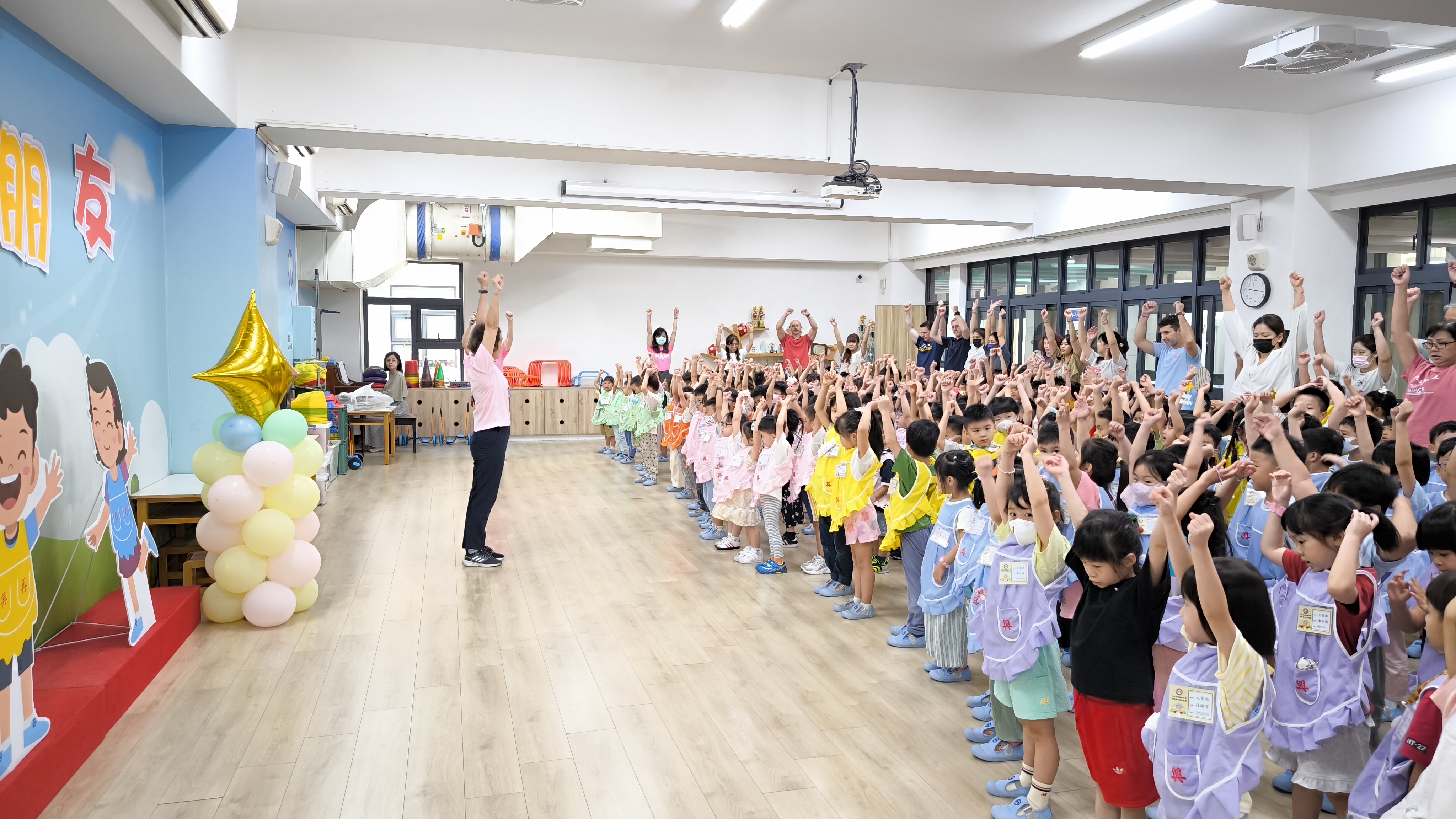 園長媽咪勉勵孩子們,以自信快樂的心迎接學習生活;老師們也逐一自我介紹,讓孩子們更熟悉這群將陪伴自己成長的師長們。新同學們帶著期待與好奇,透過晨會活動更加了解學校與老師,並在掌聲與笑容中感受到滿滿的歡迎與祝福。