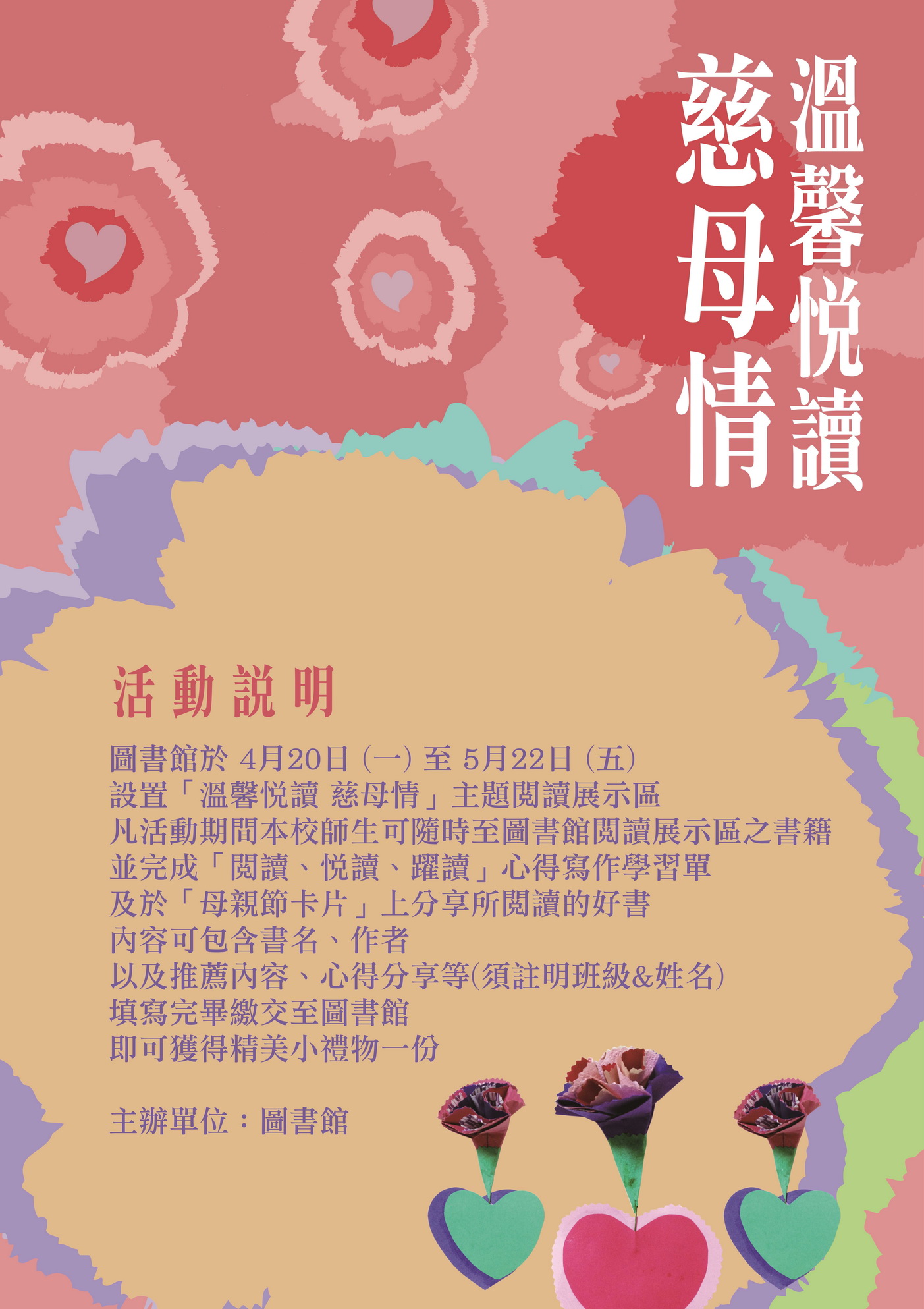 圖書館於4/20~5/22辦理「溫馨悅讀 慈母情」閱讀推廣活動 竭誠邀請本校師生至圖書館參展 也歡迎各科老師利用課堂時間(需預約)帶學生至圖書館參展喔 活動辦法請參見附件^_^