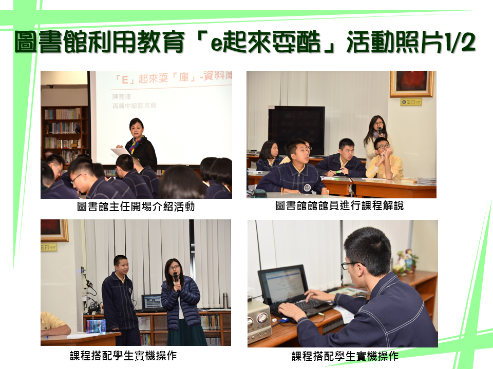 透過辦理圖書館利用教育使學生認識圖書館各類線上資源,以提升學生使用圖書館之知能。實施對象為八年級和高一新生,利用每週週會安排班級於知新樓B1圖書館進行課程,以講習搭配部分學生實機操作系統方式進行,說明圖書館查詢系統、教育局線上資料庫及其他免上線上電子資源。