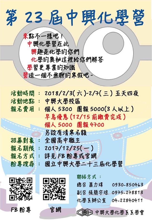 一、第23屆中興化學營訂於2018/2/3(六)-2/7(三)舉行,活動內容包含化學專業演講,化學魔術表演,實驗操作課程及各項趣味活動。