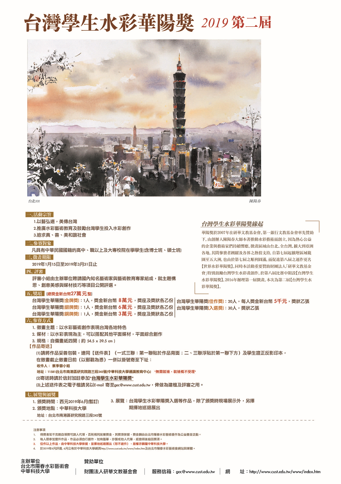 一、華陽獎於2007年由創辦人陳陽春大師本著推動水彩藝術而創立,迄今已辦理八屆【世界水彩華陽獎】。為鼓勵台灣學生水彩畫創作, 2016年辦理第一屆【台灣學生水彩華陽獎】徵畫,本次2019年為第二屆。