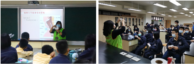創世基金會提供植物人安養照護,由專業護理人員全天候輪班照顧,包含更換褥墊、沐浴及飲食;其中,每隔2小時為院民翻身一次,進行叩背拍痰,需消耗大量痰袋。經由陳專員的教學後,學生們動手為院民們製作痰袋。之後,以小組方式至校園各角落拍攝歌唱、樂器、廣播劇、朗讀故事、笑話分享…等影音,提供給院民聽覺上的刺激。最後,孩子們靜下心製作祝福小卡,為創世志工、院民或院民家屬給予支持與鼓勵。