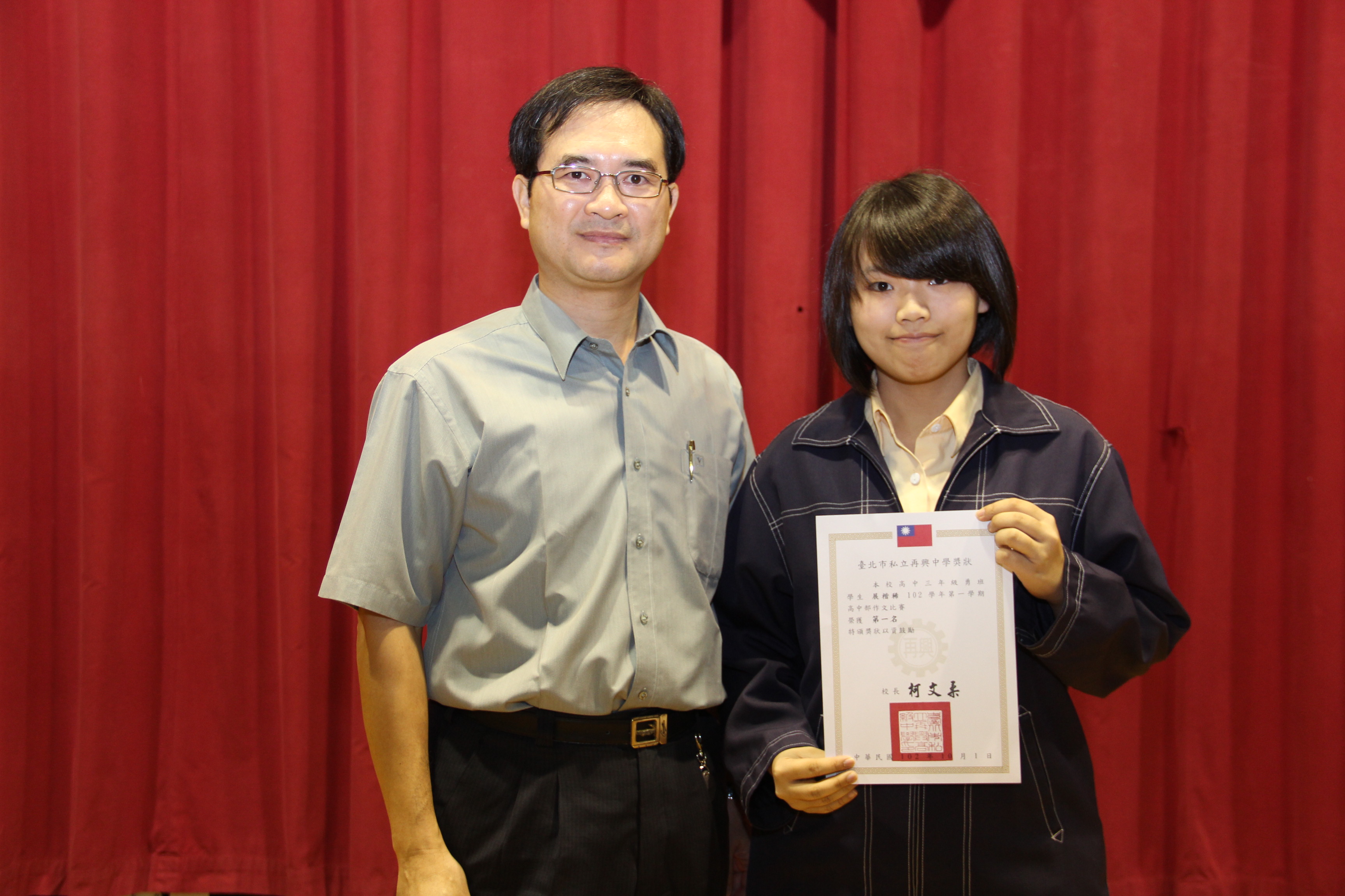 賀!高三勇展楷稀同學參加再興中學102學年度第一學期高中部作文比賽榮獲第一名。
