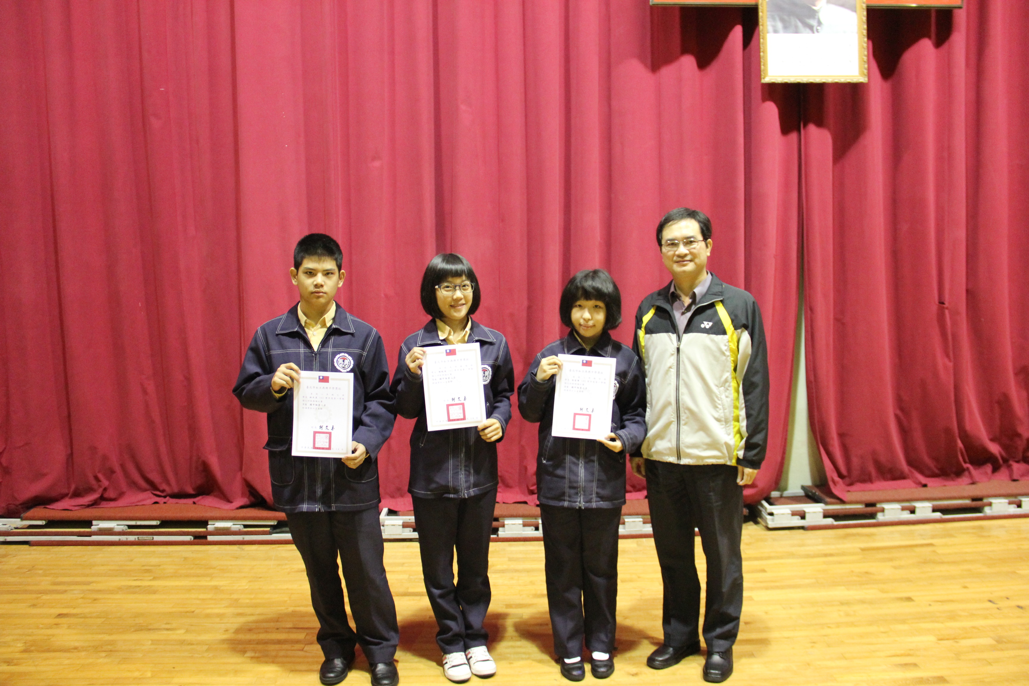 頒發本校102學年度第1學期個人詩歌朗誦比賽:第1名,八年仁班《林天昱》、第2名,九年恭班《賴懿慈》、第3名,八年和班《張家寧》。