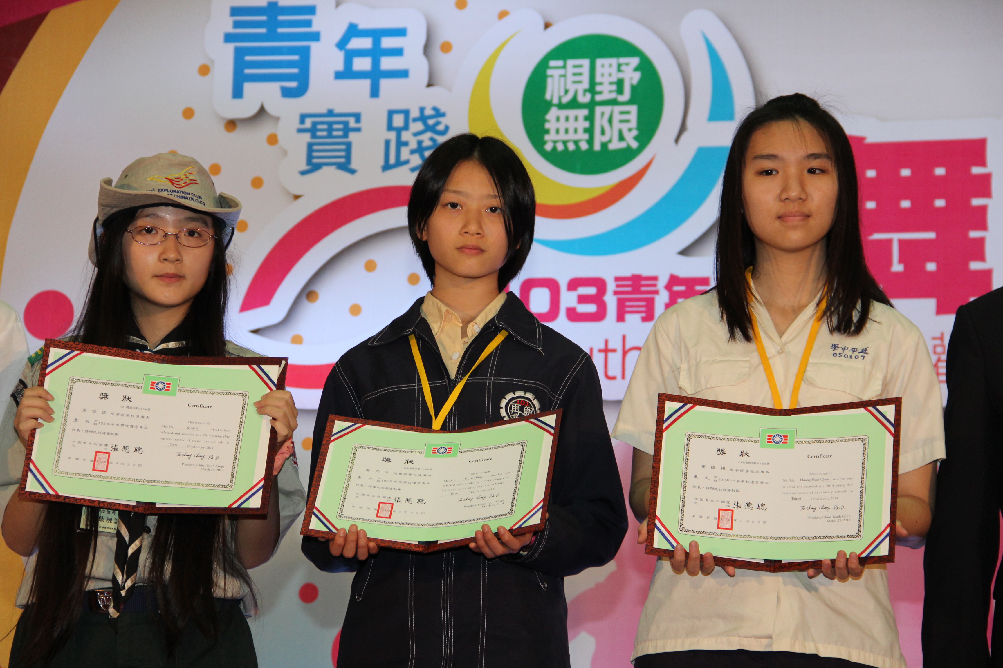 本校國中部八年義班俞乃方同學及高中部三年勇班李祥安同學榮獲「臺北市103年青年節社會暨學校優秀青年表揚」,3月28日於台北市大安運動中心接受中國青年救國團臺北市團務指導委員會頒獎表揚。