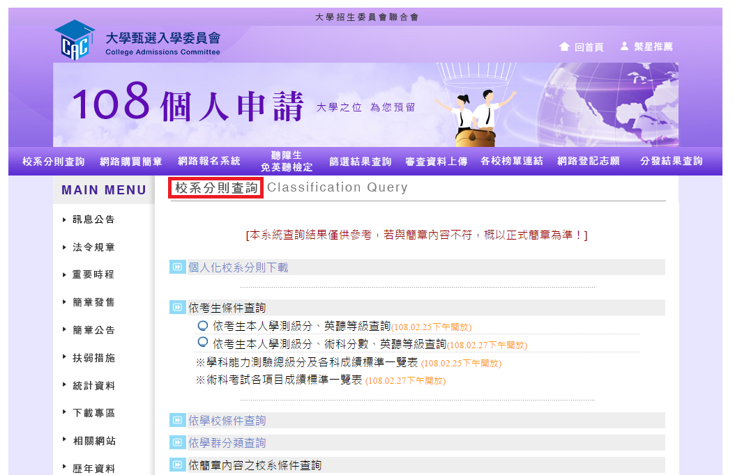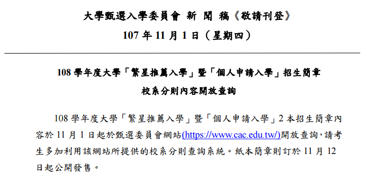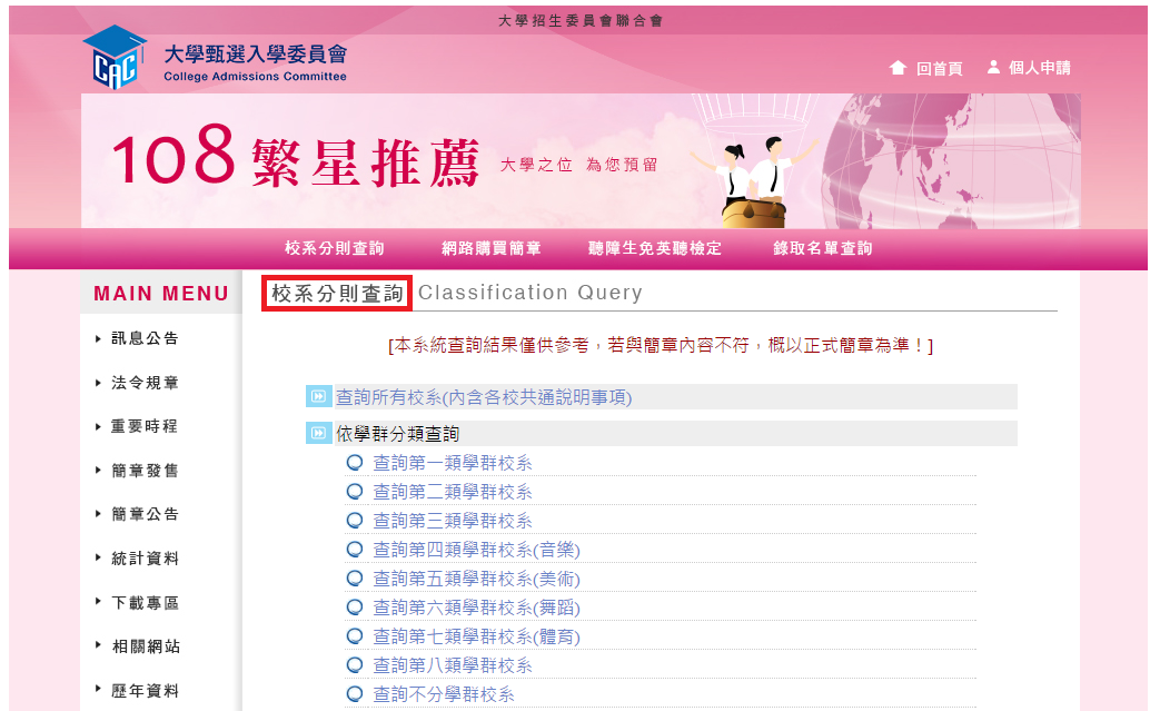 點選「108個人申請」或「108繁星推薦」即可連結甄選會網頁