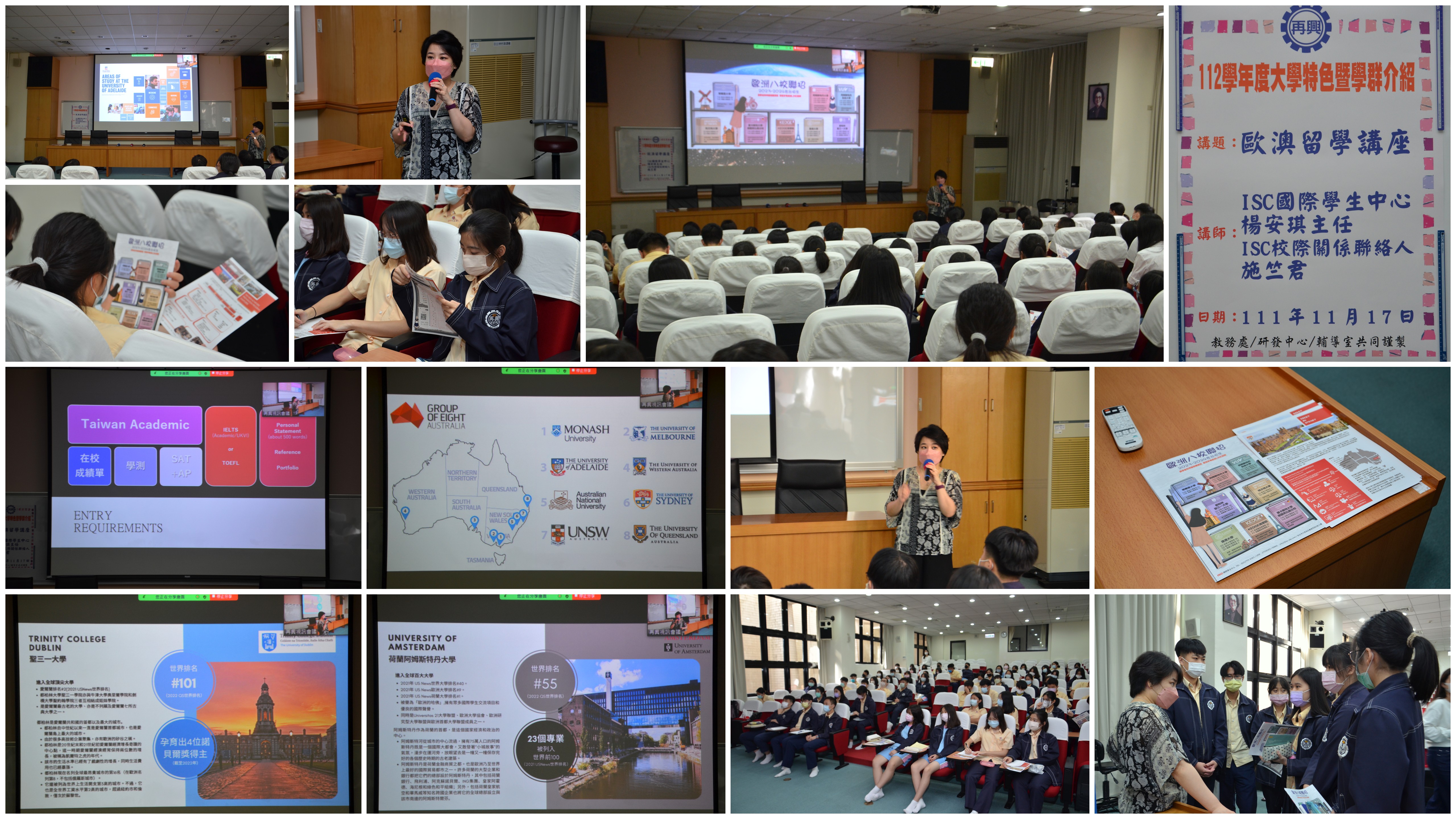 本校於11月17日舉辦歐澳留學講座,介紹歐洲與澳洲留學申請注意事項,以及重點學校的辦學特色。說明會由國際學生中心(ISC)校際關係聯絡人施竺君(Angela)主講,Angela首先比較台灣與歐洲、澳洲的學制,說明國際學生修讀預科(foundation year)的原因以及申請所需文件,接著簡介歐洲八校聯招中的荷蘭阿姆斯特丹大學與愛爾蘭聖三一大學,阿姆斯特丹大學商學院排名亮眼,享譽全球,與本校簽訂合作備忘錄,學生成績達標可透過學校推薦申請並爭取獎學金,Angela也透過影片呈現阿姆斯特丹校園與宿舍環境,聖三一大學則與美國哥倫比亞大學有雙學位合作計畫,提供學生獨特且實惠的多國學術及文化體驗。