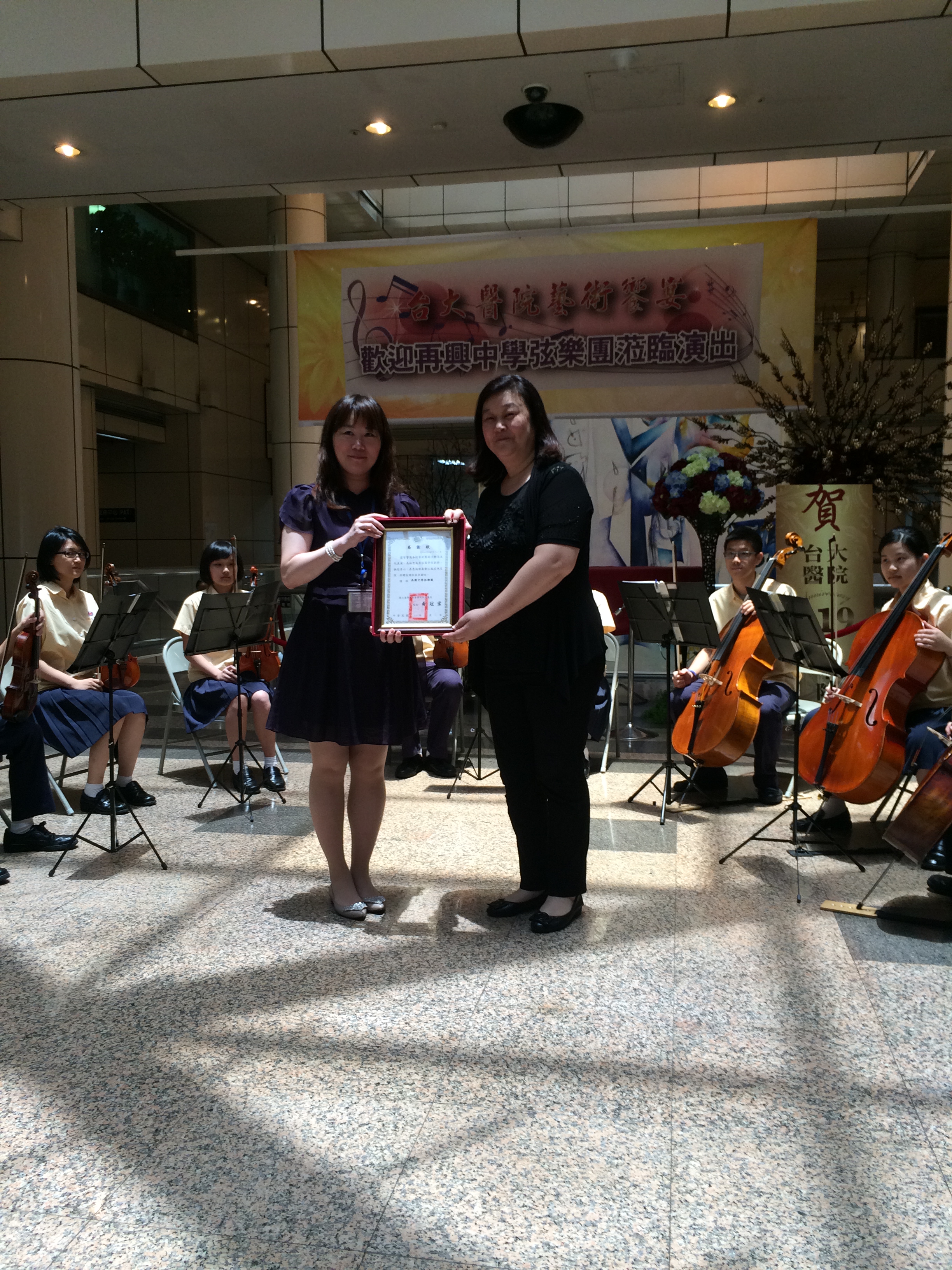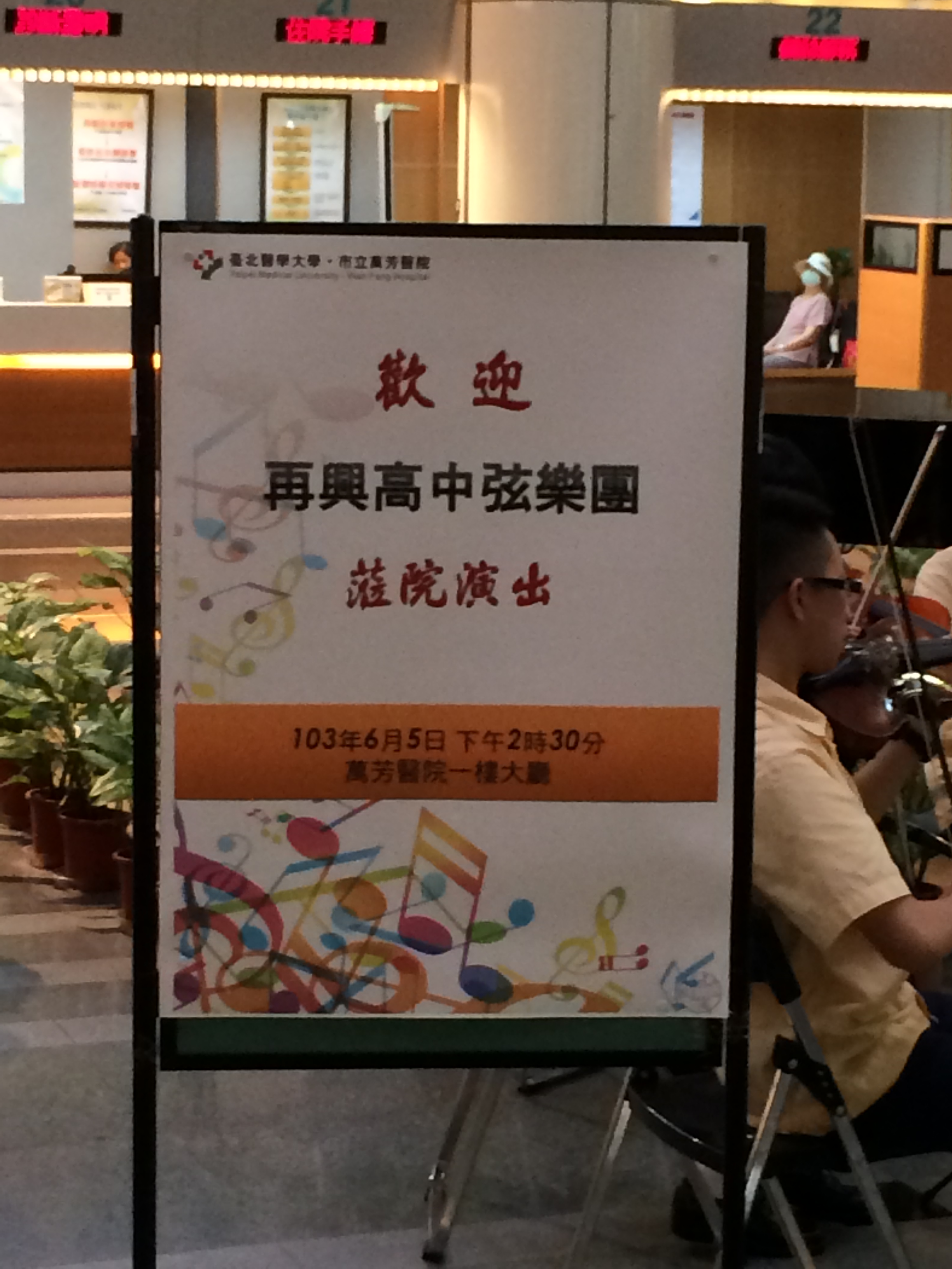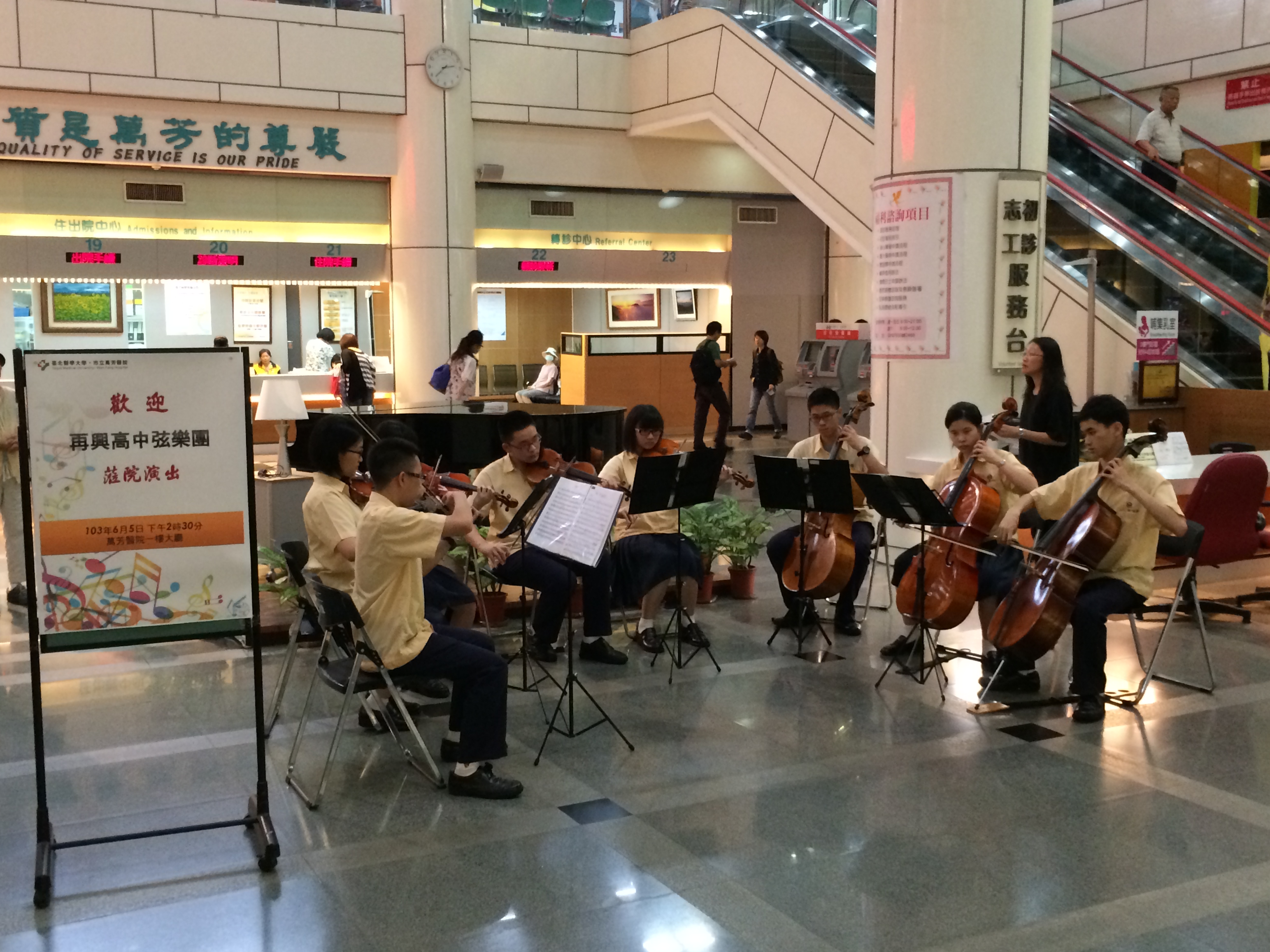 本校弦樂團在初亞蘭老師的指導之下,學習用音樂來關懷社區並磨練演奏經驗,特別與萬芳醫院公關室及台大醫院公共事務室合作,分別於103年6月5日(四)下午及103年6月12日(四)中午前往萬芳醫院中庭廣場及台大醫院大廳川堂進行弦樂表演,由弦樂團徐唯哲社長領軍,帶領社員李多加、葉書廷、王愛寧、楊婉平、孔祥宇、鍾易修、宋庭甄演奏多首曲目,曲目囊括古典類的巴哈無伴奏/莫札特哈雷路亞/皮耶連小步舞曲、民謠類的桃花鄉/若打開心內的窗、電影類的神隱少女/那些年我們追的女孩、流行類的童話等;曲目設計多元,成功引起圍觀民眾的共鳴,並曲曲榮獲掌聲肯定。