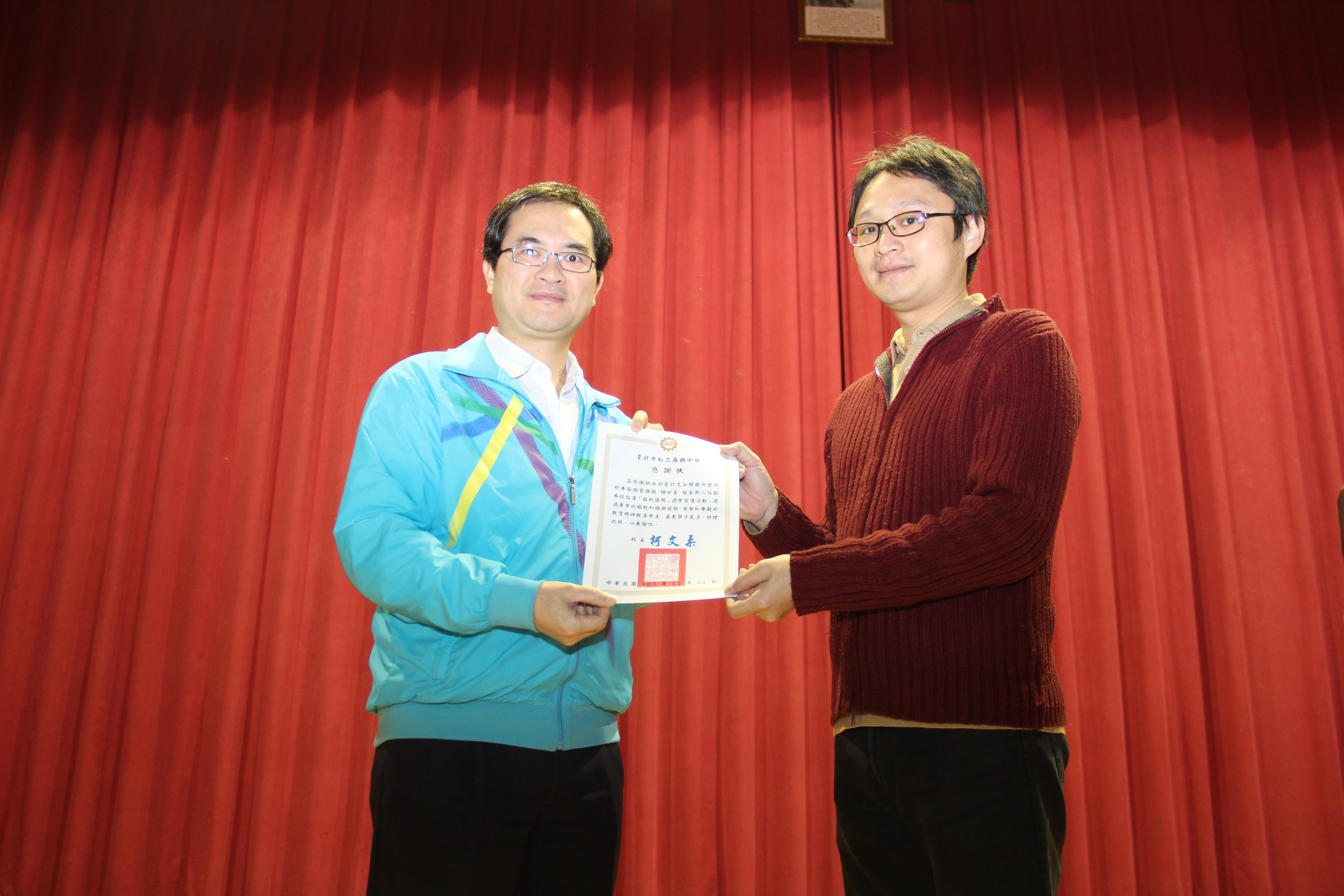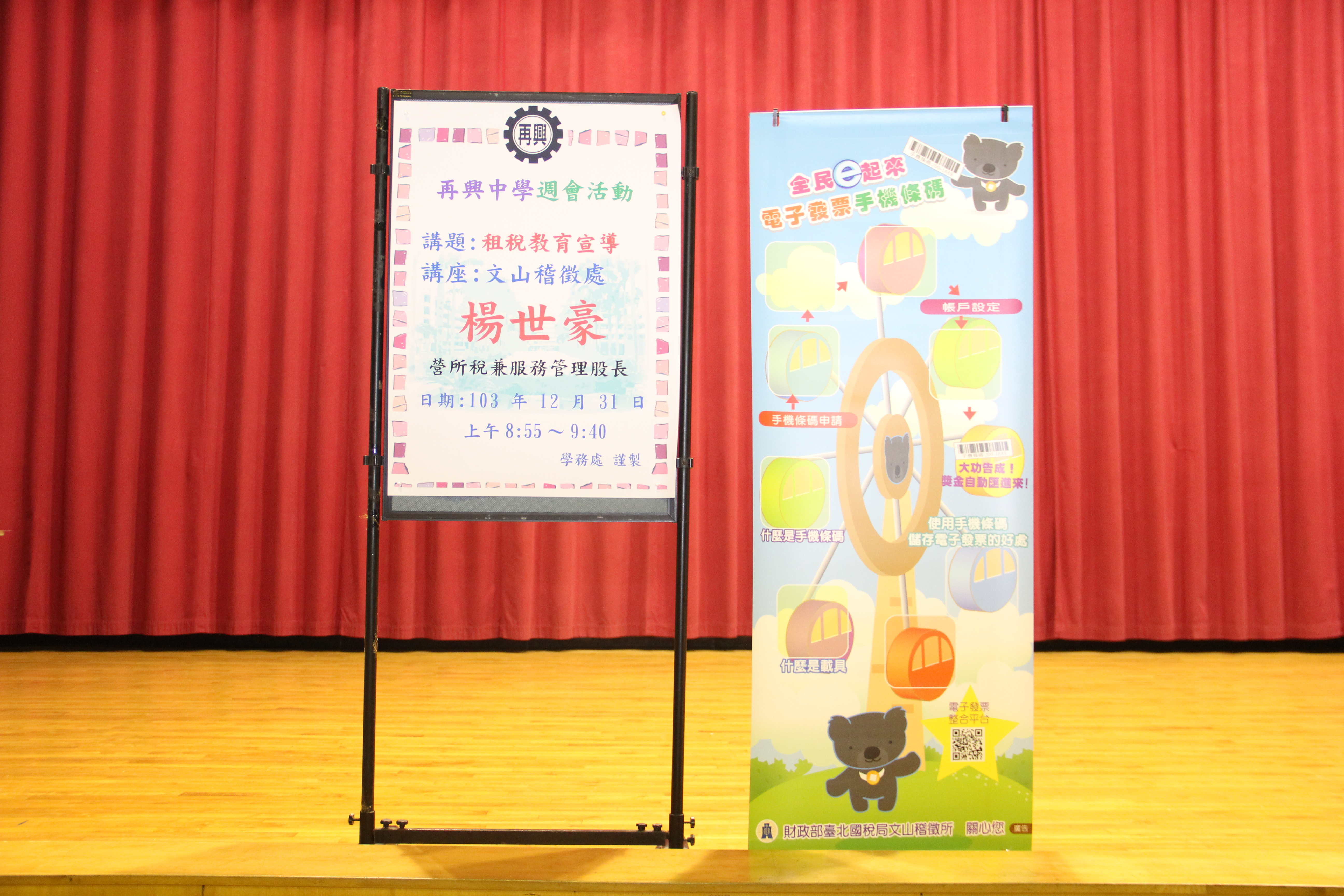 本校為協助學生租稅觀念,特邀請台北市稅捐稽徵處文山分處綜所稅股暨服務管理股楊世豪股長於103年12月31日國中部週會時間蒞校實施租稅專題宣導活動,活動於本校知新樓B3體育館舉行,由柯文柔校長親自主持,本校國中部七、八年級全體學生參加,楊股長以介紹簡要稅制及電子發票的使用方式來協助學生了解現行國內各項稅務知識,增進學生的理財概念;活動尾聲時亦提供精美獎品贈送學生。