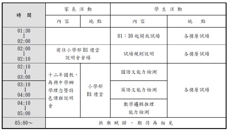 4. 同學參加檢測期間,請家長前往小學部B1禮堂參加12年國教與再興中學辦學理念暨特色課程說明會 。