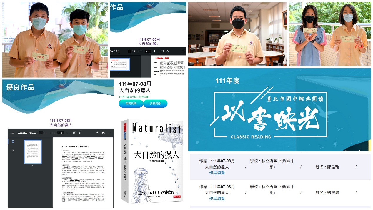 臺北市國民中學深耕閱讀推動小組推動「國中經典閱讀【以書映光】雙月讀本徵稿計畫」,本校國中部共計24班,每「雙月讀本徵稿」至多可推薦8人,符合每期徵稿方式創作內容者,可獲得圖書(或禮券每人100元)以茲鼓勵,教育局並將各校優良作品公告於官網供讀者瀏覽。 (「臺北市深耕閱讀推動資源網」網址:http://163.21.13.2)