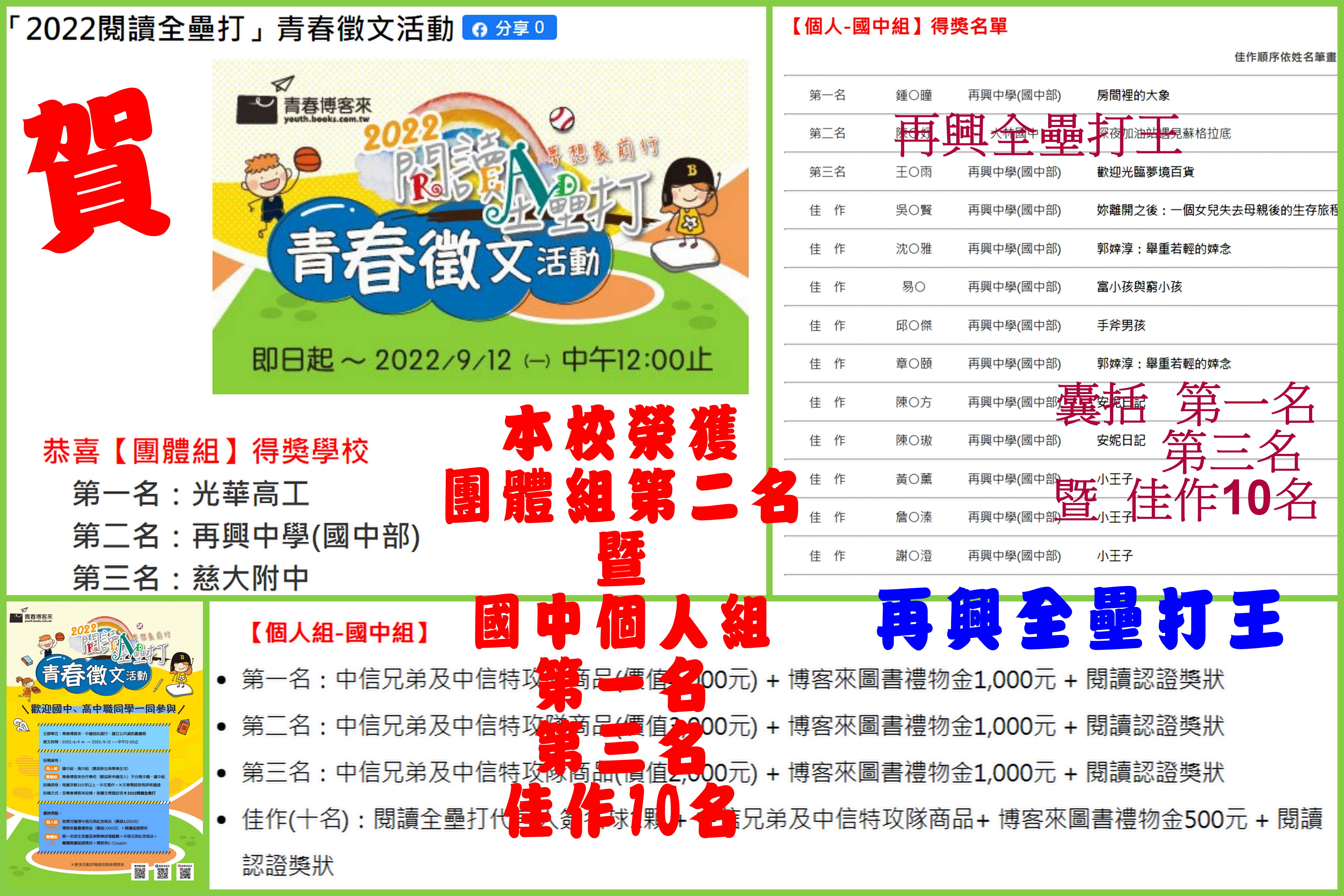 由青春博客來、中國信託銀行、國立公共資訊圖書館共同主辦「2022閱讀全壘打」青春徵文活動,投稿徵文時間:2022/6/9—2022/9/12中午12:00止,分團體組與高、國中個人組別競賽,分初審、複審兩階段;本校同學於暑假期間,在國文科老師們的鼓勵下踴躍投稿,9月21日首先公布團體組成績(不分國、高中組),在全國600多所高國中參與下,本校國中部榮獲團體組第二名;緊接著於11月3日公布個人組成績,個人組除了前三名外另取佳作10名,本校榮獲國中組第一名、第三名並囊括佳作10名,揮出漂亮全壘打。(作品刊登連結: https://youth.books.com.tw/essay_reading)