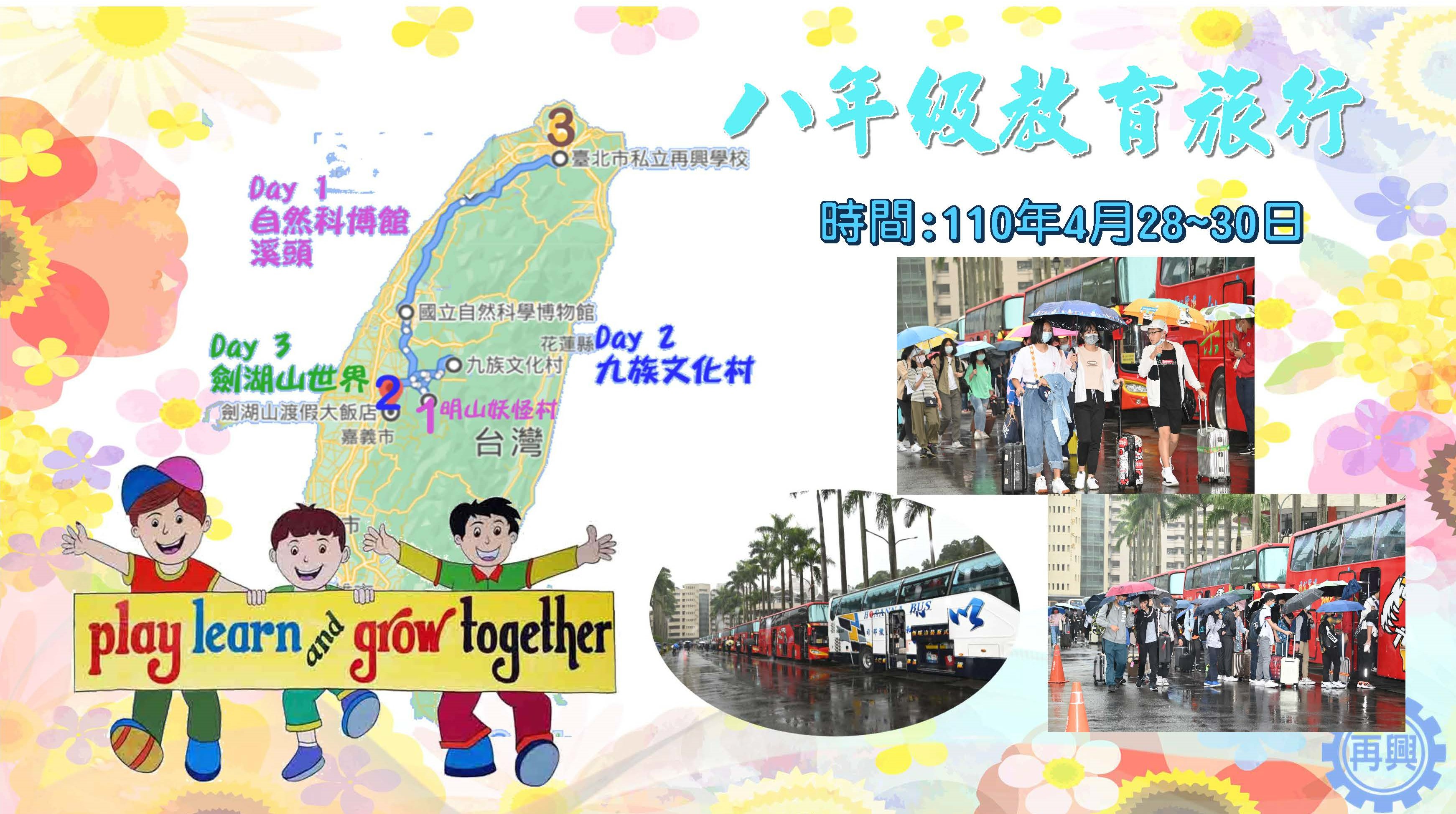 旅行地點主要包括:國立自然科學博物館、溪頭自然教育園區、九族文化村及劍湖山遊樂世界等地。4月28日上午七點過後,天空開始飄雨,緊接著在大家期待已久的"雨"下了下來,雖然是雨中不便,仍然不減大家的興奮的心情;7:50分在輔導室古主任、八年級各班導師及行政同仁率領下,師生共369位在雨的歡呼聲中開啟旅途。