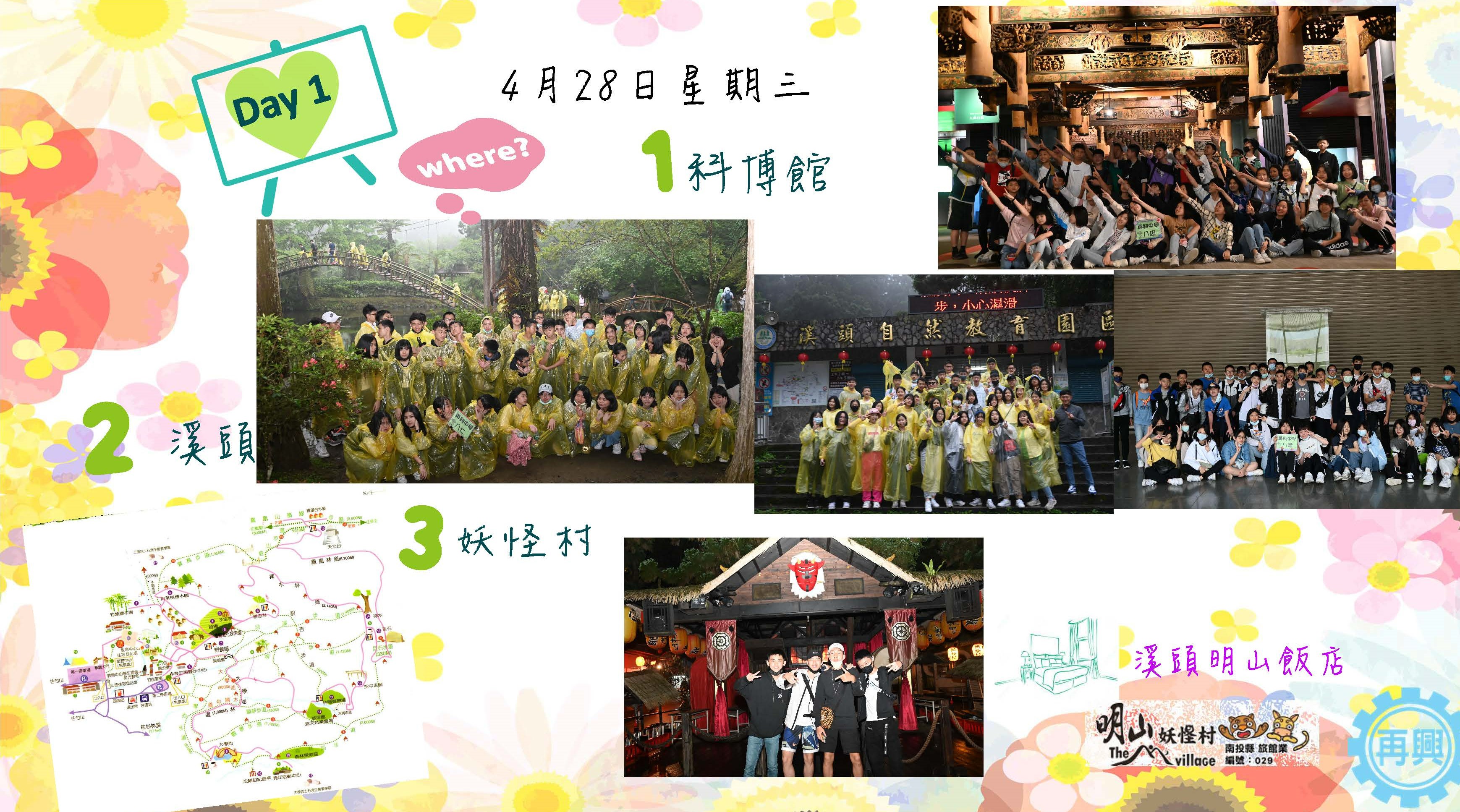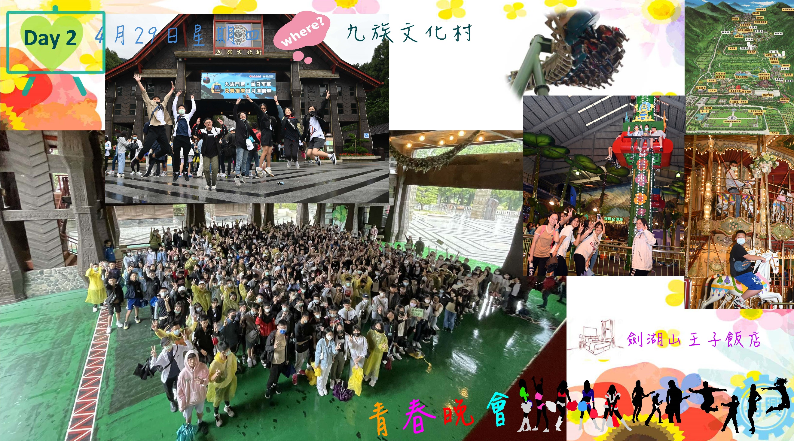 4月29日第二天一早前往位於日月潭的九族文化村,一個以臺灣原住民文化為主題所打造的歡樂多元的主題樂園,園區內有原住民文化、歡樂世界、歐洲花園和日月潭纜車等四大主題。師生們在暢遊整天的九族文化村後,晚上來到了雲林古坑鄉的劍湖山王子飯店,與高二學長姐們會合。
