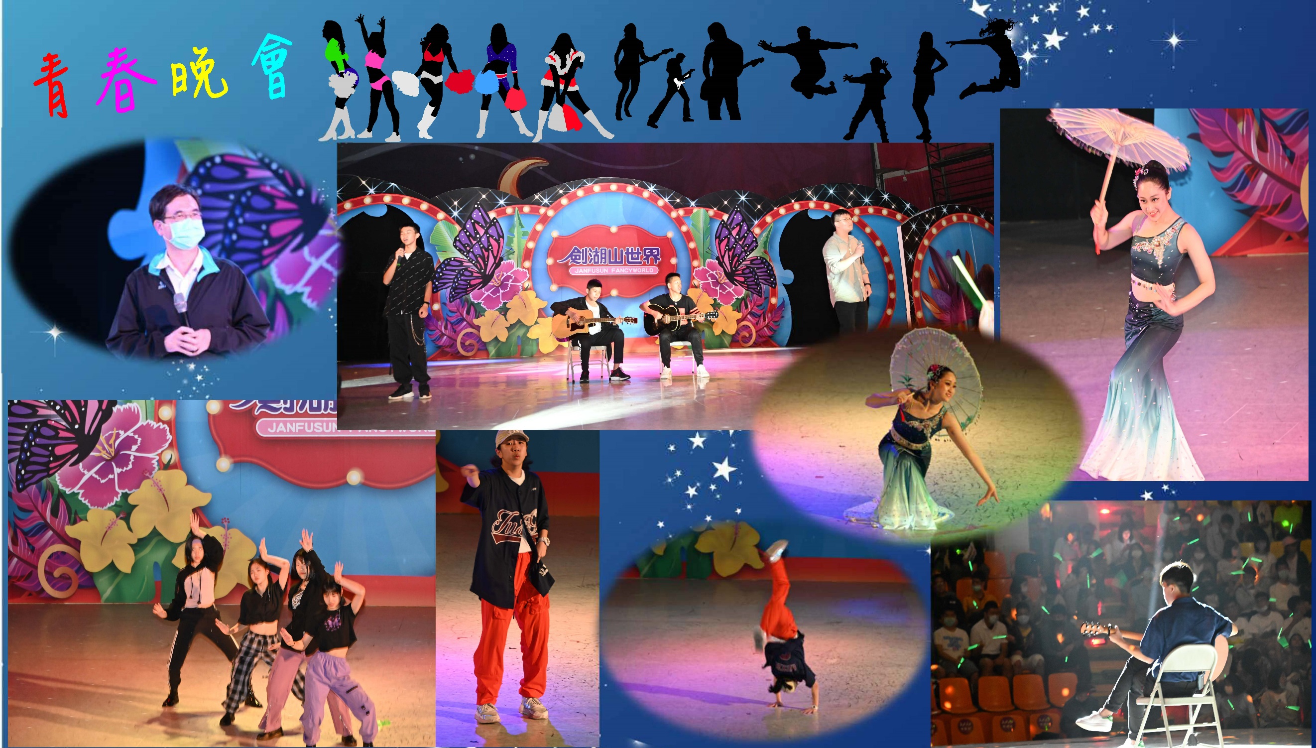 晚餐後,師生一同前往遊樂場的彩虹劇場內觀賞表演,表演結束後,由毛克利旅行社與班聯會同學共同精心策劃舉辦的盛大青春晚會在柯校長致詞後正式揭幕。晚會第一個節目是由國中同學帶來的優美民俗舞,接續熱舞、吉他表演,來到中場的班聯會設計的氣球海盜遊戲,讓會場的氣氛更為熱絡起來,活動的後半場由高中部同學們帶來一連串精彩熱舞和吉他彈唱,搭配燈光的變化,讓大家享受了一場美的饗宴。最後,在動人的樂音下,即將在本學期期末邁入九年級分班的同學們更珍惜與感謝這難得的緣分,在大家相互祝福擁抱中為晚會劃下最美的結尾。