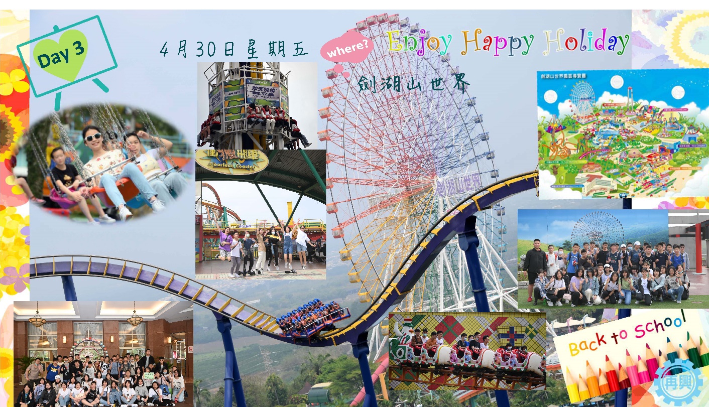 4月30日第三天,同學們用過早餐,整理檢查房務後,便迫不及待地進入劍湖山遊樂世界中盡情歡樂,挑戰各項刺激遊樂設施了。午後2:10集合準備返程,返程途中一路順暢,全體師生於晚間19:30陸續平安返抵學校,結束這趟令人難忘的教育旅行。