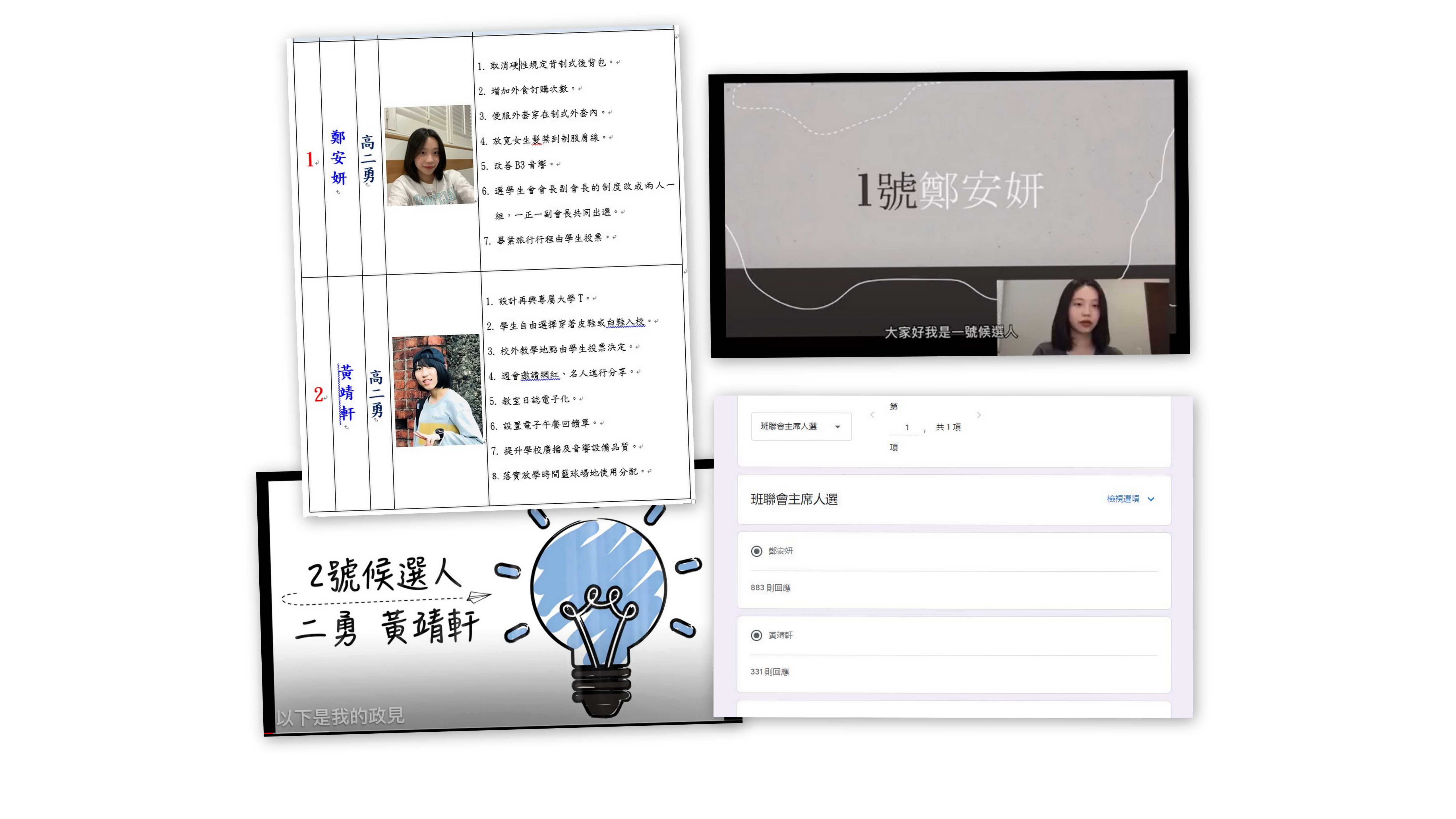 競選影片中,兩位候選人:高二勇班鄭安妍(1號)、高二勇黃靖軒(2號)分別針對自己的政見進行發表,雙方在鏡頭前展現大將之風,儀態落落大方,秉持讓學校變得更好的一腔熱血,將各自見解逐一梳理、介紹。