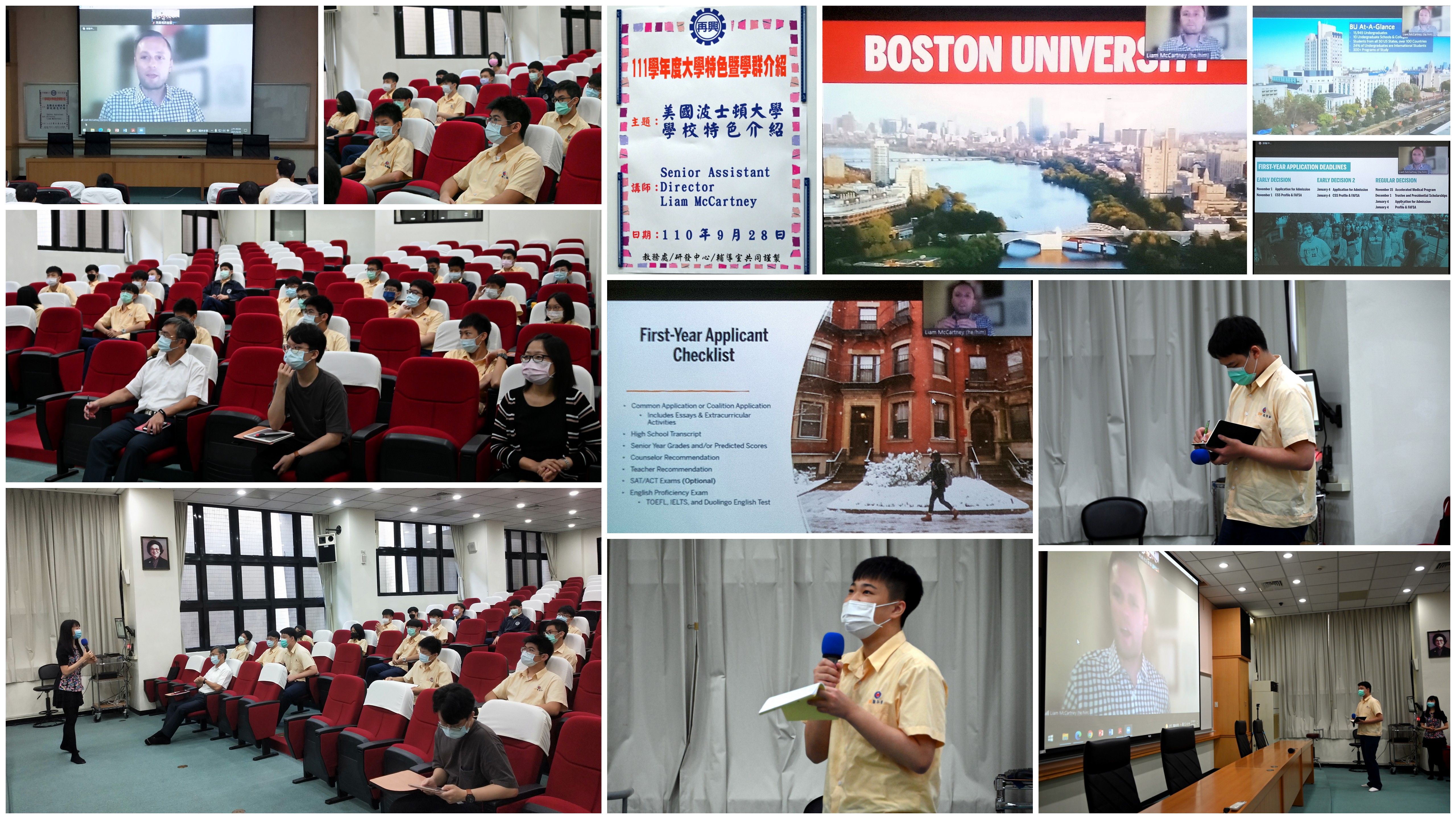 本校於2021年9月28日辦理美國波士頓大學留學座談會,受限新冠肺炎疫情,座談會採線上進行,由大學招生辦公室資深協理Mr. Liam MacCartney向同學介紹學校特色及申請流程,並提供現場問答的機會。