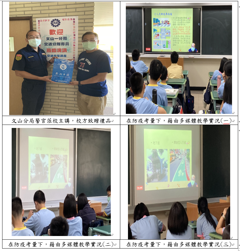 敦請臺北市政府警察局交通警察大隊文山一交通分隊警員楊致國蒞校主講,講述內容包含︰何謂路權、騎乘自行車應注意要項、安全帽與安全帶正確配戴重要性、駕駛人員在行路時之視野與盲點、內輪差說明與危安性提示、常見交通號誌說明、穿越道路應遵循之安全五步驟與發生交通事故時「放、撥、劃、移、等」五大步驟等八項重點,以平白簡單敘述輔以實際案例說明方式,將交通安全應注意要項藉由45分鐘多媒體講演教學,加深同學基本常識認知,明白做到「平安」是回家唯一的道路。