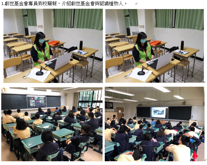 因應12年國教超額比序項目之一的服務學習時數要求,本校學務處為七年級學生規劃創世基金會服務學習活動,今年度為配合新冠肺炎防疫規範,取消前往創世基金會文山分院參訪,特邀陳怡鳳專員到校,透過簡報介紹創世基金會,並以真實案例讓學生們了解植物人的狀態。