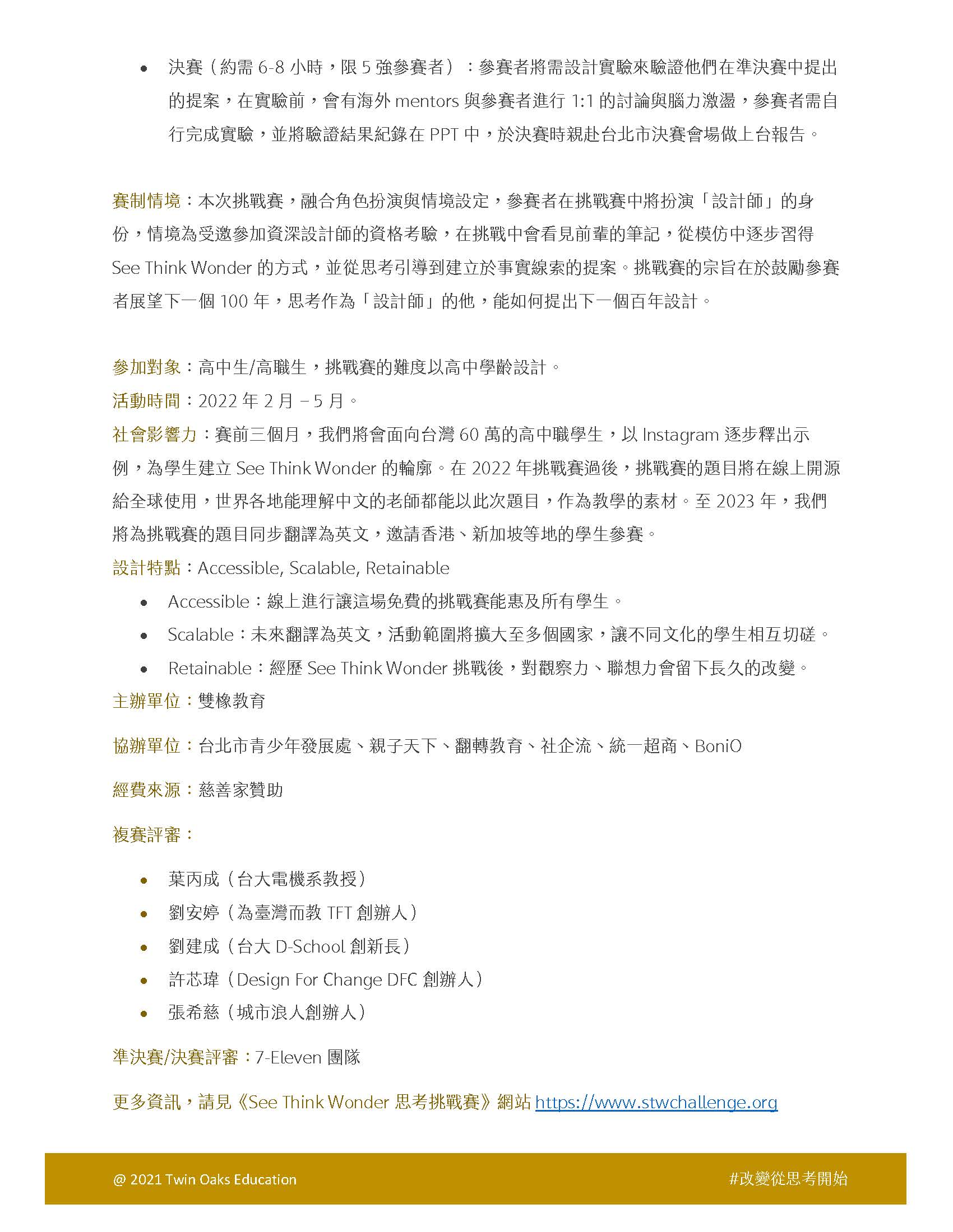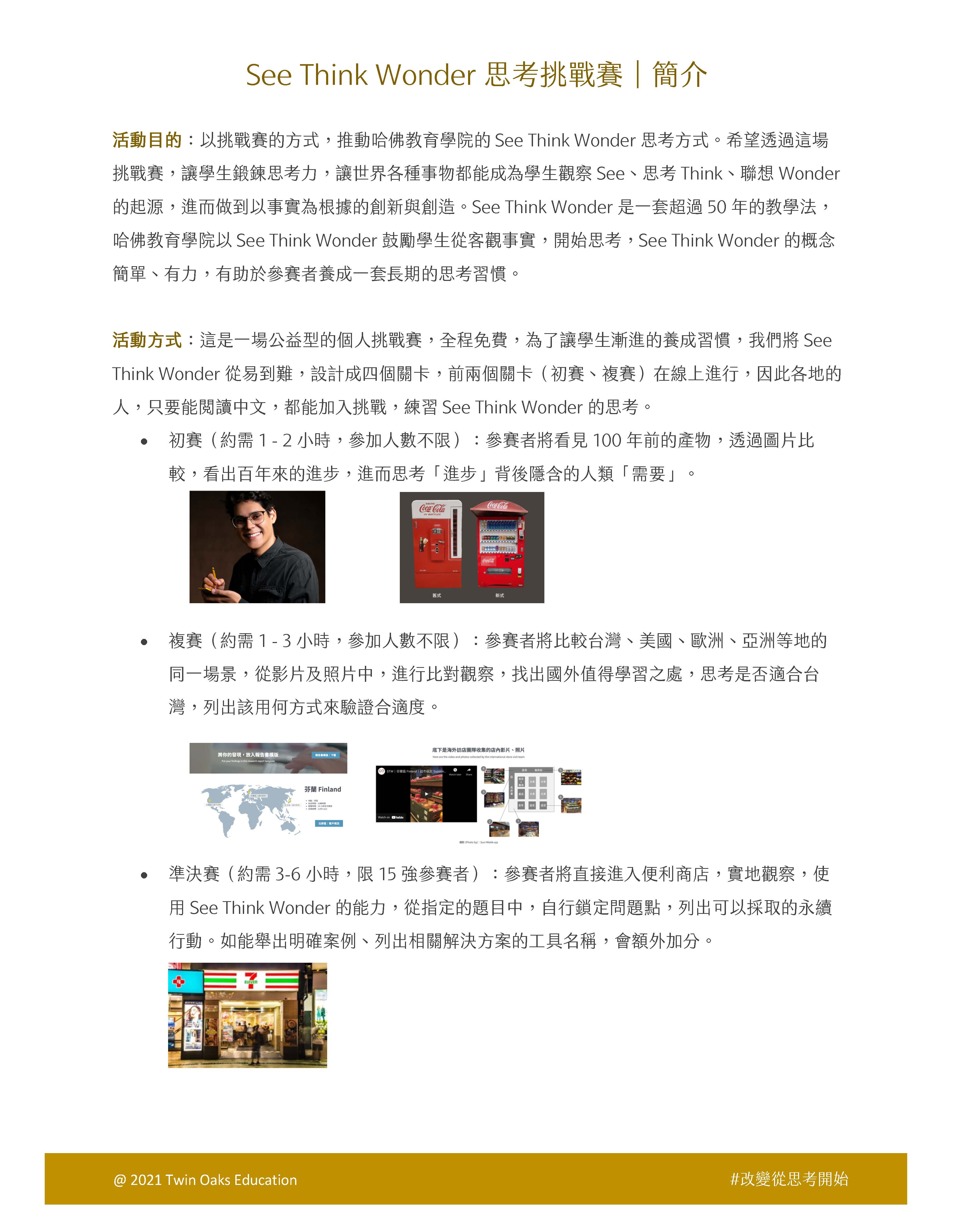 《See Think Wonder 思考挑戰賽》是由哈佛大學教育學院教授親自指導設計的挑戰賽。希望透過這場挑戰,讓每一個想要有獨立思考力的人,都能有自己的想法,當你不知道從何開始想(Think),就從觀察(See)開始。這場挑戰賽的合作單位包含親子天下、 7-ELEVEN、BoniO(台大葉丙成教授創立的品牌)、社企流、台北市青少年發展處,並由雙橡教育主辦。參賽對象是所有高中生,全程免費、無需任何基礎,初賽、複賽線上進行,不受地點限制,複賽晉級者也會獲得參賽證明。