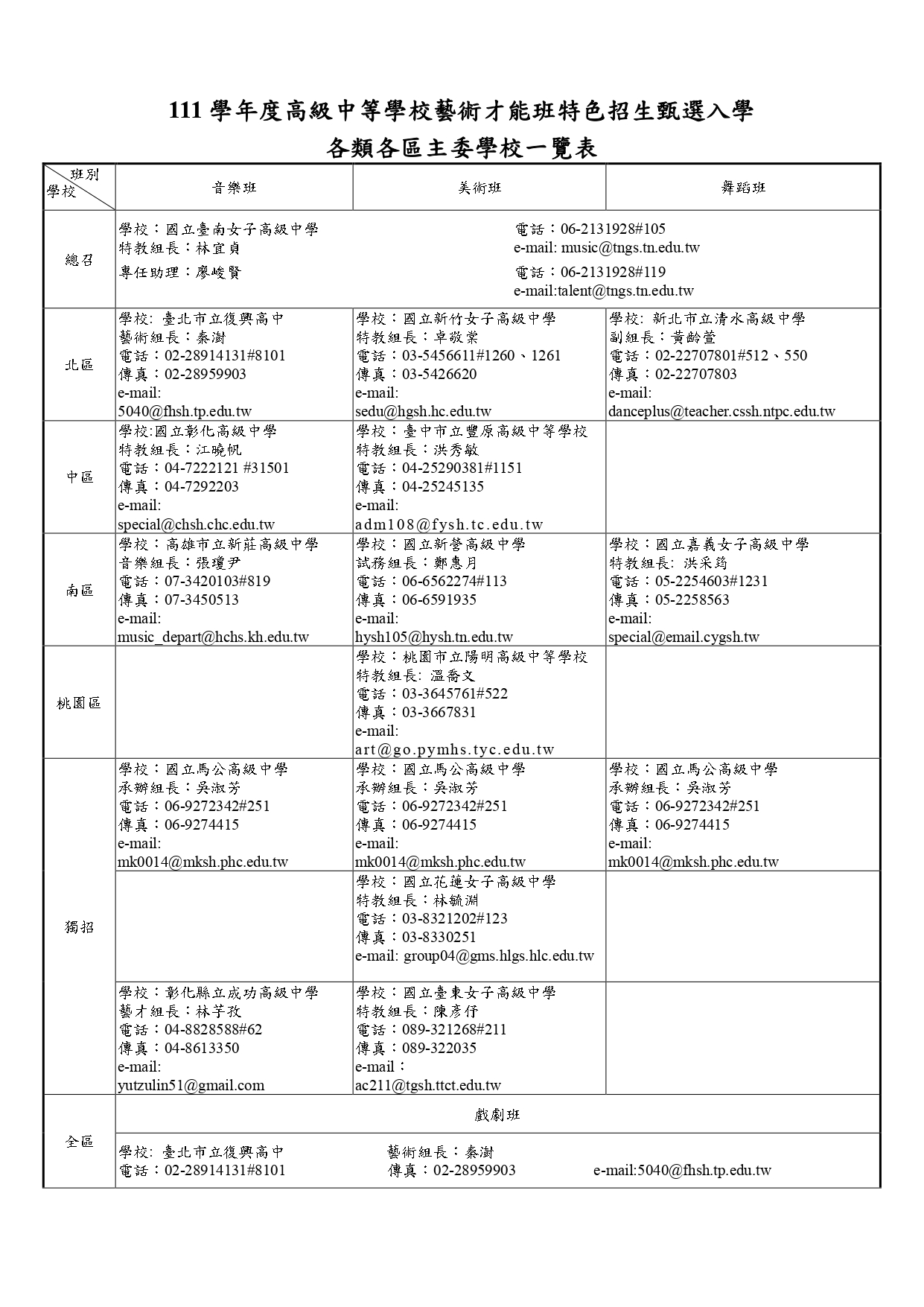 二、檢附「111學年度各類各區主委學校一覽表」1份,若有相關報名升學問題請逕洽各分區主委學校及獨招學校,相關簡章均可逕至