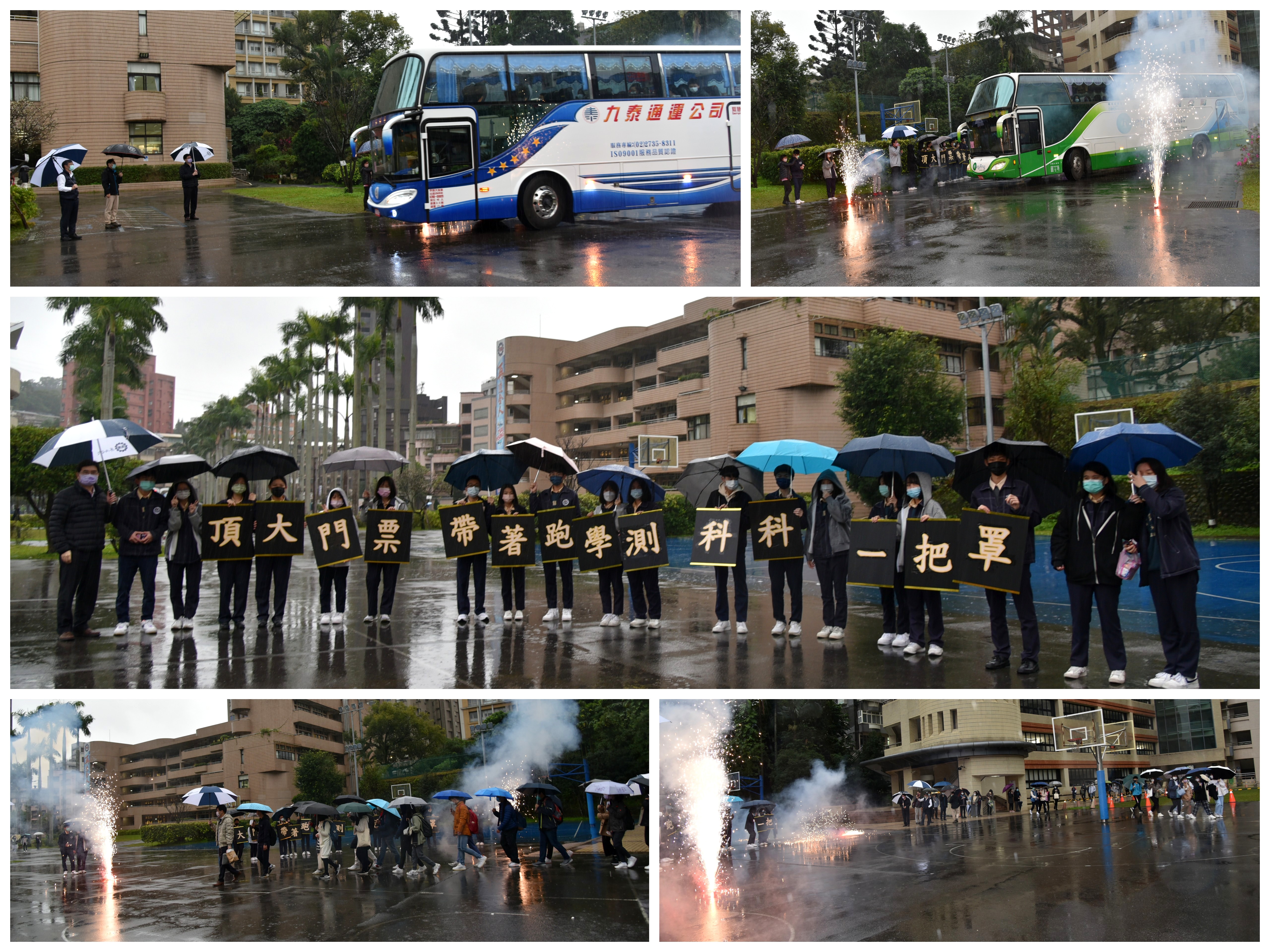 111年1月21日〜23日為高三應屆畢業生參加111年高中學科能力考試,本校班聯會特別為應考的學長姐們精心製作加油看板與放煙火(象徵著勝利之光),並於考試出發當日早上由柯文柔校長率領,與各處室主任齊聚椰林大道為高三考生壯行加油,衷心祝福每位考生考試順利。