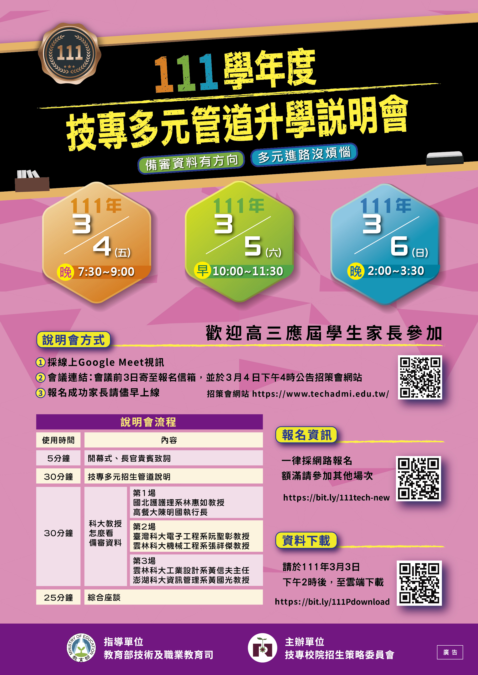 技專校院招生策略委員會舉辦111學年度技專多元管道升學說明會