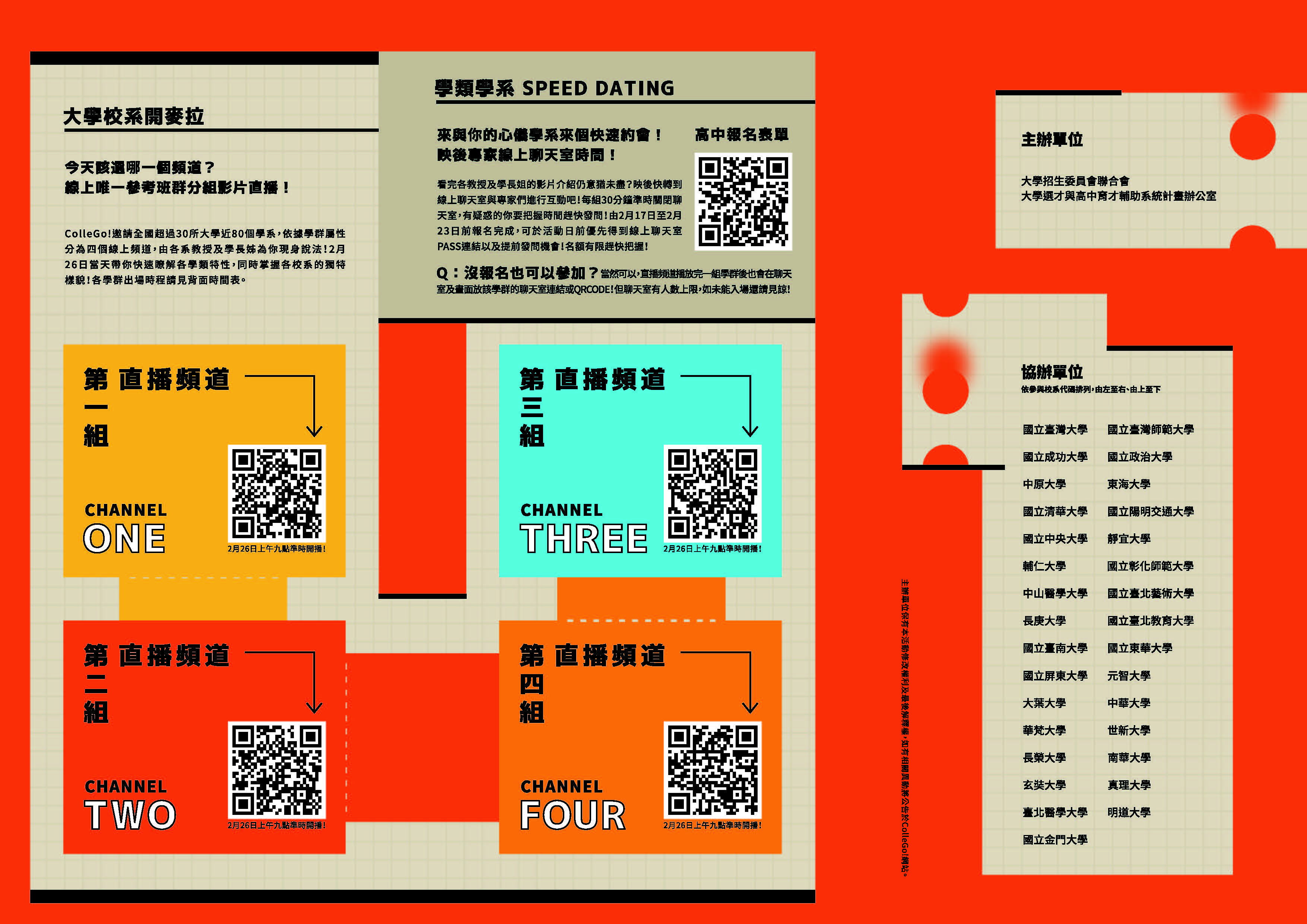 家長與學系來賓線上互動組成,並將依學群類型分為四個直播頻道同時播出,並以線上互動會