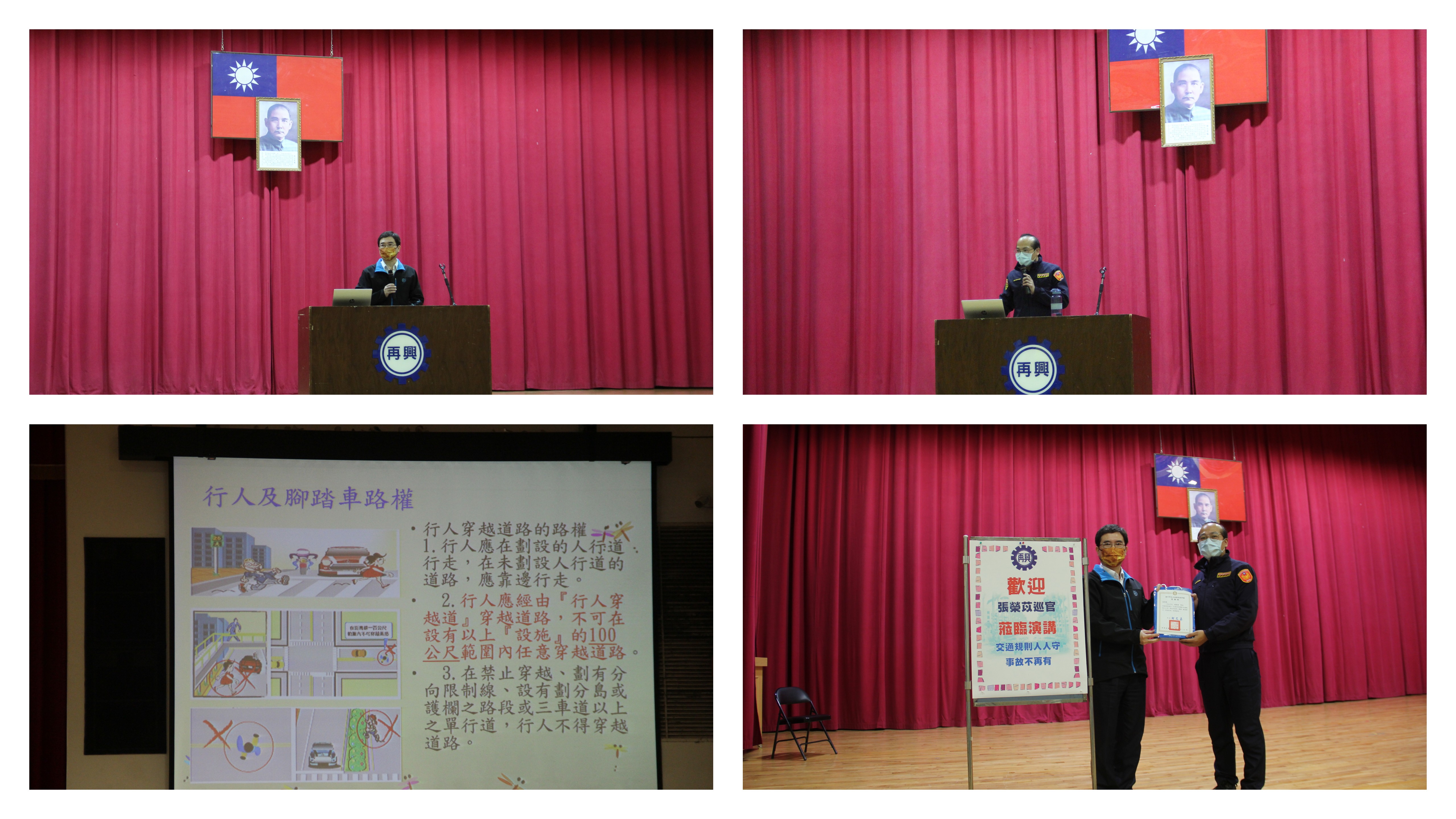 楊警員先以簡報方式介紹路權之相關基本認知,再輔以影片加深師生印象,此外,講授過程中楊警員透過自身專業能力與經驗,宣講交通安全相關注意事項,期能使師生了解路權及其他安全需注意事件,藉以增進對交通安全之警覺性,確保自身安全。