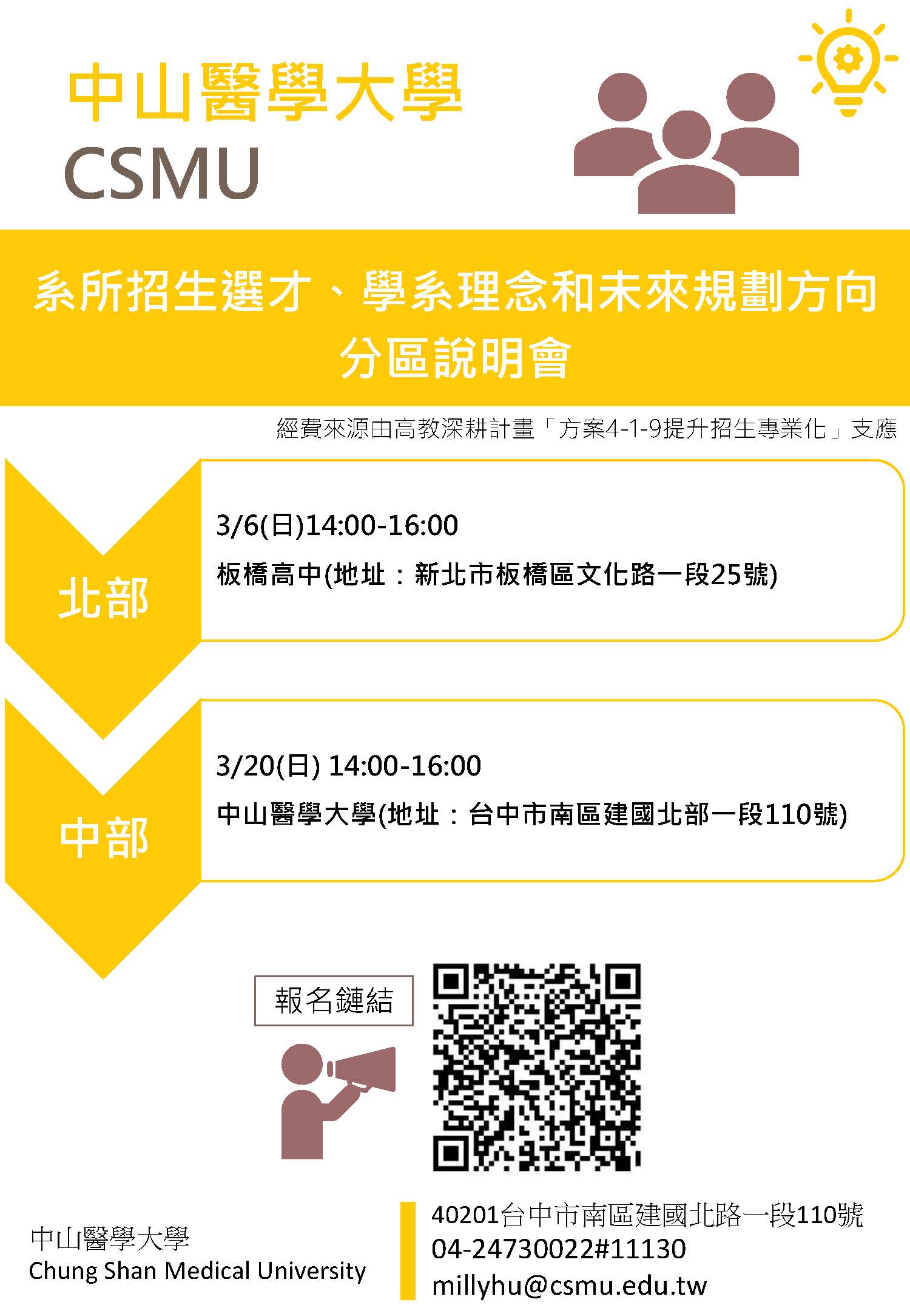 二、活動目的:為使家長和學生深入了解中山醫學大學各學系的教學理念和未來規劃方向,辦理分區說明會,