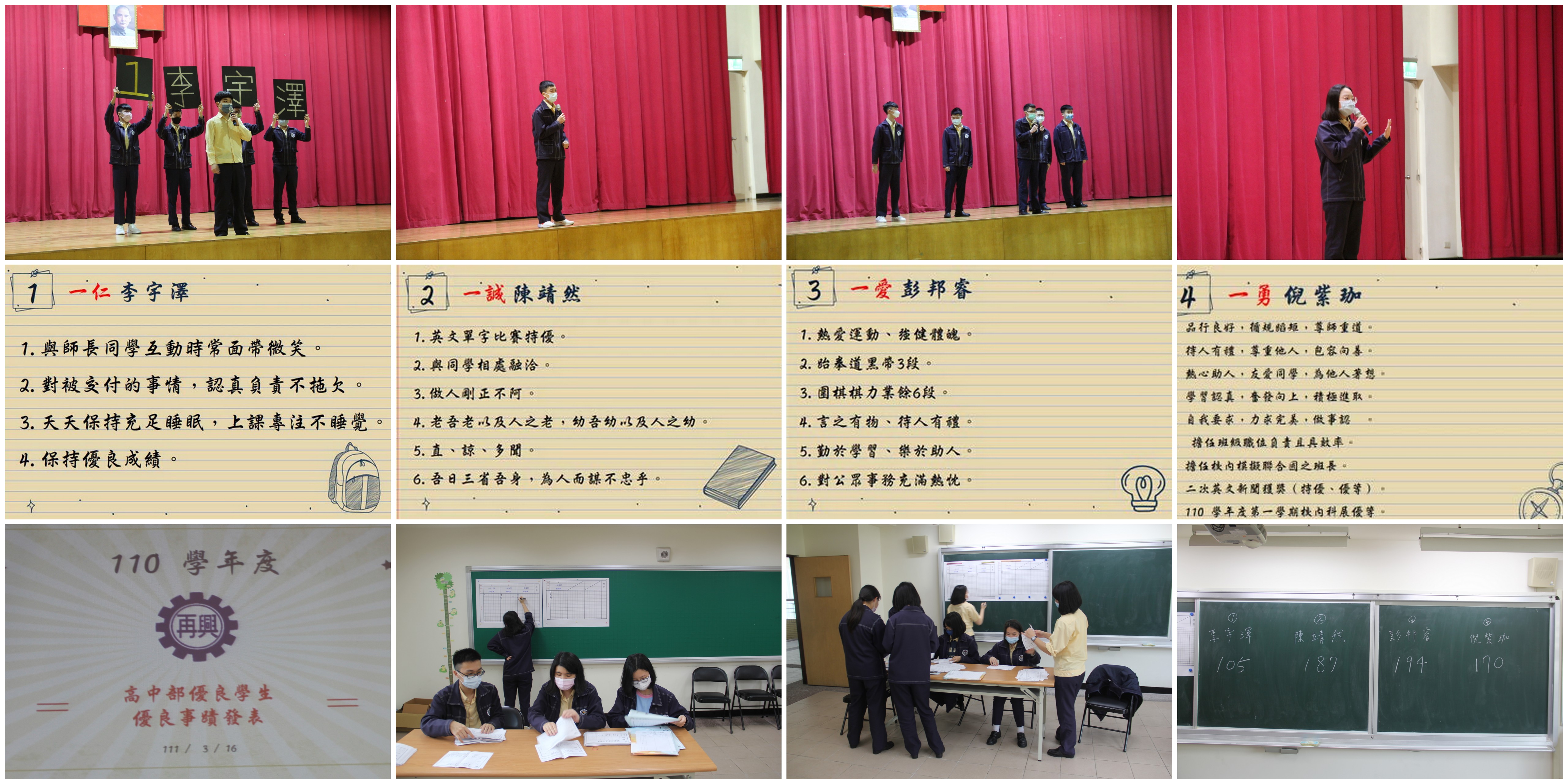 為配合臺北市教育局辦理臺北市110學年度全市優良學生選拔活動,本校高中部先於2月25日產生班級優良學生,各班級優良學生再依個人意願報名參加全校優良學生選舉後,3月16日(星期三)於週會時間辦理高中部候選人優良事蹟發表會,每位候選人在有限時間內展現個人特質,行銷自己。本學年計有高一仁李宇澤同學、高一誠陳靖然同學、高一愛彭邦睿同學、高一勇倪紫珈同學等4名同學參加競選。