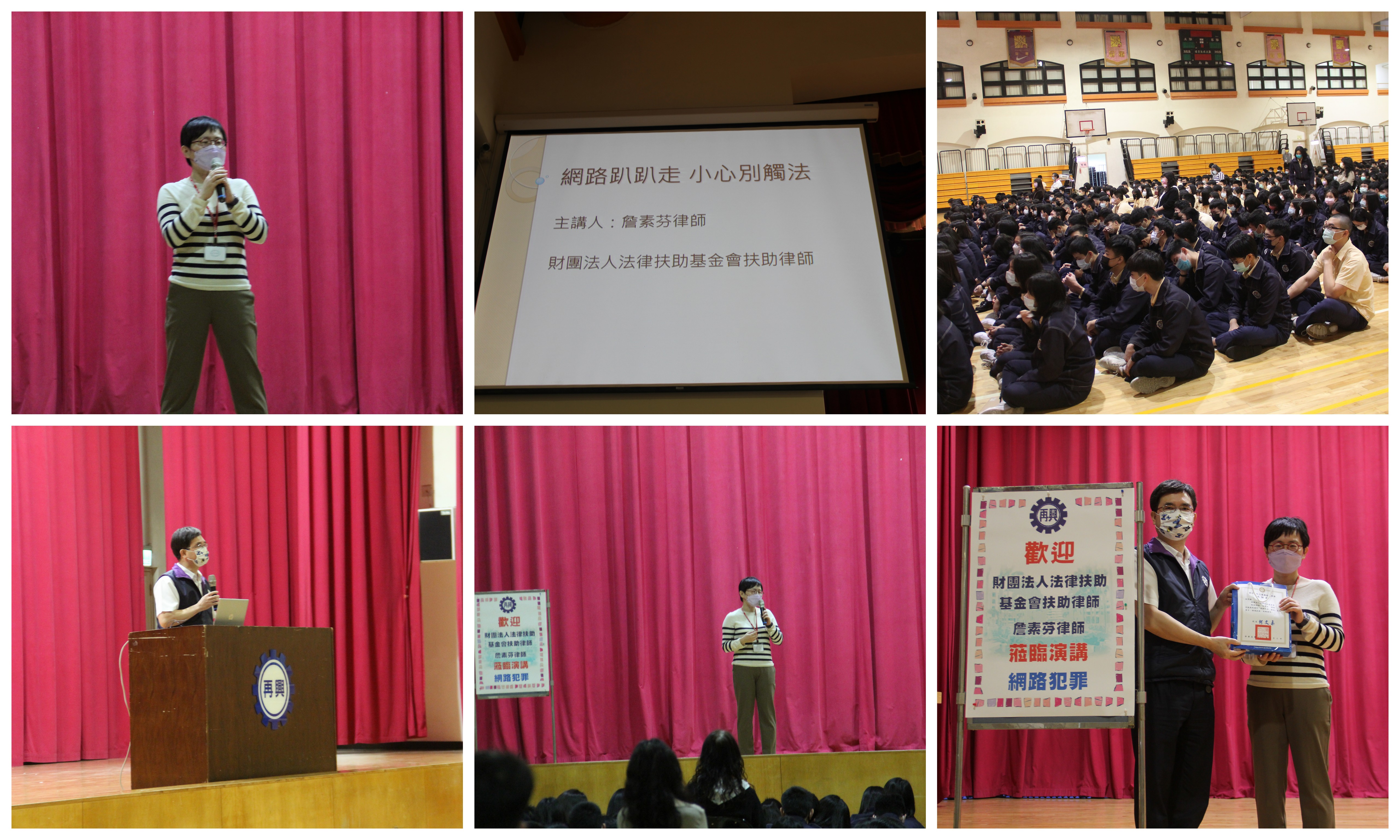 111年4月6日本次週會邀請詹素芬律師,演講主題網路犯罪,詹律師首先教導大家如何防範網路犯罪及詐欺,並說明相關的法律規定;透過詹律師舉例說明,同學們用心的聽講,雖然演講時間只有短短幾十分鐘,卻讓我們對網路犯罪有一些的認知。