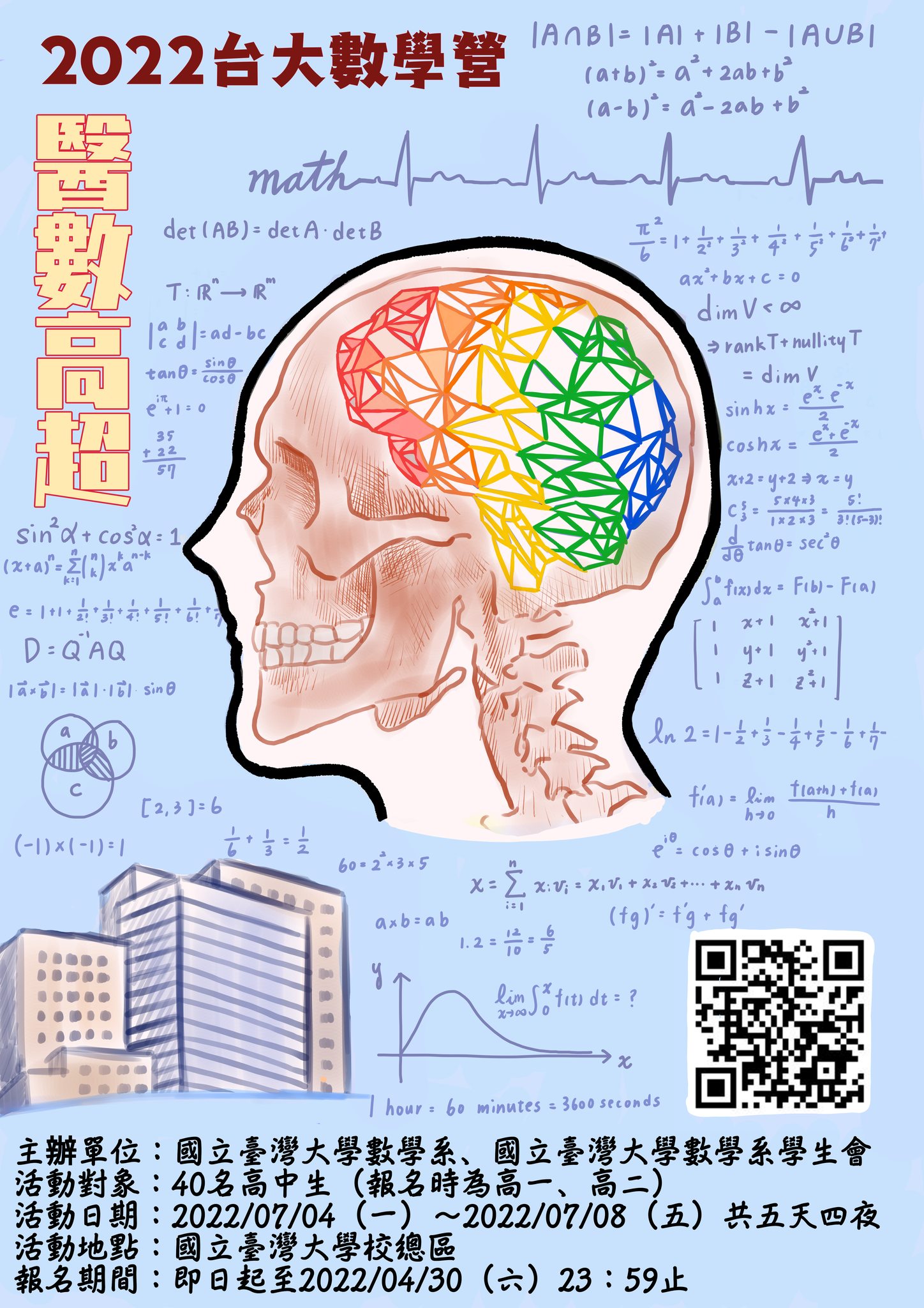 「2022台大數學營」的主要目的是介紹進階數學的基本題材,及其在現代自然科學、工程、醫學與資訊科學等各方面的應用。期盼學員們在這活動中學習到更深入的數學題材,引發學生對數學的興趣,並在未來從事數理方面的研究或將數學應用於各個專業領域。此次營隊的主題是介紹數學在醫學資科分析的應用,包含高維度資料的降維及分類、如何判讀心電圖、腦波圖等,在課程中亦將會介紹線性代數和微積分的相關知識來探索相關的問題。歡迎對數學理論及其應用有興趣的高中同學們報名喔!