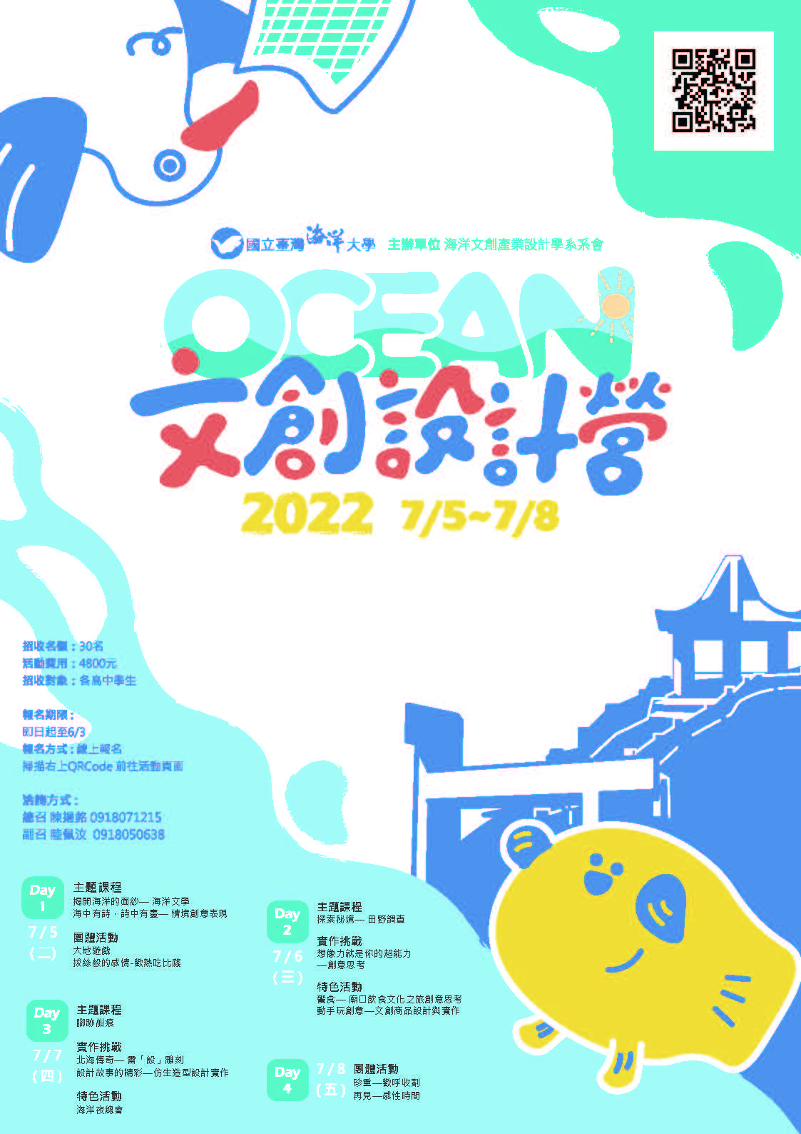 一、本校海洋文創設計產業學士學位學程辦理「2022海洋文創設計營」暑期營隊,活動辦理時間:111年7月5日~7月8日。